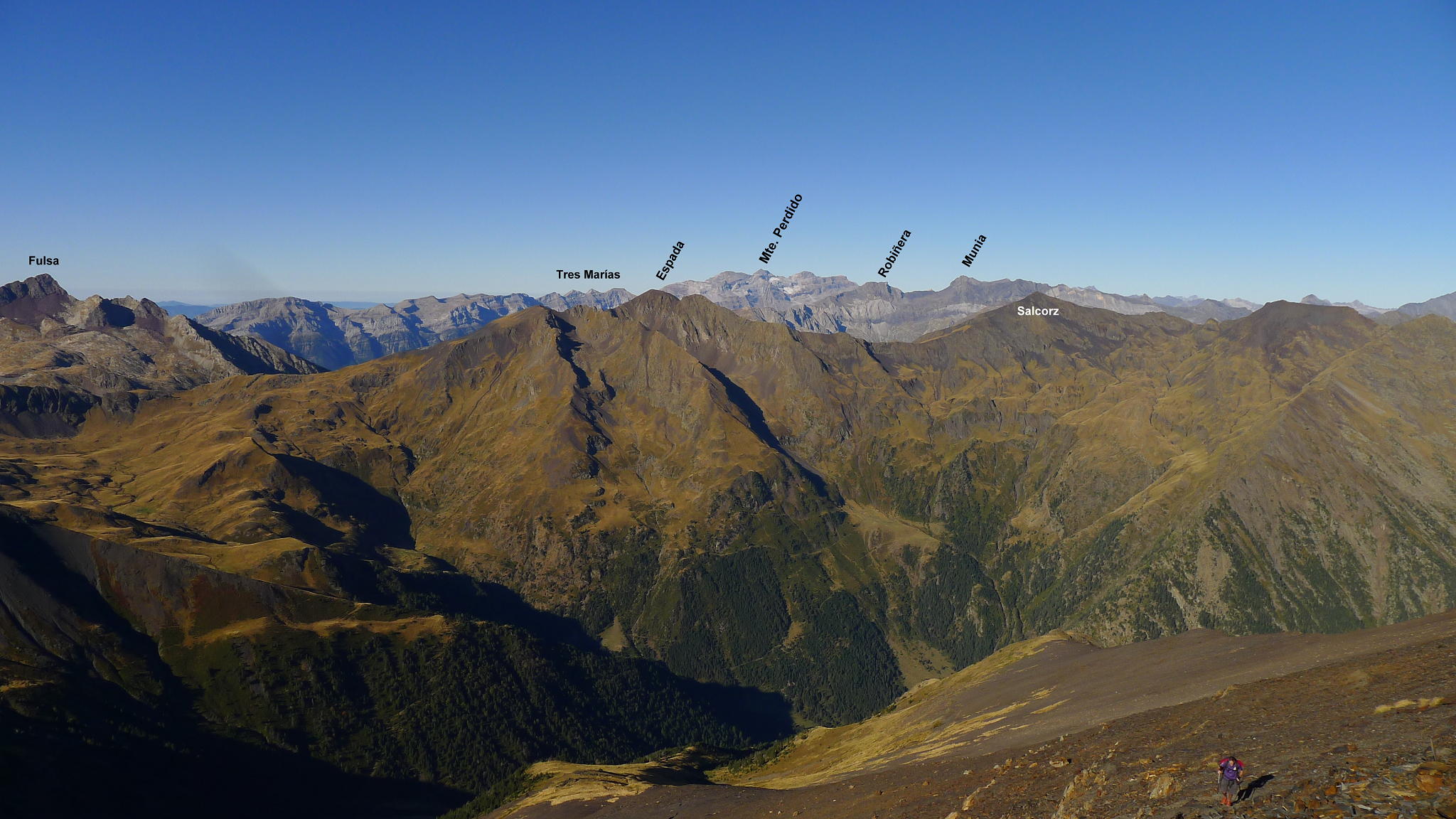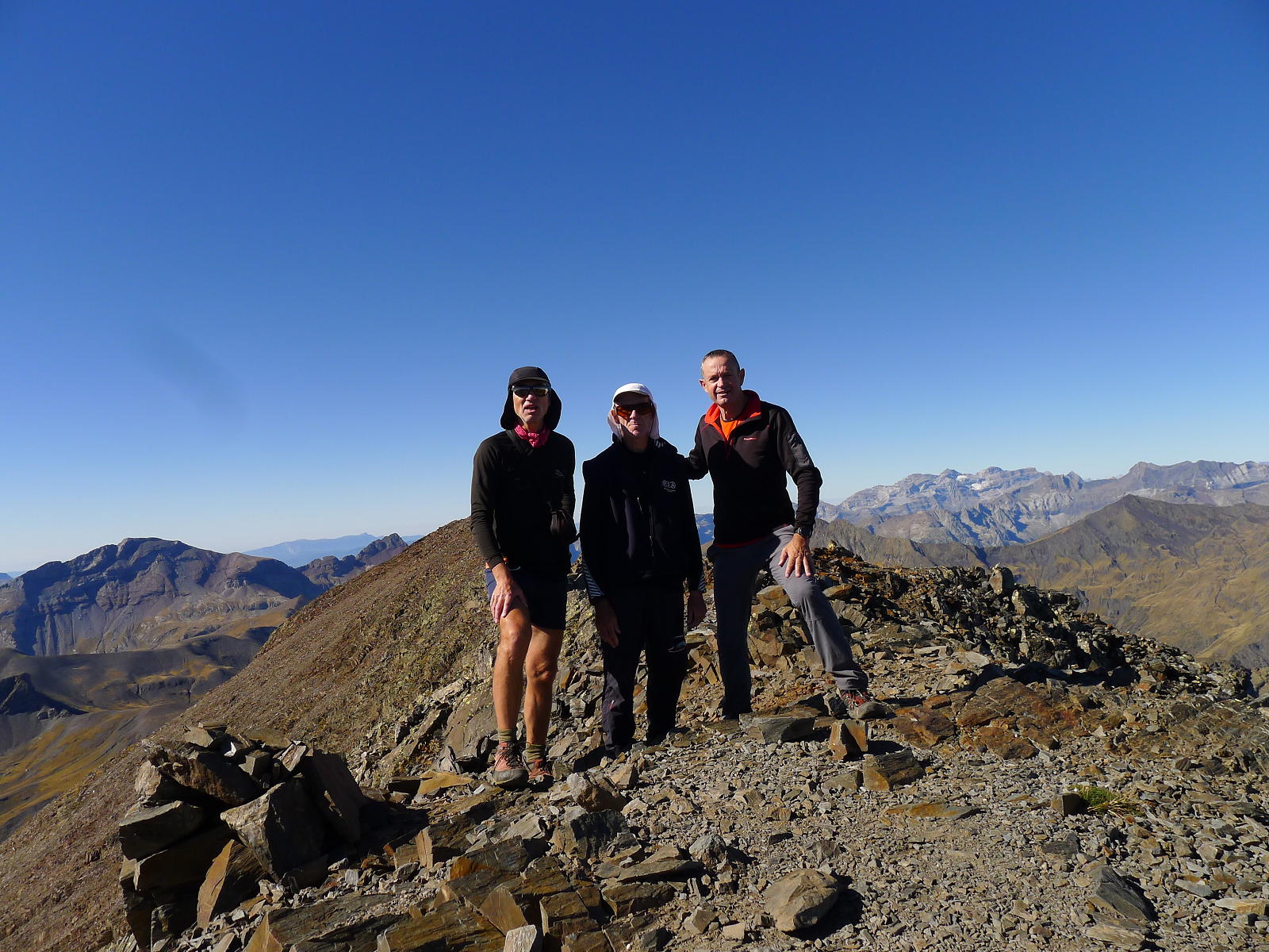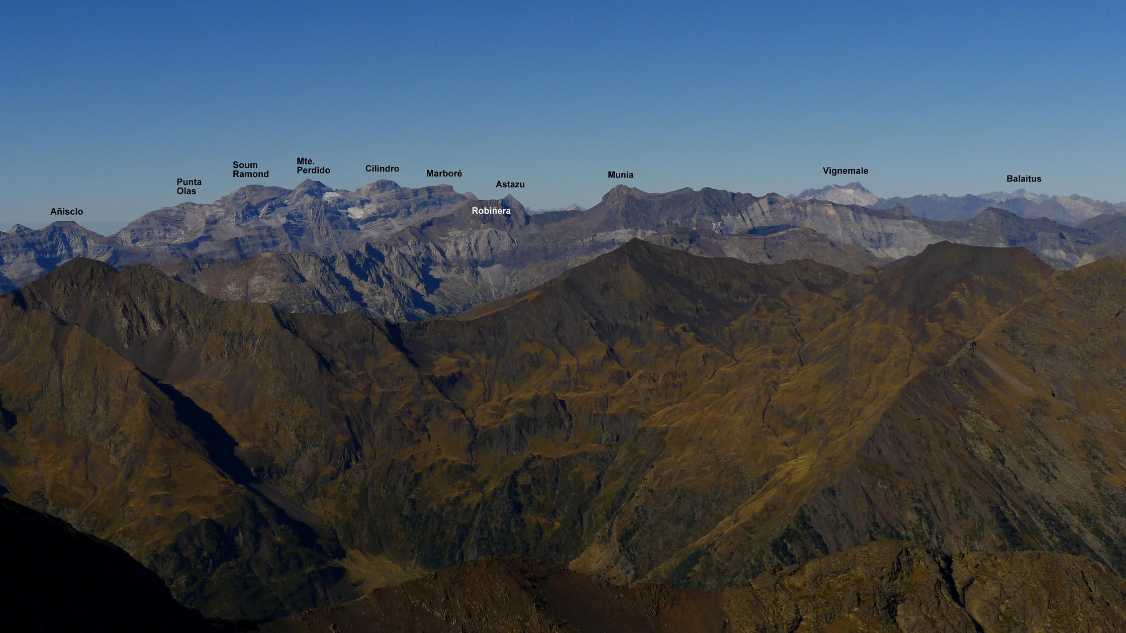 No es una cima solitaria como las que estoy acostumbrado a hacer, pero tampoco está abarrotada. Nos cruzamos con 4 o 5 grupos de montañeros. Las vistas son fabulosas, desde Suelza, al sur, el macizo de Monte Perdido, Neouvielle, Midi de Bigorre, Bachimala, Posets y Espadas, terminando con Cotiella, todo un espectáculo de tresmiles.