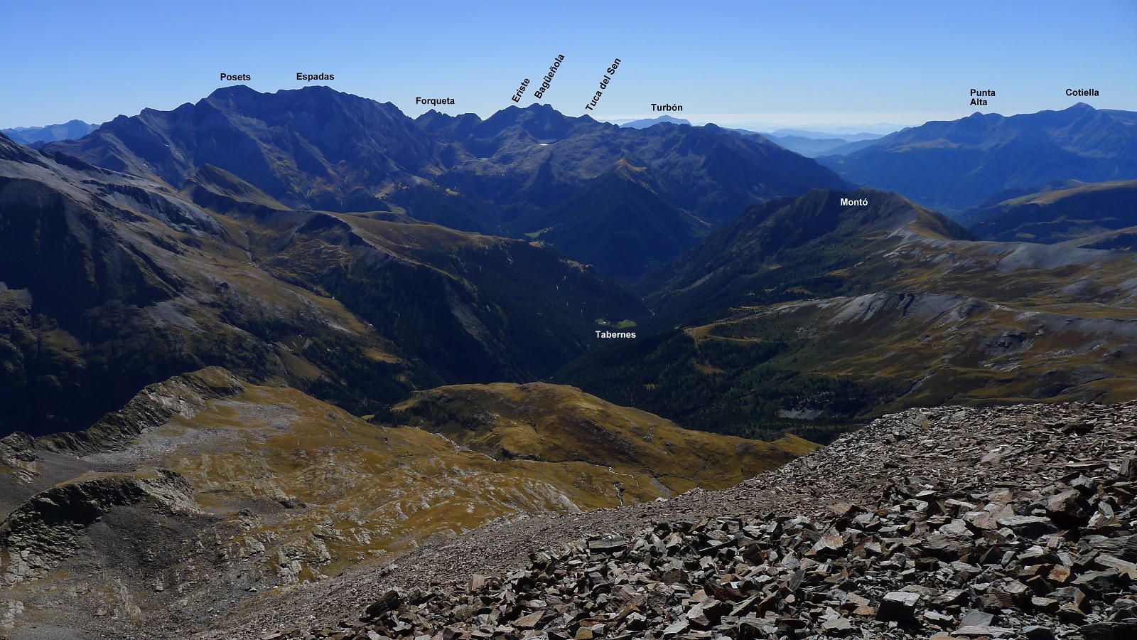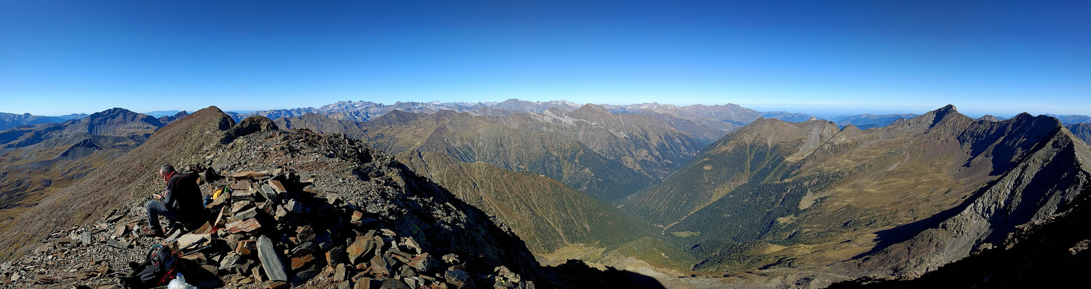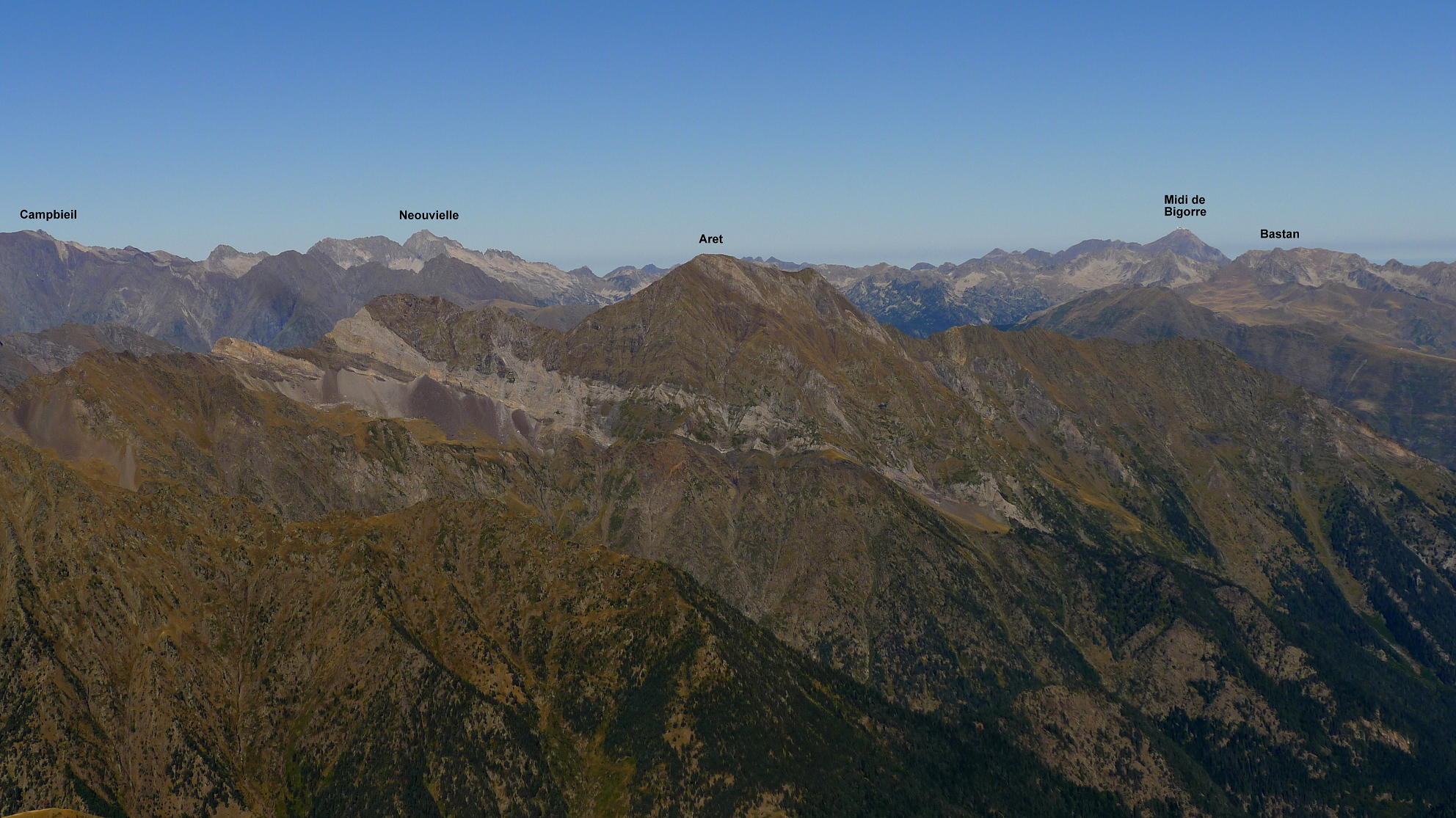 No es una cima solitaria como las que estoy acostumbrado a hacer, pero tampoco está abarrotada. Nos cruzamos con 4 o 5 grupos de montañeros. Las vistas son fabulosas, desde Suelza, al sur, el macizo de Monte Perdido, Neouvielle, Midi de Bigorre, Bachimala, Posets y Espadas, terminando con Cotiella, todo un espectáculo de tresmiles.