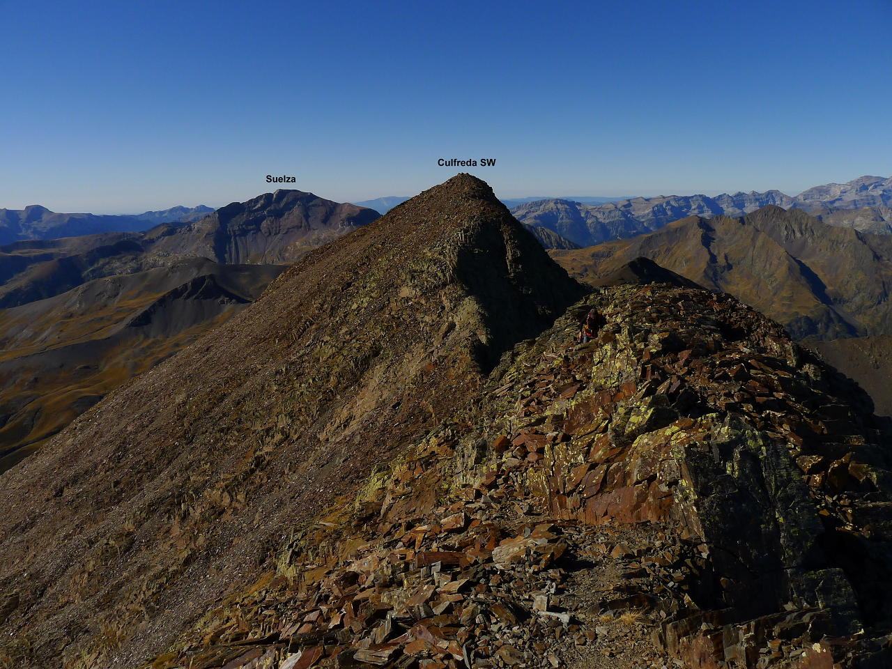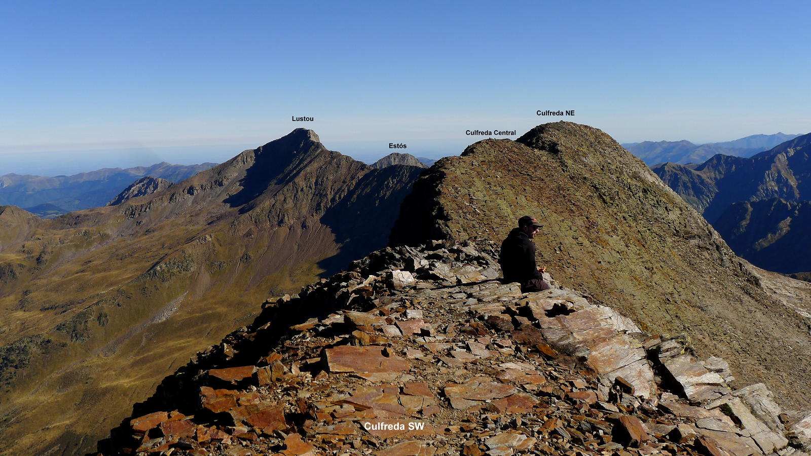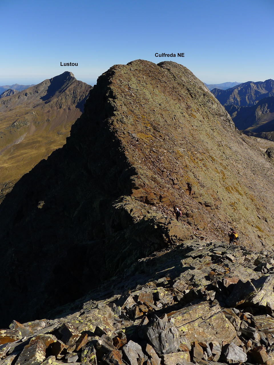La cresta no presenta demasiada resistencia, es cuestión de coger el ritmo adecuado. Hay algún tramo en que los hitos nos llevan por la derecha, pero tampoco hay problemas en seguir el filo. De vez en cuando hay que echar las manos, pero la dificultad es Iº o, como mucho, I+. Alcanzamos el Culfreda SW (3031m 3h16′). Nos queda un tramo de unos 250m de distancia horizontal pero siempre con las mismas características hasta el Culfreda Central (3027m 3h37′) y tan solo otros 25-30m al Culfreda NE (3032m 3h43′). Nos acercamos hasta el siguiente hombro para echarle un vistazo al Paso Baliner, que debe ser el punto clave en la cresta que continúa hacia el Lustou, pero eso es otra historia.