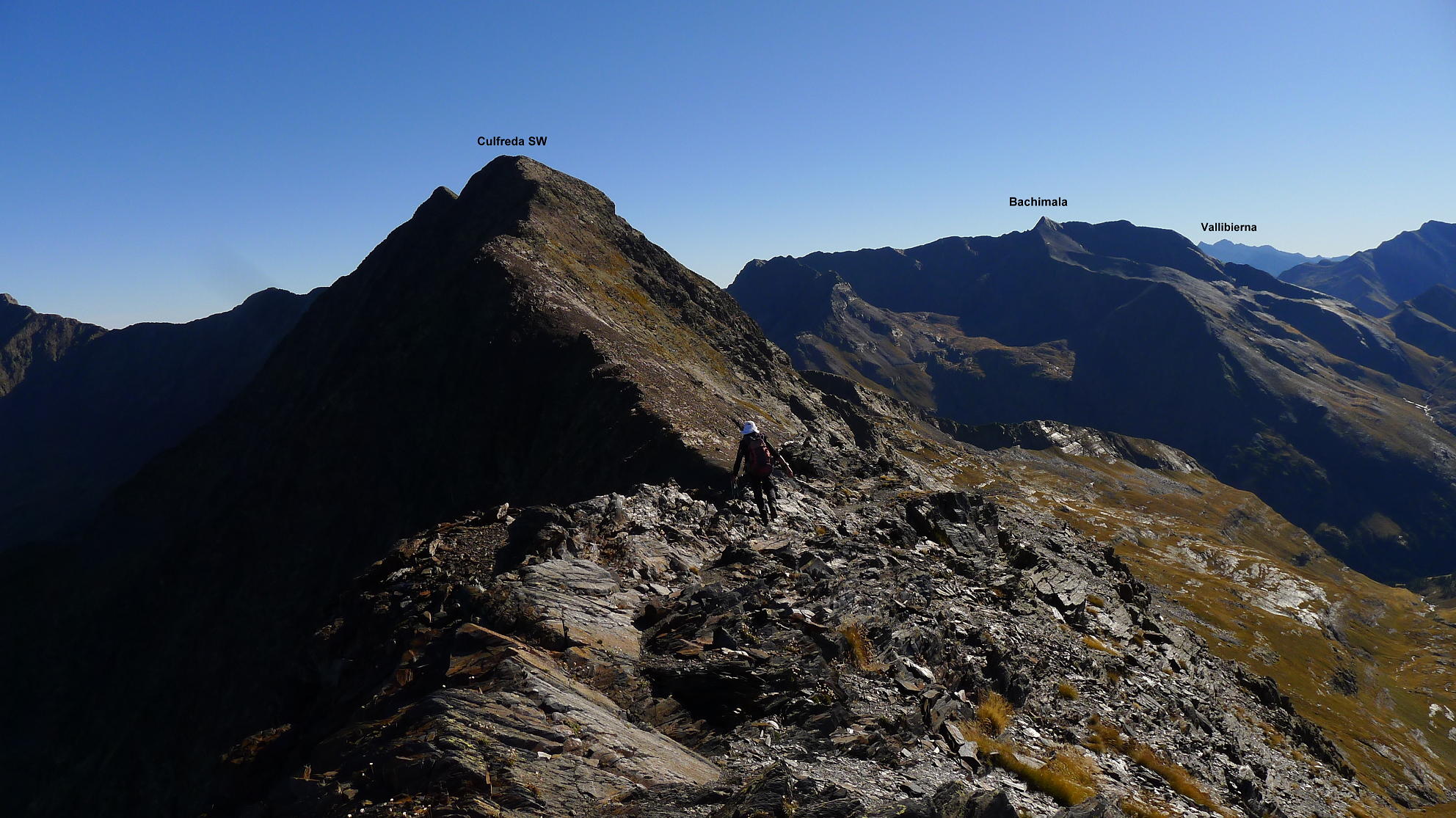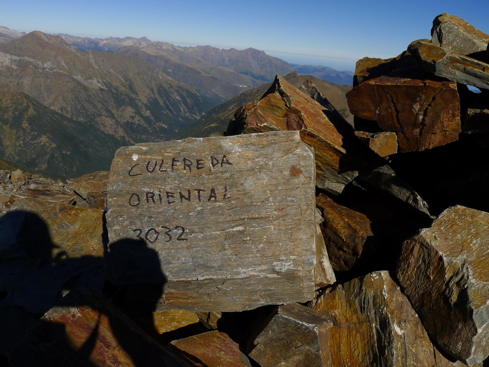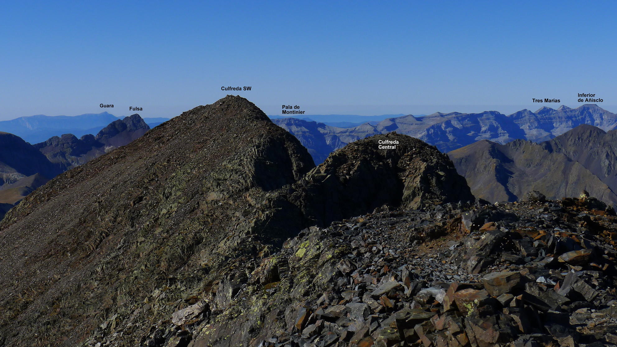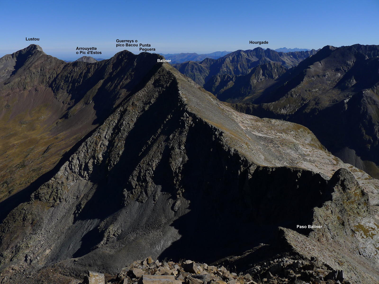 La cresta no presenta demasiada resistencia, es cuestión de coger el ritmo adecuado. Hay algún tramo en que los hitos nos llevan por la derecha, pero tampoco hay problemas en seguir el filo. De vez en cuando hay que echar las manos, pero la dificultad es Iº o, como mucho, I+. Alcanzamos el Culfreda SW (3031m 3h16′). Nos queda un tramo de unos 250m de distancia horizontal pero siempre con las mismas características hasta el Culfreda Central (3027m 3h37′) y tan solo otros 25-30m al Culfreda NE (3032m 3h43′). Nos acercamos hasta el siguiente hombro para echarle un vistazo al Paso Baliner, que debe ser el punto clave en la cresta que continúa hacia el Lustou, pero eso es otra historia.