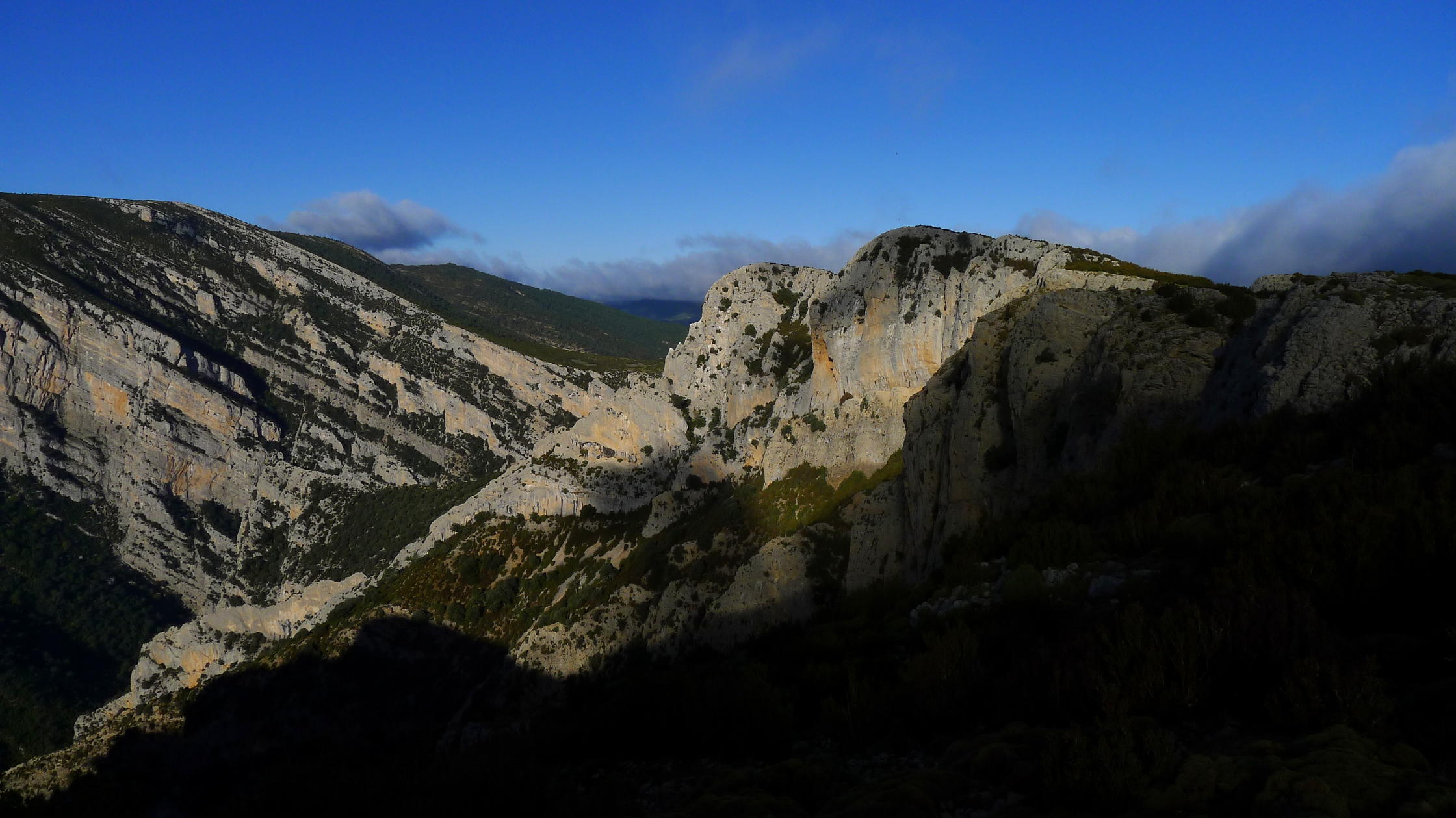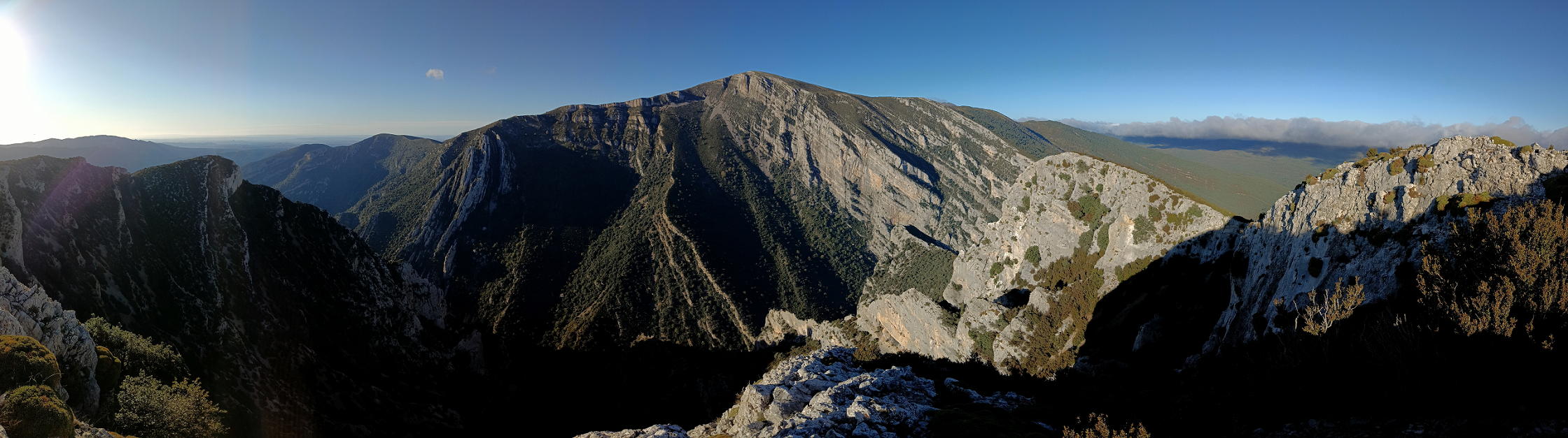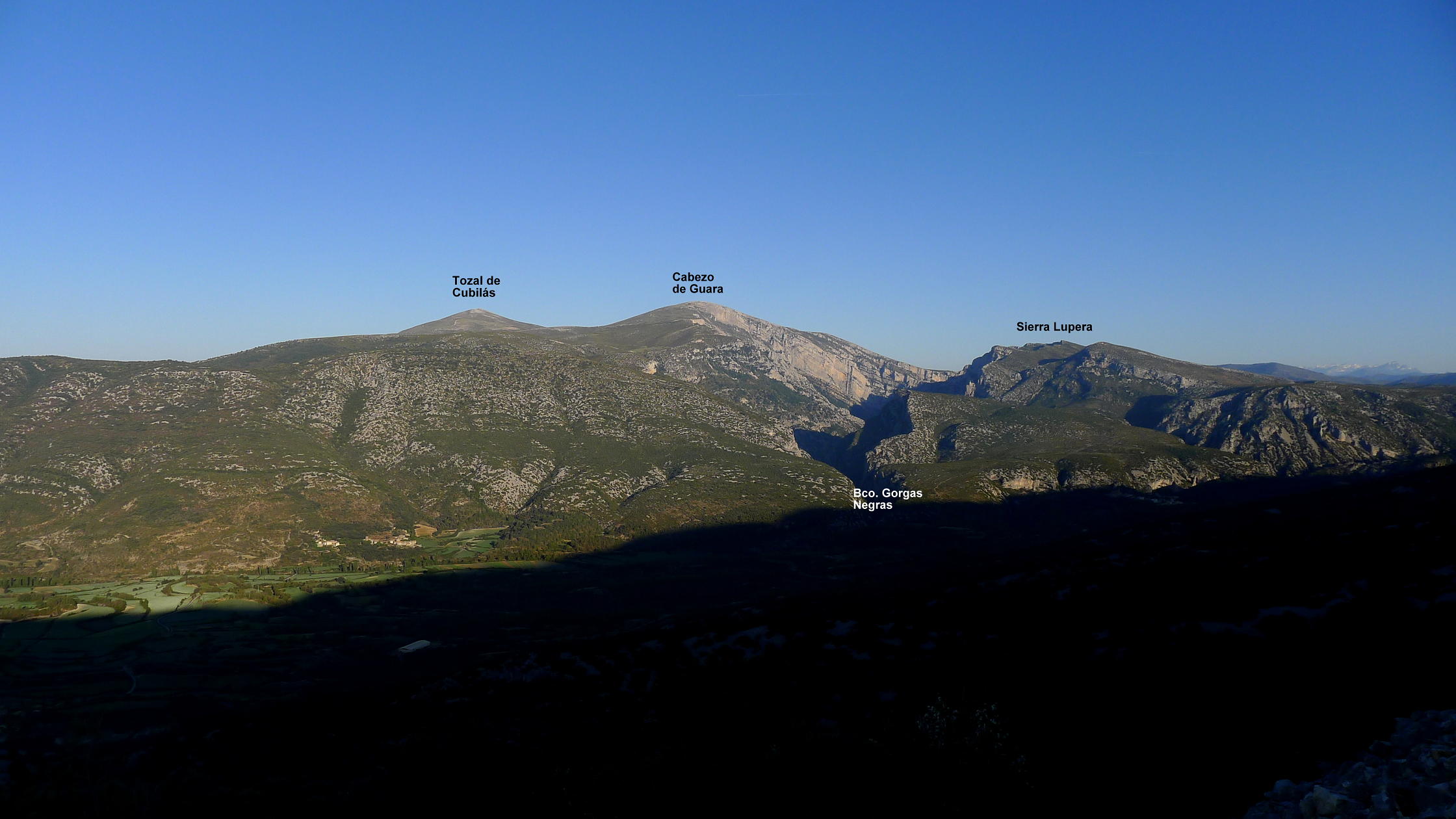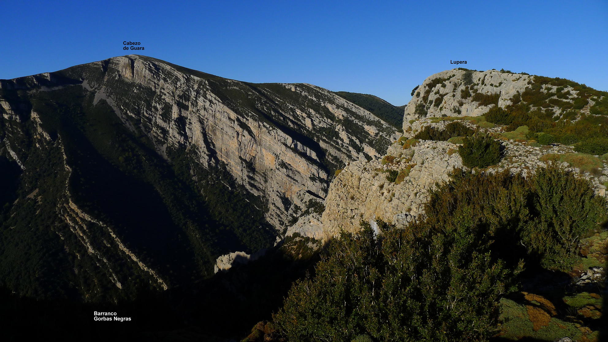 Fresco día otoñal, intercalado entre dos borrascas, que aprovecho para una interesante excursión en la Sierra de Guara. La Sierra Lupera se alza al NE del río Alcanadre, sobre el espectacular tramo del cañón de Gorgas Negras. Parte del recorrido discurre por el GR-1 y está perfectamente señalizado, el resto por sendas balizadas con hitos y una pequeña parte, el acceso a Peña Ruaba, fuera de senda entre erizones.