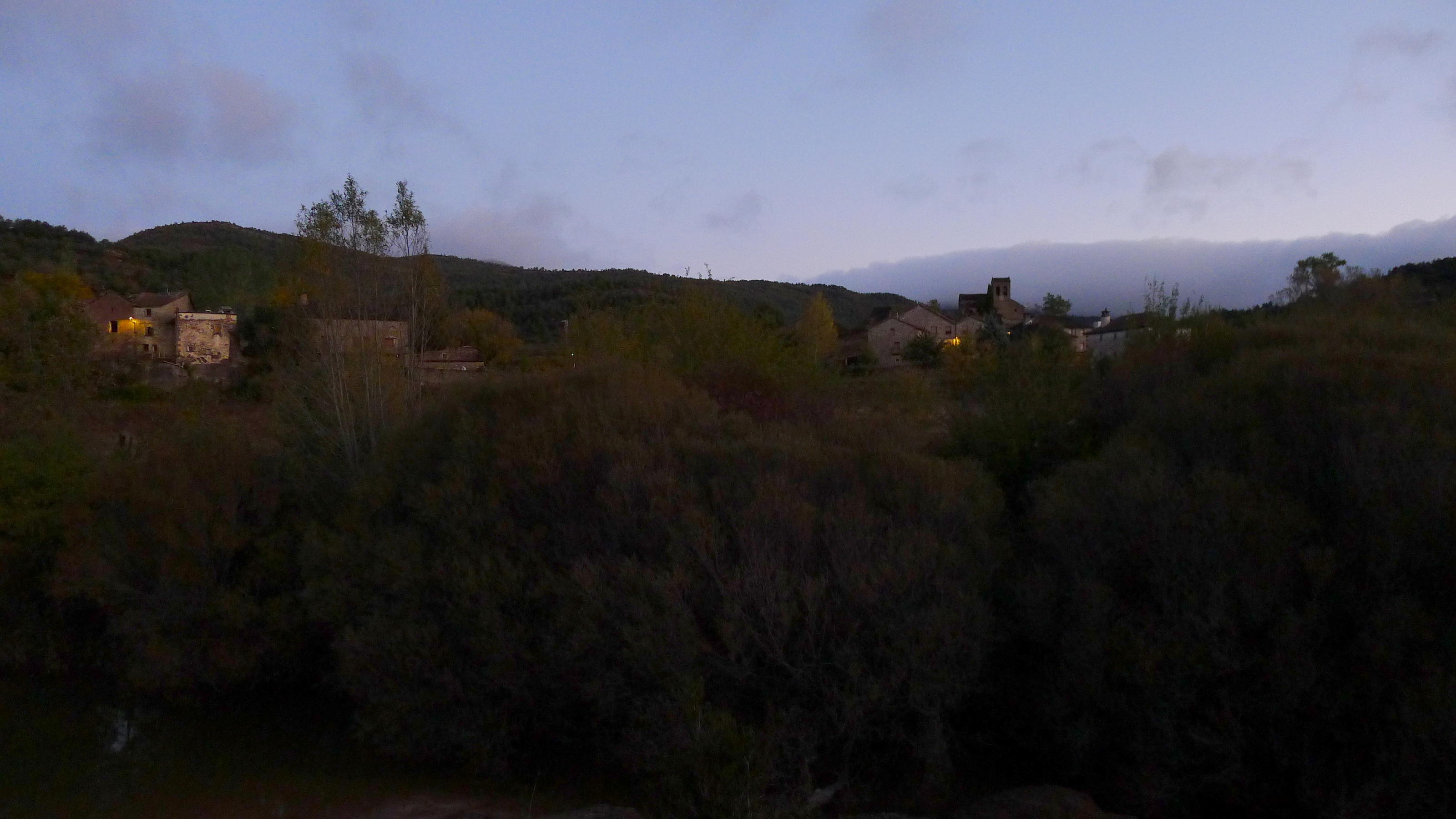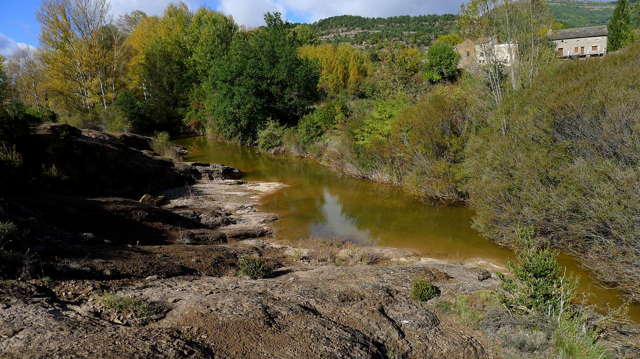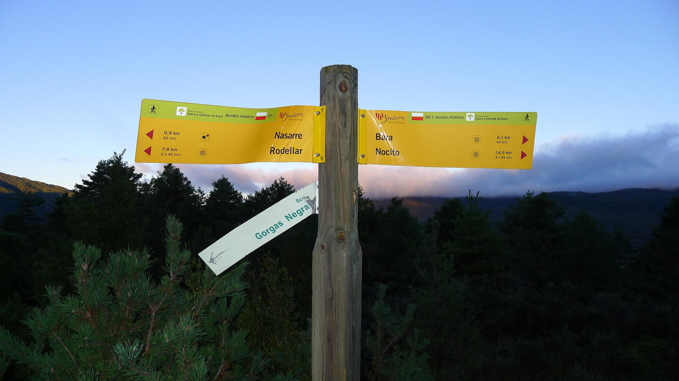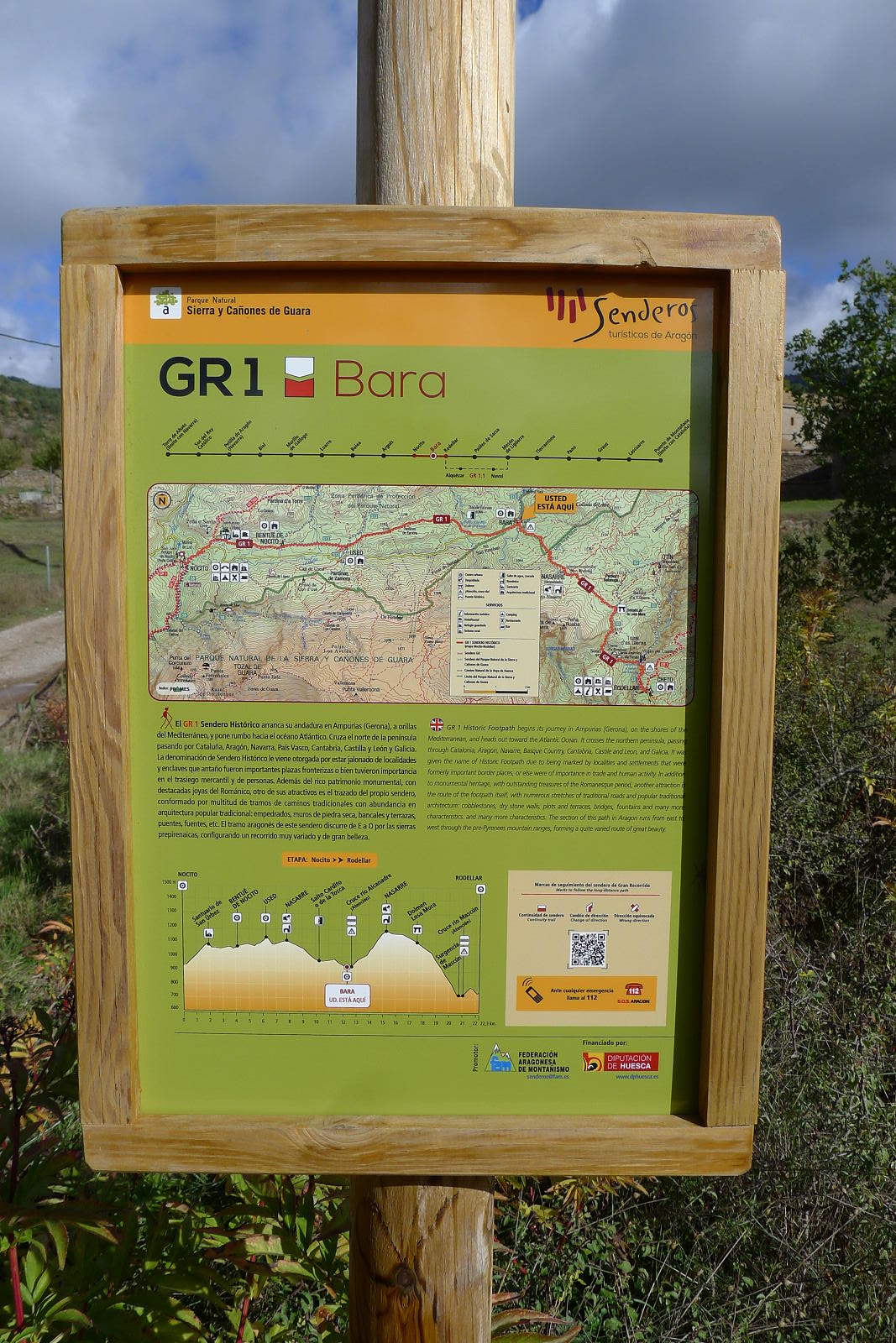 Descripción de la ruta: Al entrar en Bara hay una zona de aparcamiento (930m). Sigo las señales roja y blanca del GR-1 por el pueblo para salir por una senda entre muros de piedra que desemboca en el río Alcanadre. Hasta aquí me vienen siguiendo dos gatos. A veces nos ha seguido algún perro, pero nunca gatos. Atravesar el río puede ser problemático dependiendo del caudal y, aunque ayer llovió bastante, lo puedo pasar metiendo un poco la bota en el agua. El GR está bien marcado con pintura nueva. Asciende suavemente por zonas más rocosas y luego por pinar.