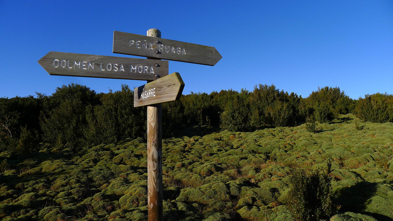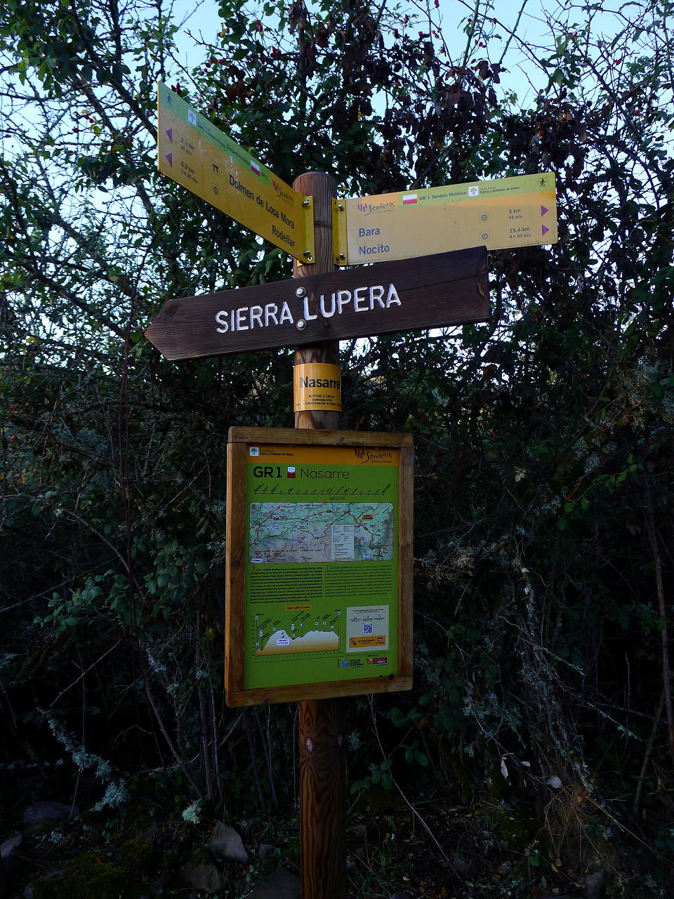 Un desvío señalizado los sigo a la izquierda (1105m 0h40′), a la derecha va hacia el barranco de Gorgas Negras. Más adelante llego al pueblo abandonado de Nasarre (1190m 0h50′). Abandono el GR siguiendo el cartel que indica Sierra Lupera. Salgo por unos prados en los que hay caballos; la senda se difumina por el prado pero luego es una trocha bien trazada entre erizones. Después es más pedregosa y se introduce en un pasillo de bojes. Un cartel indica a la izquierda (1215m 1h05′). La senda se introduce en una vaguada y va girando hacia la izquierda hasta un hombro donde gira a la derecha y toma un lomo NE que sale de la Sierra Lupera.