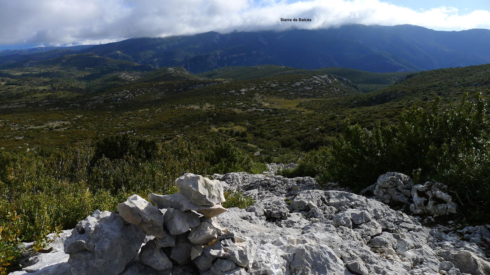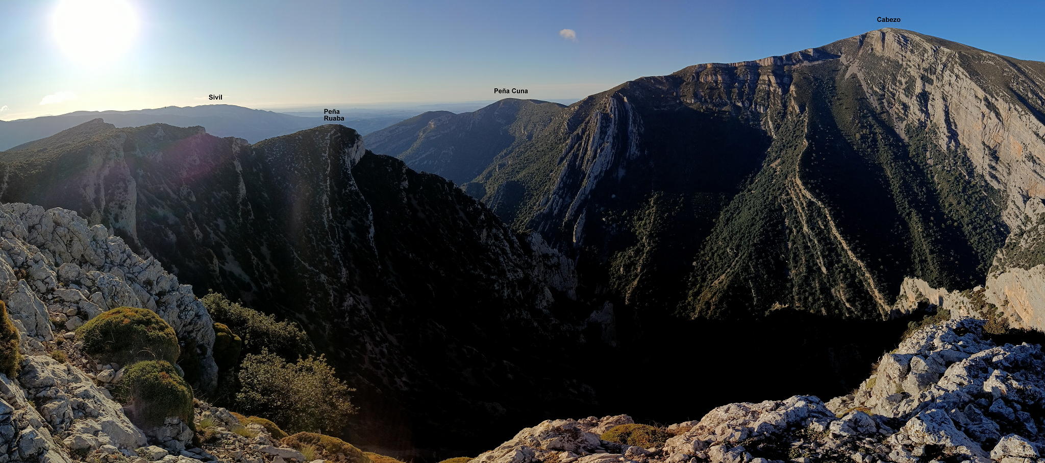 Por el lomo, con senda pedregosa, se pueden seguir hitos. Bifurcación (1410m 1h29′) en lo alto del lomo que tomo a la derecha con cartel que indica Peña Ruaba (a la izquierda indica dolmen). La senda se asoma al impresionante cortado y sube, tras un casi inapreciable collado (1430m) hasta la cima de Lupera (1466m 1h40′). Asomarse al profundo cañón de Gorgas Negras da vértigo.