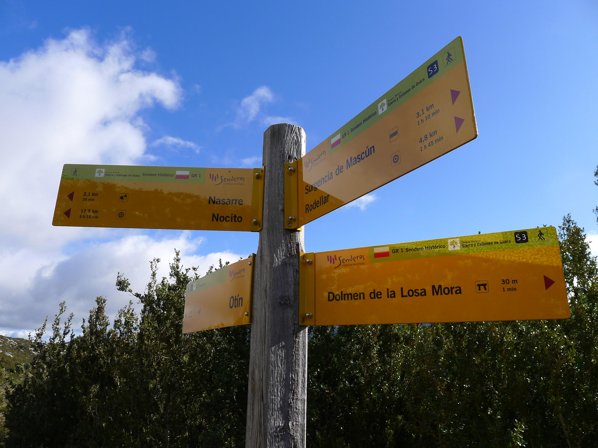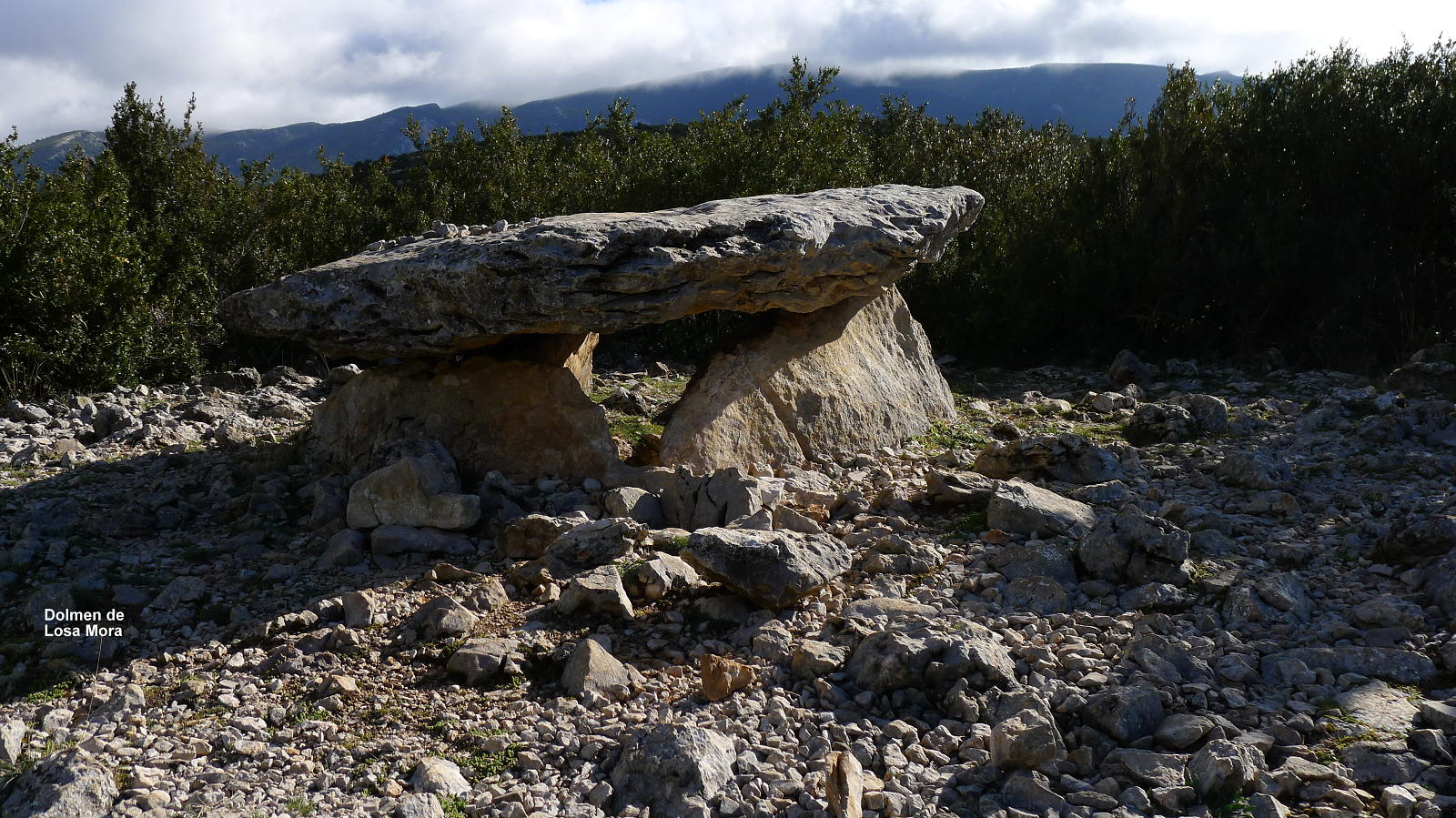 Regreso hasta entroncar con el camino en el cartel que indica al dolmen (1410m 2h37′). Tomo esta dirección por un camino con hitos avanzando por la vaguada que forma un barranquillo en suave descenso que me lleva otra vez al GR-1 (1145m 3h01′). Hacia la derecha desciendo por el barranco Losamora para llegar al dolmen Losa Mora (1105m 3h08′). Desde aquí el GR-1 continúa a la derecha a Rodellar y un camino a la izquierda a Otín.
