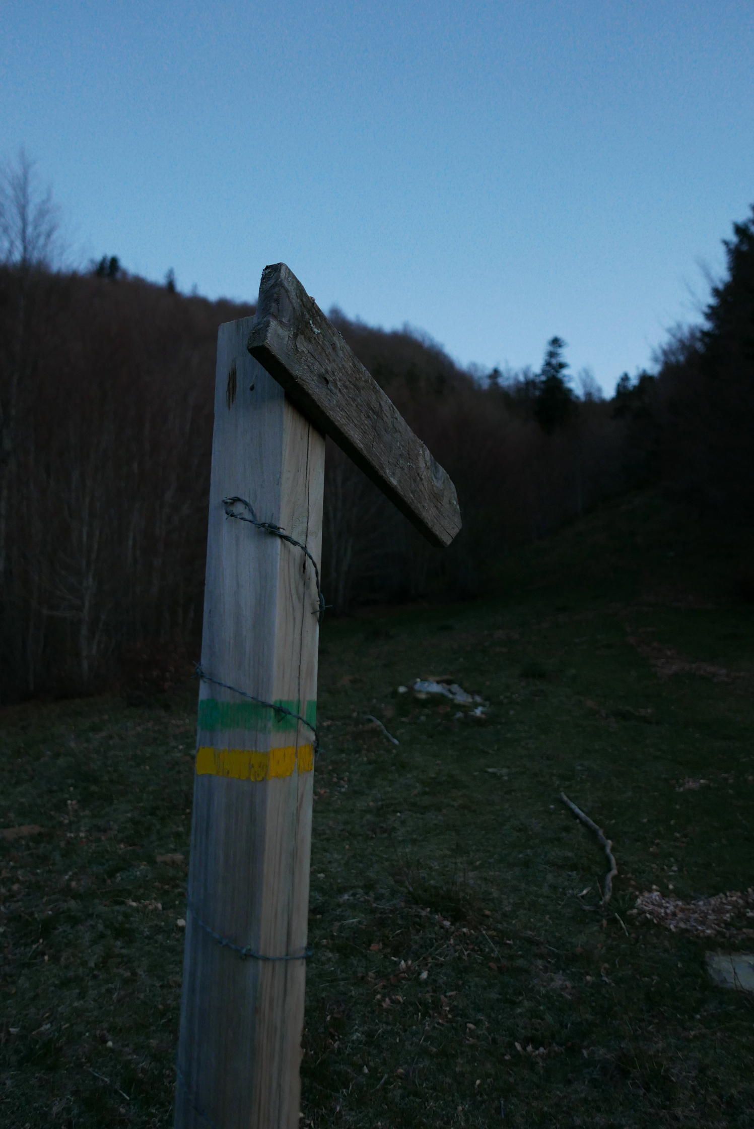 Descripción de la ruta: Refugio de LInza (1340m). Hay dos vías de ascenso, una que sube por detrás del refugio al collado Aztaparreta (según una reseña este camino es bueno al principio pero se pierde después) y otra más directa que voy a seguir. Tengo que descender unos 250m por la carretera y a mi derecha, antes del primer barranco, hay un prado en el que veo un cartel indicador un poco más arriba. El cartel de madera tiene las marcas de pintura verde y amarilla que me van a guiar y con letras poco marcadas pone Maz. Desde aquí se distingue claramente la senda que se introduce en el hayedo y, siempre con fuerte pendiente, se puede seguir sin problemas, con sus indicaciones de pintura y con hitos.