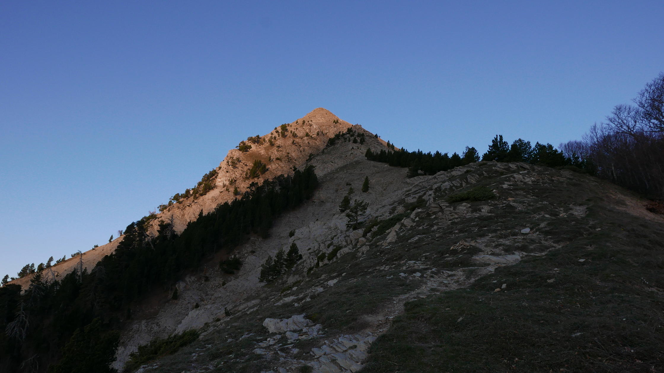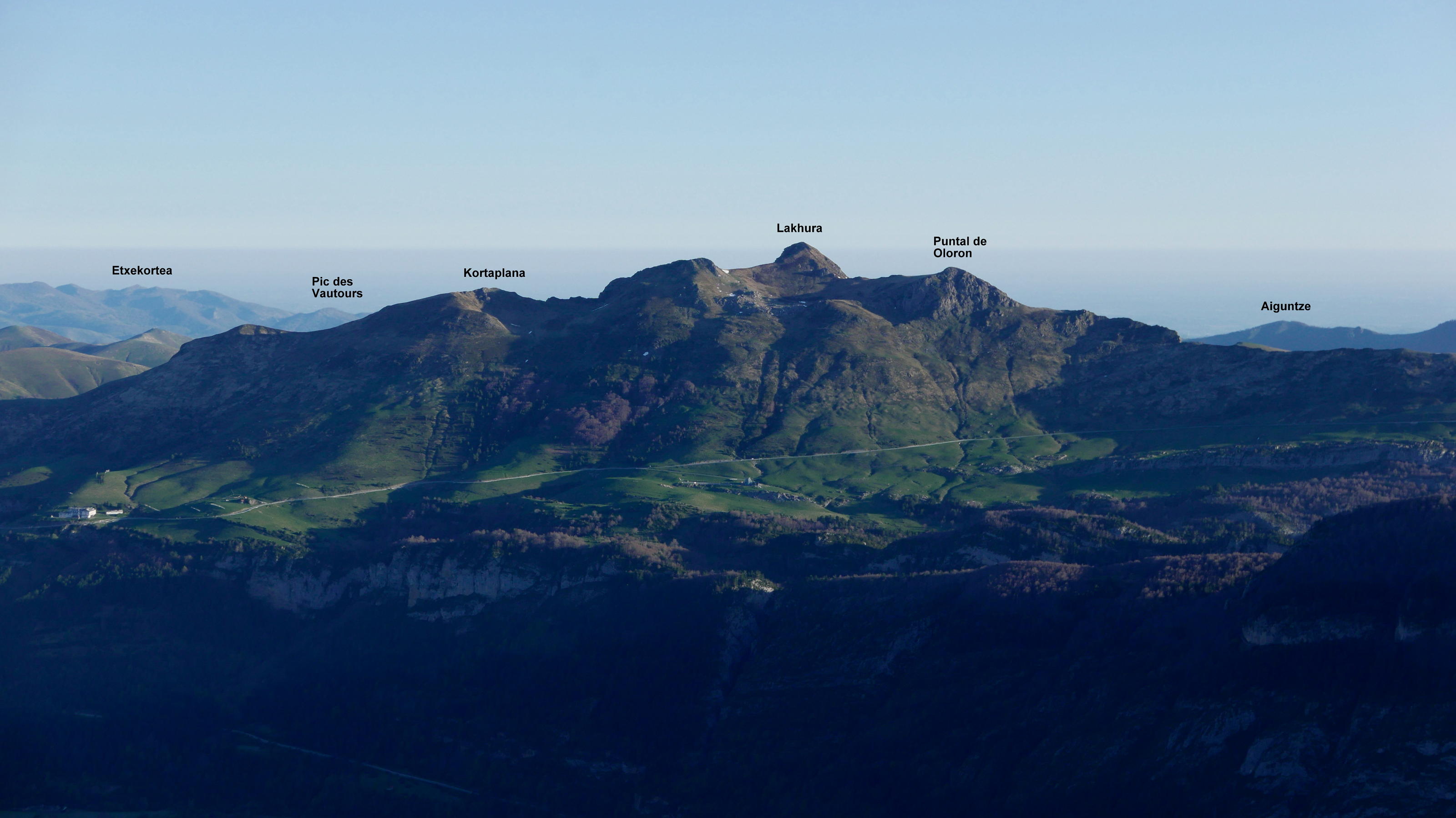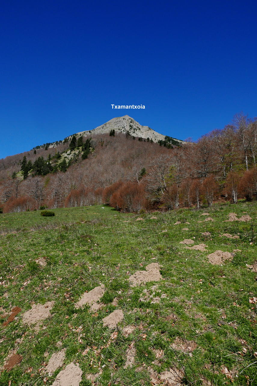 Asciendo por un lomo dirección NW que luego gira al oeste. Salgo a terreno despejado (1690m) y aparece el perfil del Txamantxoia imponente. Paso a la vertiente norte (1795m 0h55′) avanzando por una senda entre el pedregal. Dejo la senda y sigo hitos a mi izquierda por una traza que sube directa por la áspera ladera de piedras, con tanta pendiente que hasta tengo que apoyar las manos. La senda, algo más amable, rodea el pico por el norte para girar luego a la izquierda, pero mi ruta desemboca directamente en la cima del Txamantxoia (1941m 1h12′). Espléndidas vistas en este día despejado y bastante frío.