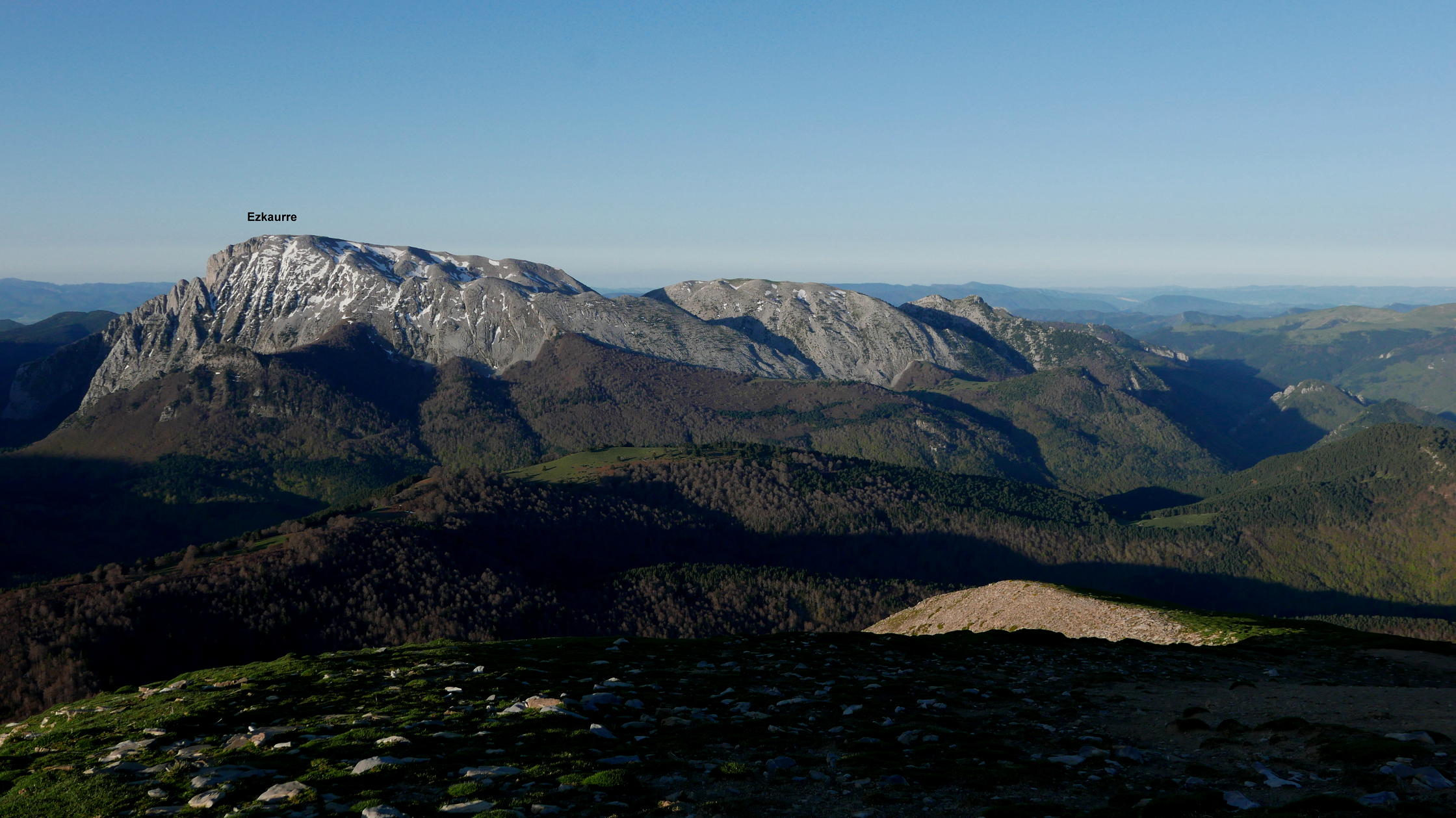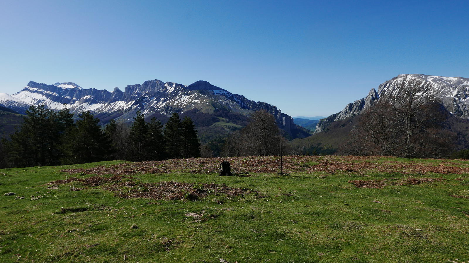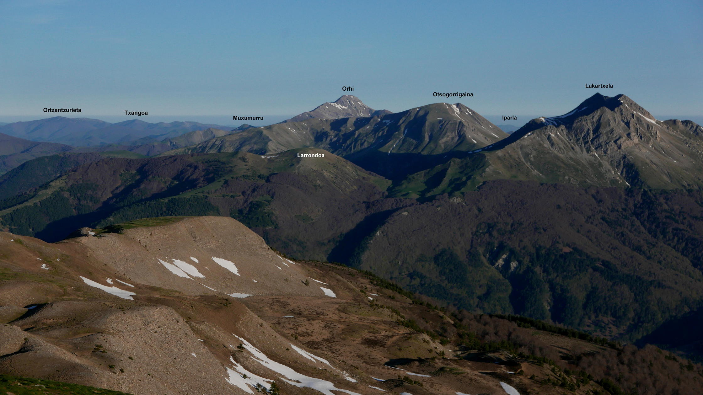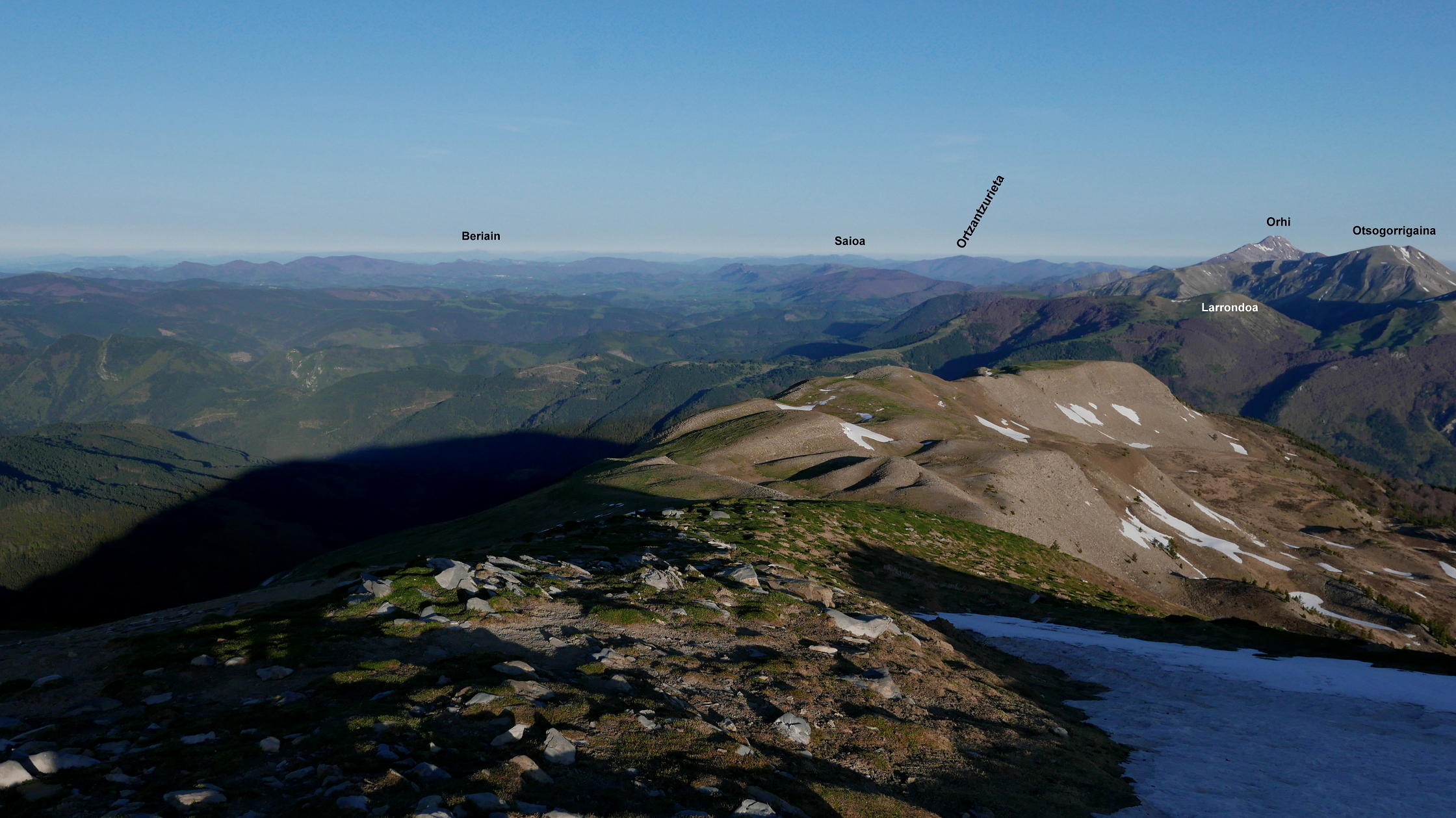 En ascenso suave, por traza de senda que medio se intuye entre el hayedo, se sube un poco por la derecha de un lomo dirección SSE. Al final, por terreno abierto de pasto, hasta la redondeada cima del Iturruburua (1587m 3h16′).