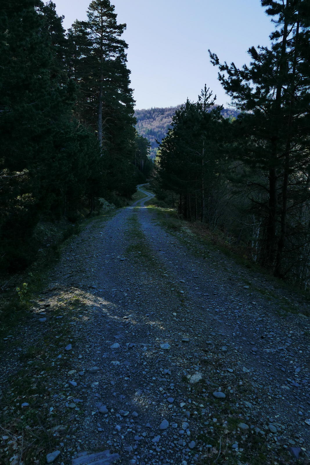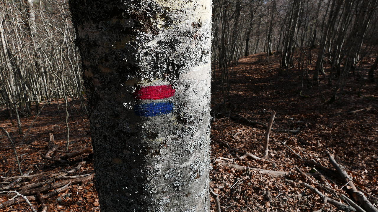 Sigo el lomo oeste por suave pasto. Un viento no muy fuerte pero sí muy frío me acompaña. Paso una cota con un gran hito (1866m 1h46′). Después dejo el lomo y giro a la izquierda 150º para descender por la ladera. Trato de seguir una tenue traza de senda bajando en diagonal hacia el SSE, fijándome en que hay algún hito disperso. Esta parte va a ser un poco confusa, aunque con tiempo despejado no presenta problemas ya que no hay cortados ni zonas peligrosas. Girando hacia el sur y SW tengo que atravesar una franja de bosquecillo de hayas y luego salgo a terreno abierto con helechos secos. Había perdido la senda pero la vuelvo a recuperar para desembocar en una pista (1450m 2h28′) en un punto en el que hay un pequeño hito sobre el que pongo dos piedras más.