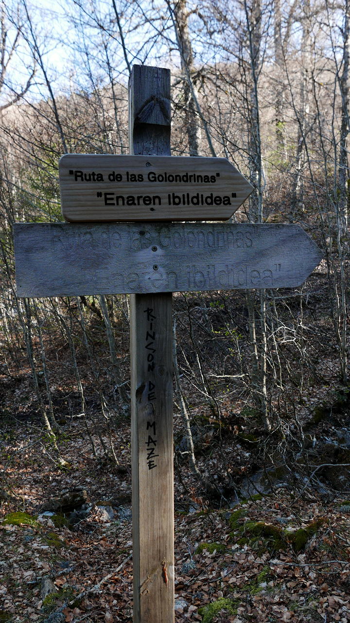 Sigo la pista en suave descenso por unos 700m, paso junto a una borda y encuentro a la izquierda un prado con un cartel que indica Ruta de las Golondrinas (1405m 2h43′). Ahí salgo de la pista por el prado y, al entrar en el pinar, se encuentra la senda que posteriormente se desdibuja, hasta que encuentro otro cartel que pone Ruta de las Golondrinas/Rincón de Maze (1450m 2h55′) justo antes de atravesar un arroyo que viene del collado de Maze.
