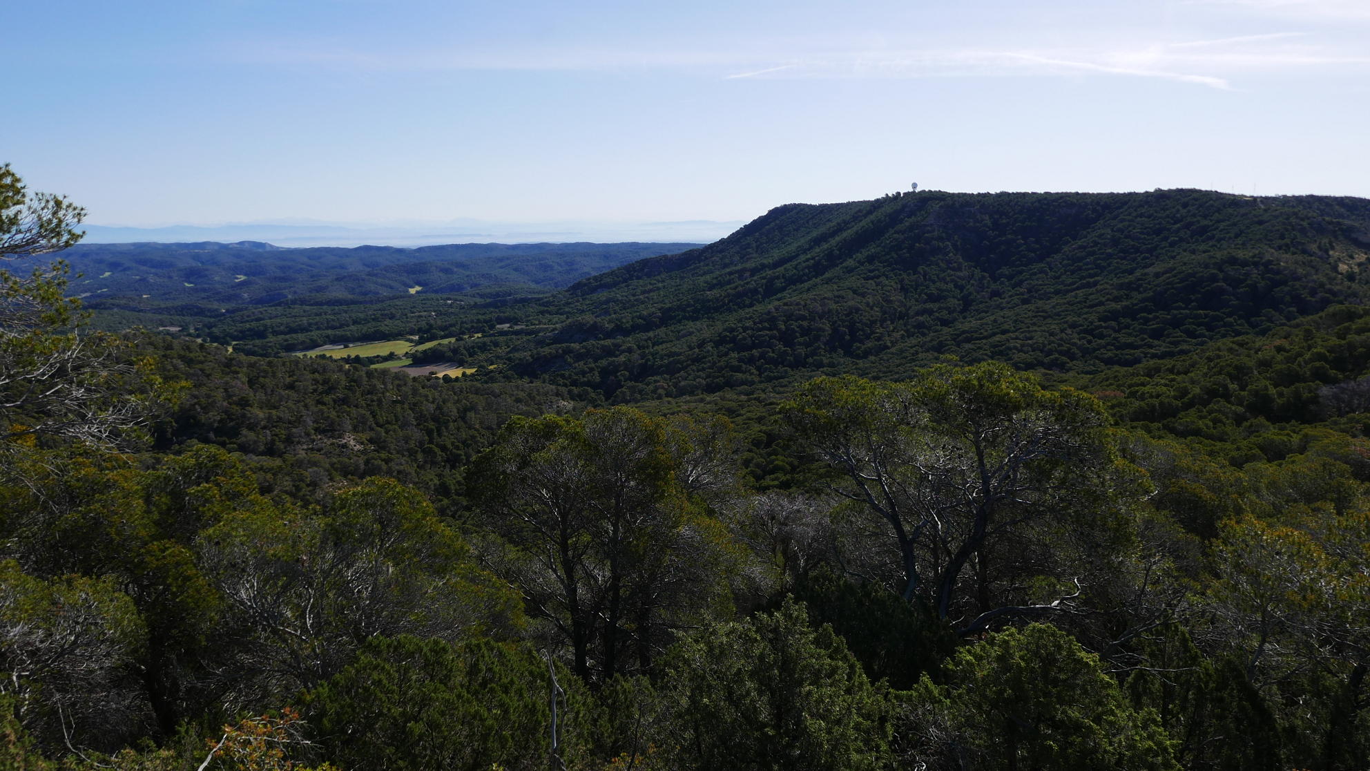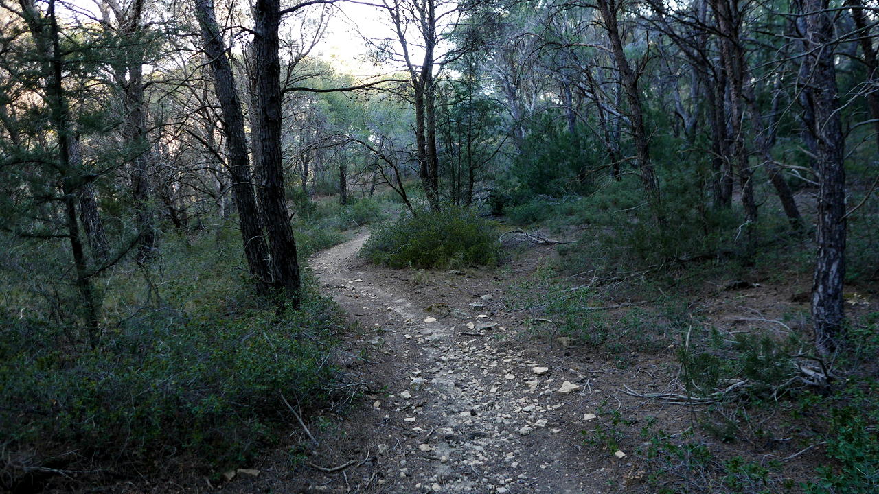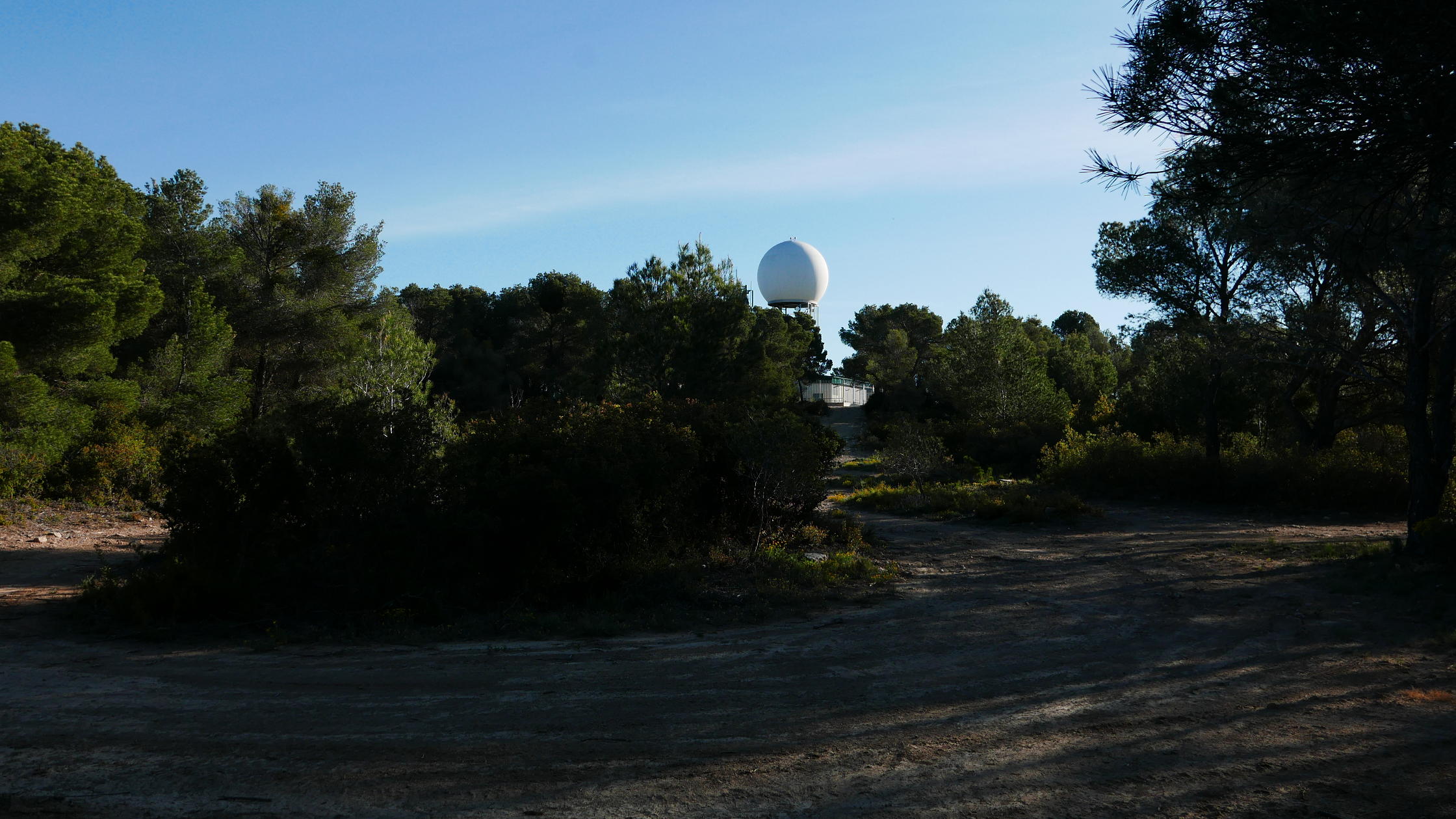 La senda sube por un pinar, la subida es más fuerte, pero luego se suaviza para llegar al collado (737m 0h58′). Sigo a la izquierda (este) una senda con fuerte pendiente, llega a unas antenas y se interna curveando por el pinar hasta el radar (Monte Oscuro cima oriental 825m 1h12′).