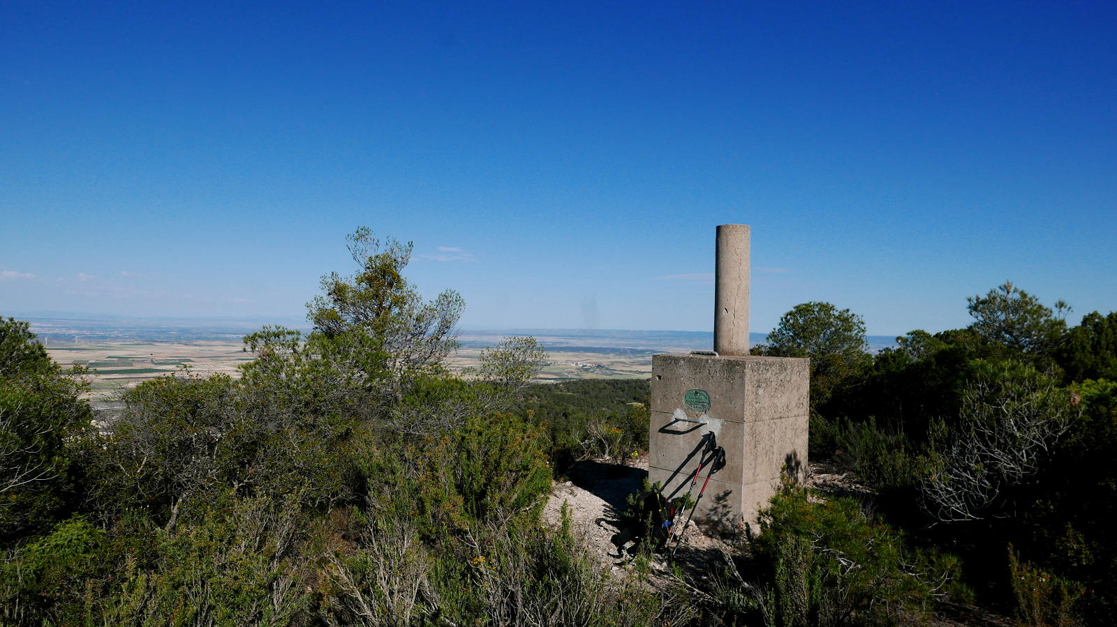 Vuelvo al collado y continúo hacia el oeste. Hay una bifurcación, tomo a la izquierda (740m 1h36′) una senda difusa con hitos. Se interna entre vegetación arbustiva y pinos y supera algunos escalones rocosos. Es algo confuso pero no difícil hasta llegar al vértice geodésico (Monte Oscuro cima occidental (811m 1h49′).