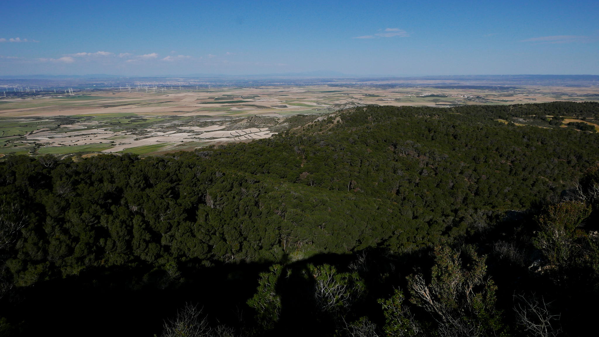 Monte Oscuro, bonito nombre para un montaña. Supongo que procede de los bosques de sabina que abundan en la zona con su tonalidad verde oscura. A pesar de estar acostumbrado a las poderosas cumbres pirenaicas, esta excursión me sorprende gratamente ya que una buena parte se desarrolla por sendas entre pinares y sabinares. La cima del radar es más accesible (lógicamente se puede llegar por una pista, pero si hacemos una caminata lo haremos por el lado contrario, por senda en el pinar), mientras que la del vértice es bastante más agreste, sin senda clara entre zona de matorral que, aunque no es difícil, no debería considerarse como ruta senderista.