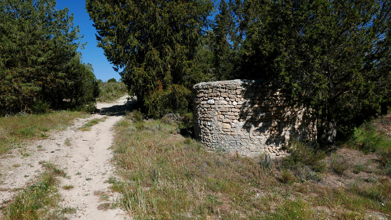 Regreso a la última bifurcación para seguir la senda que había dejado, ahora girando a la izquierda. Avanza por pinar y sabinar faldeando la cima del vértice geodésico por agradable sombra. Desemboca en un camino principal (625m 2h37′) que sigo hacia la izquierda. Pasa junto a un curioso pozo que es una edificación cilíndrica de piedra. Llego a una pista (645m 2h49′), voy a la derecha hasta alcanzar la primera bifurcación en la que seguí recto y ahora giro a la izquierda para llegar al collado Santa Cruz (650m 3h00′)