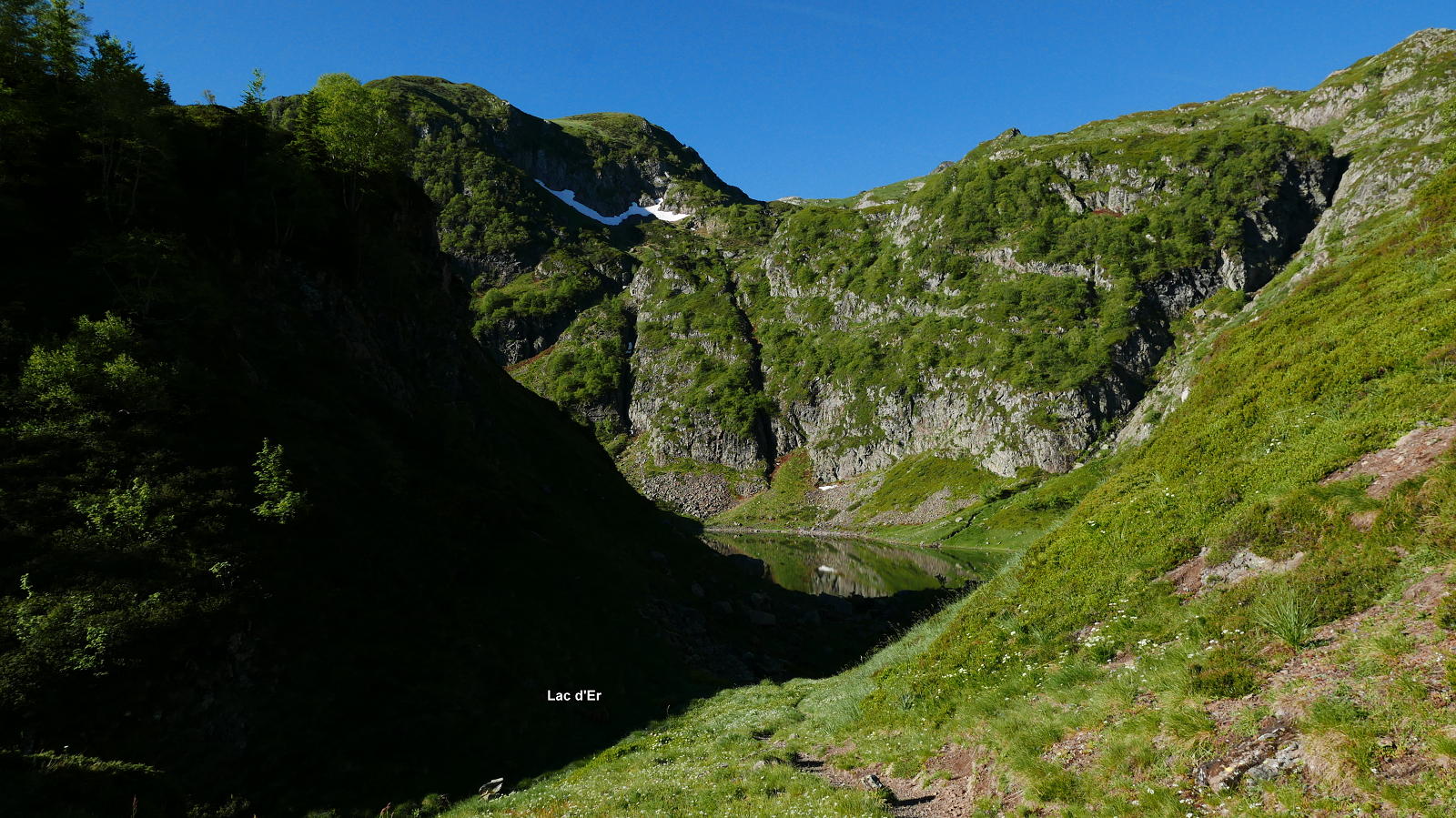 Descripción de la ruta: Pont d’Ayguebère (975m). Hay que cruzar la carretera y, frente al aparcamiento, se inicia el camino señalizado hacia el Lac d’Er. Asciende con fuerte pendiente bajo la sombra del precioso hayedo-abetal. Hay alguna marca de pintura amarilla. Se sale del bosque a un claro, el Plateau d’Ayguebére (1450m 0h55), donde hay un poste clavado con pintura amarilla. Desde aquí hay una ruta a la izquierda que asciende por fuertes corredores herbosos entre unos curiosos pitones de roca, descrita en Topopyrenées, pero nosotros seguimos la vía normal hacia el lago, girando a la derecha por el sendero que vuelve a introducirse en el bosque para subir en diagonal hacia el norte.