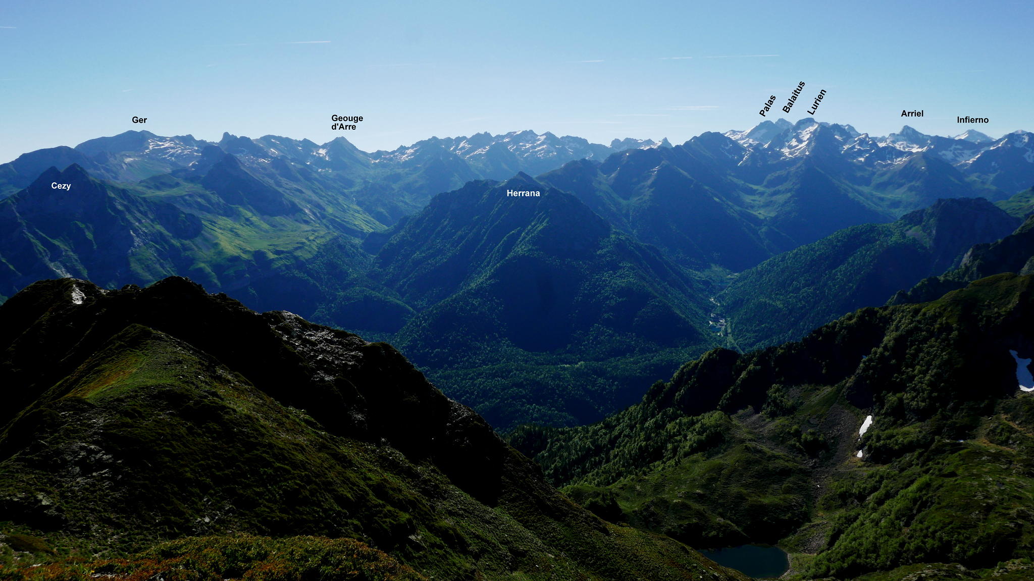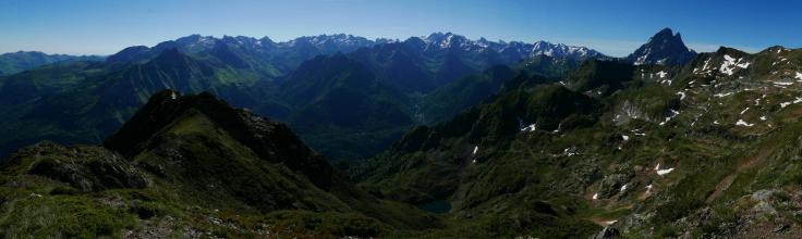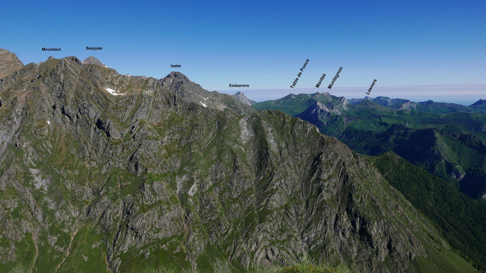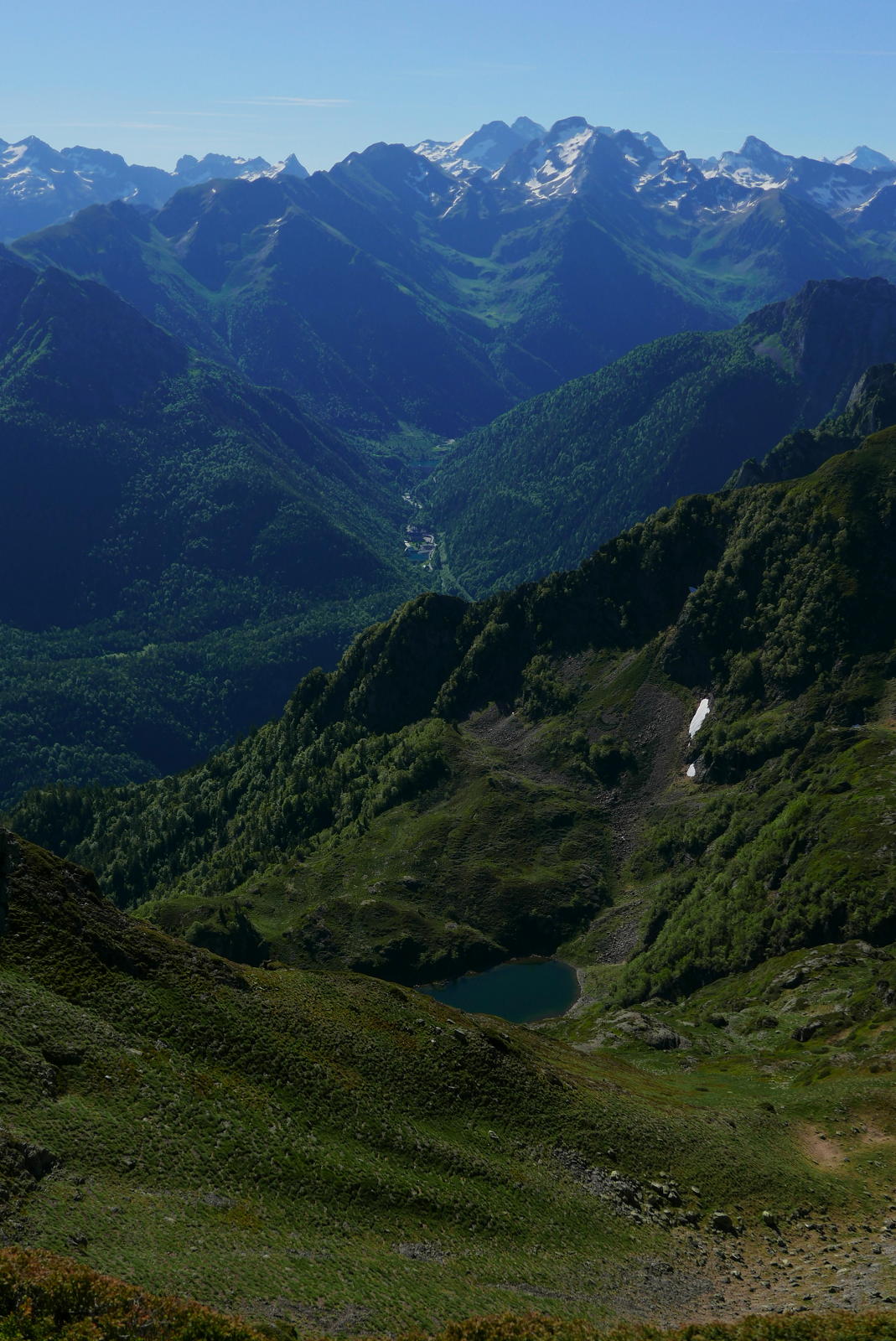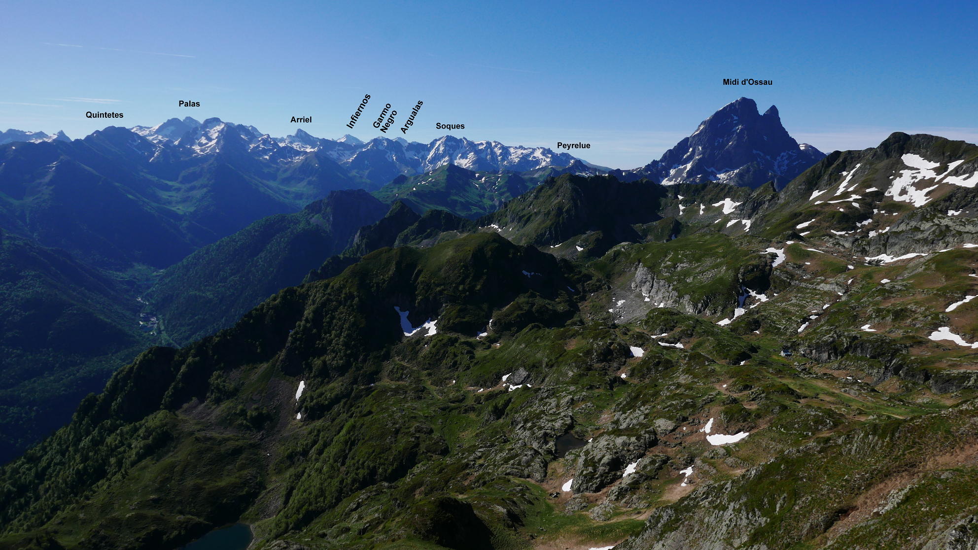 Un destacable macizo montañoso separa el valle de Ossau y el de Aspe, entre los imponentes picos del Midi d’Ossau, al sur, y el Sesques o Escarpu, al norte. Los picos que lo componen están entre 2100 y 2500m, con laderas boscosas en su parte baja y recónditas cubetas lacustres más arriba. Así que es una zona en la que se pueden encontrar numerosas rutas relativamente fáciles, aunque con considerables desniveles si se quieren coronar las cumbres.
