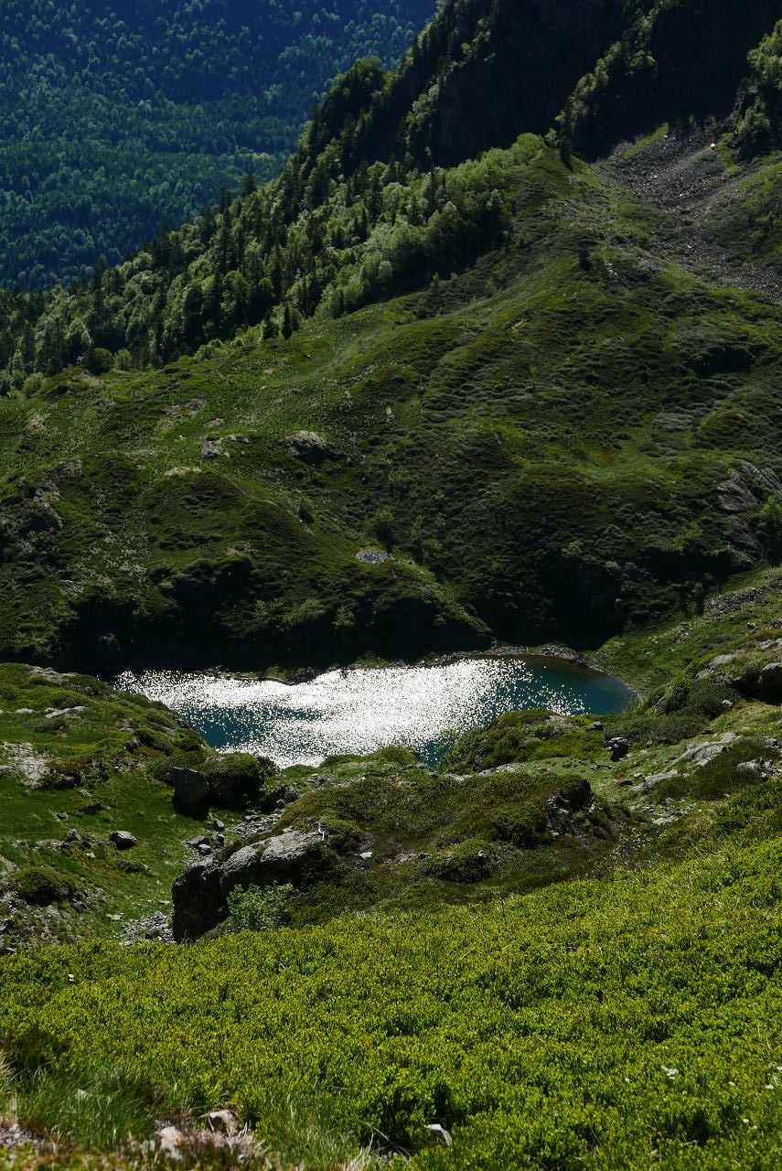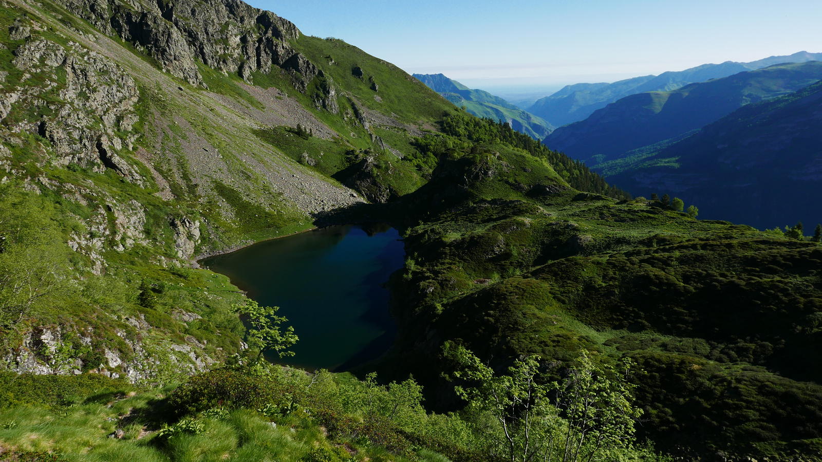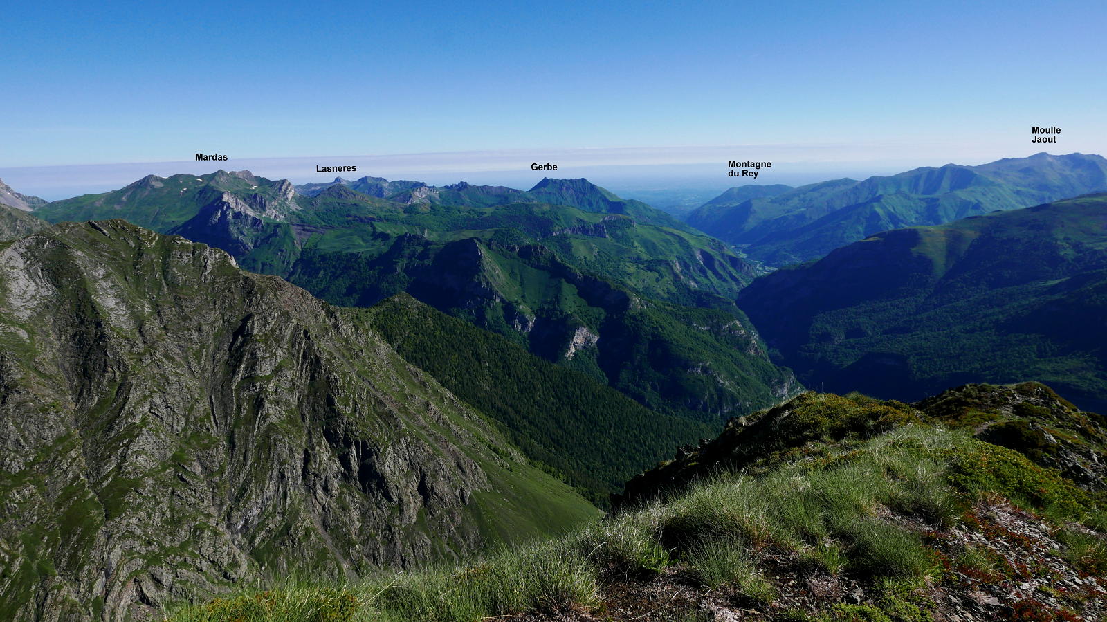 Un destacable macizo montañoso separa el valle de Ossau y el de Aspe, entre los imponentes picos del Midi d’Ossau, al sur, y el Sesques o Escarpu, al norte. Los picos que lo componen están entre 2100 y 2500m, con laderas boscosas en su parte baja y recónditas cubetas lacustres más arriba. Así que es una zona en la que se pueden encontrar numerosas rutas relativamente fáciles, aunque con considerables desniveles si se quieren coronar las cumbres.
