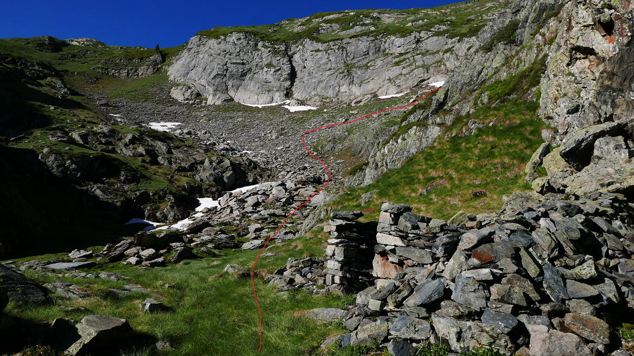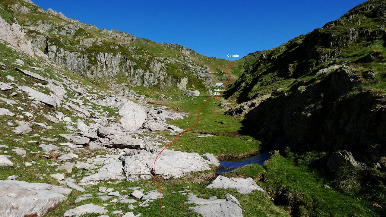 Sigo la vaguada de esta cubeta hacia la pared rocosa de enfrente. Antes de llegar a la pared se gira a la derecha por terreno pedregoso y se encara otra vaguada, en este caso herbosa y por la que desciende un riachuelo, que se dirige a la cabaña d’Er (2020m 2h28′). La cabaña está cerrada.
