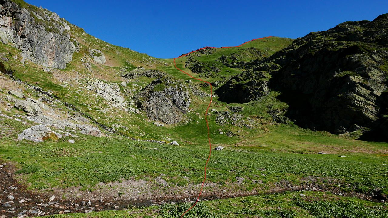 Se accede así a la cresta d’Ayguebère que da paso a la cubeta del Lac d’Er (1780m 1h40′) con su encantador lago. Javier se queda en la orilla del lago mientras yo continúo la ascensión por la izquierda del mismo, lomos herbosos de la orilla este y dirección sur, sin senda definida, para atacar una fuerte subida por los bloques rocosos de un barranco seco que obligan a apoyar las manos en algún paso concreto. El barranco se abre a una vaguada más amable en la que hay que girar a la izquierda para subir a una cubeta con un laguito casi seco (1950 2h15′) y restos de las paredes de piedra de una cabaña.