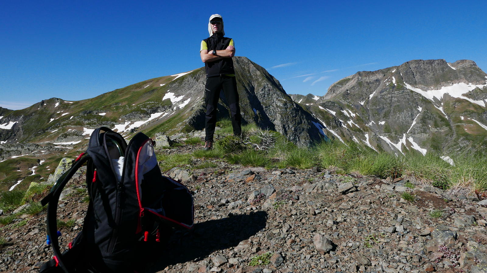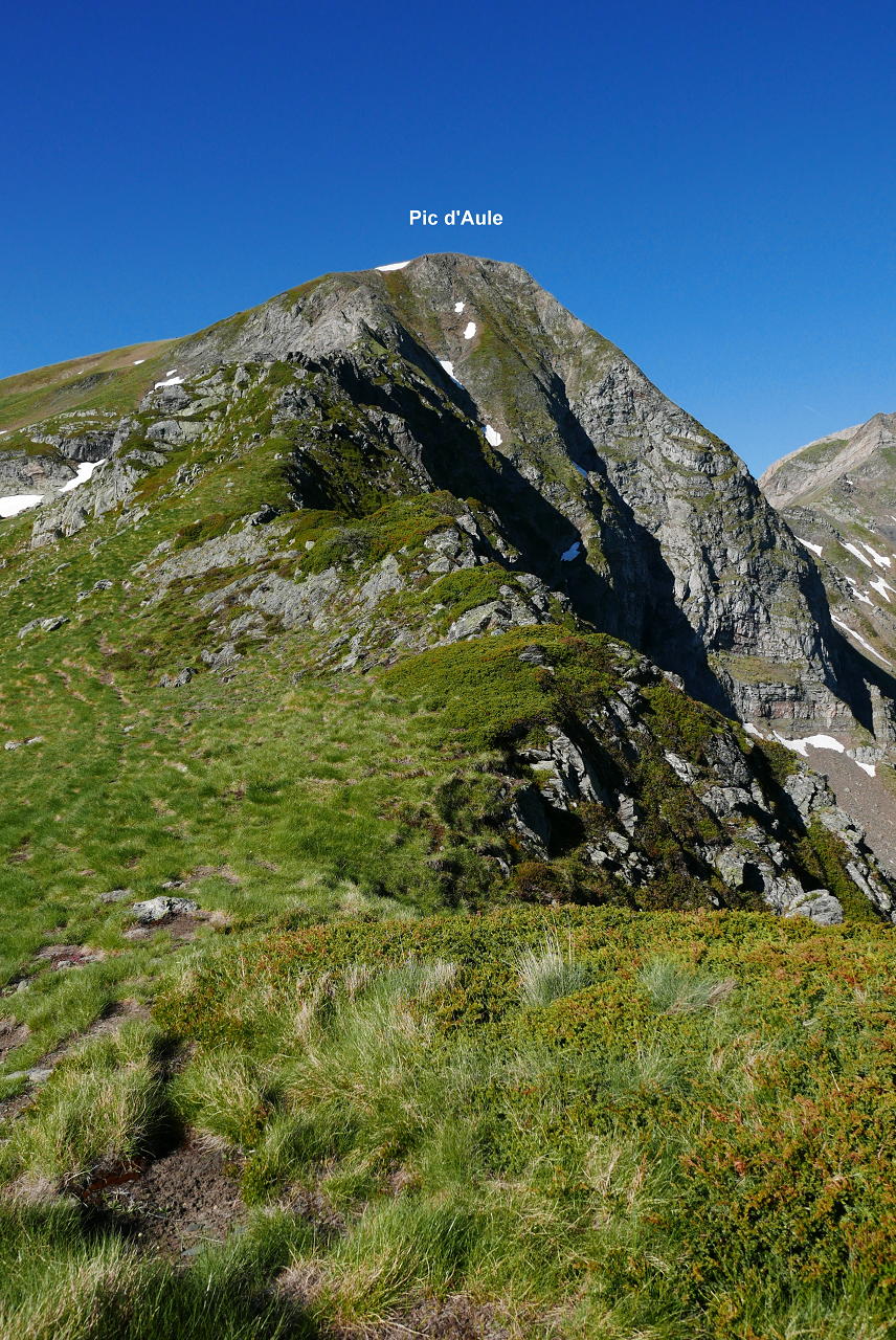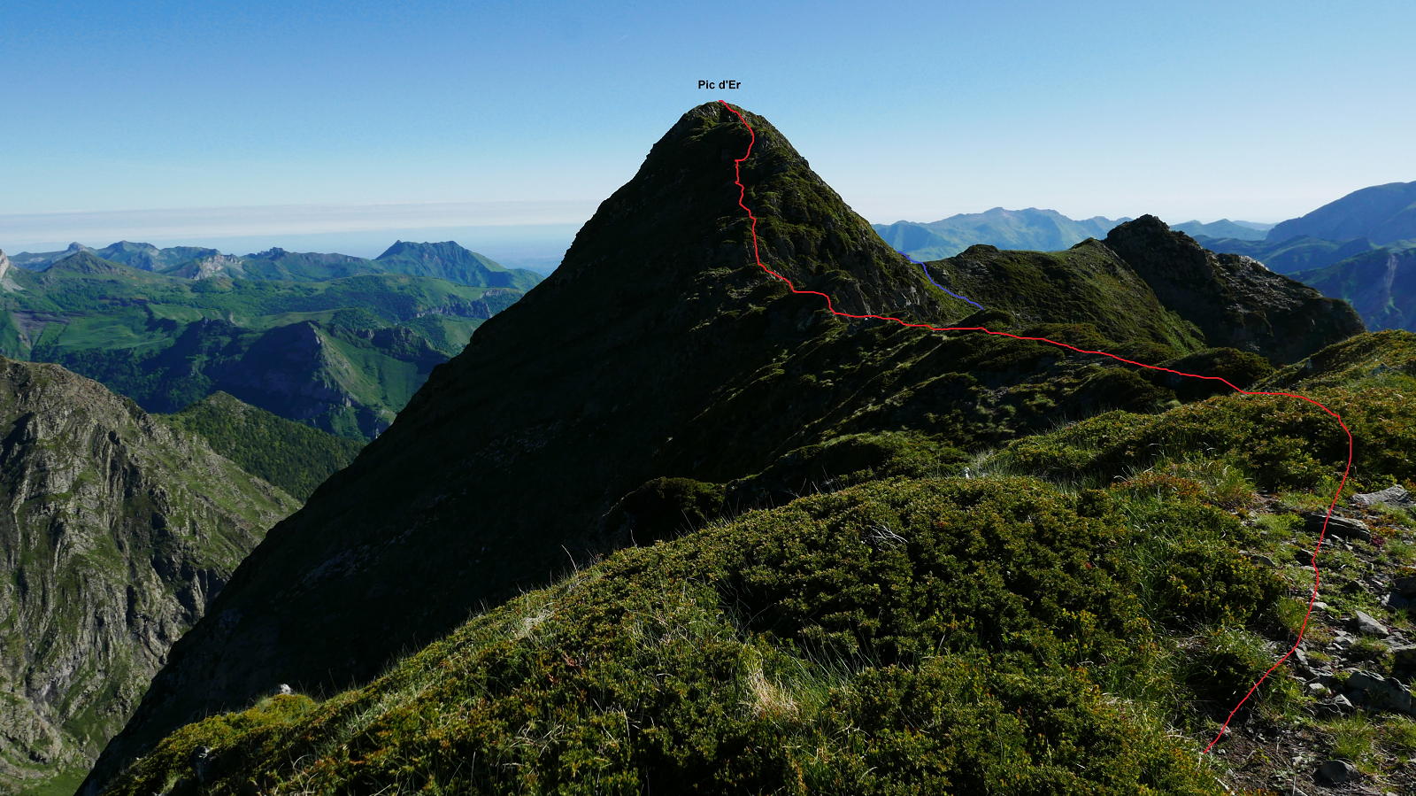 Continúa la vaguada, dirección NW, terreno cómodo herboso (un poco más a la izquierda parece que hay huella de paso); va aumentando ligeramente la pendiente hasta el collado entre los picos d’Er y d’Aule (2126m 2h43′). Afronto el lomo a mi derecha (NNE) por el que se va dibujando huella que asciende a una primera cota desde la que ya se ve la figura más picuda de la cumbre que busco. La cresta se afila pero no presenta problemas y, finalmente, hay una subida más potente con senda bien marcada que accede al Pic d’Er (2205m 2h55′). Día claro y magnífica vista.