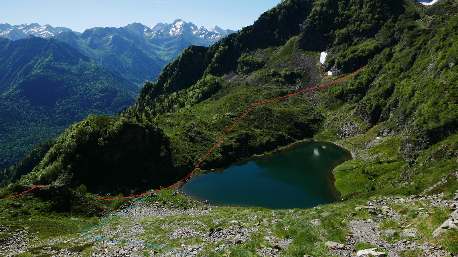 Sigo la cresta para descender a un pequeño collado que me permite tomar el corredor herboso a la derecha por el que voy a descender. La pendiente es muy fuerte pero con terreno seco no supone gran dificultad, aprovechando los escalones que va formando el terreno. El corredor se va ensanchando y la pendiente se modera, aparecen hitos y se forma un camino claro. Hay una bifurcación (2020m 3h28′) que tomo a la izquierda (a la derecha parece que volvería hacia la cabaña d’Er). El sendero zigzaguea descendiendo de nuevo al Lac d’Er (1770m 3h49′). Me reúno con Javier y retomamos la bajada por el bosque de nuevo al aparcamiento (975m 5h05′)