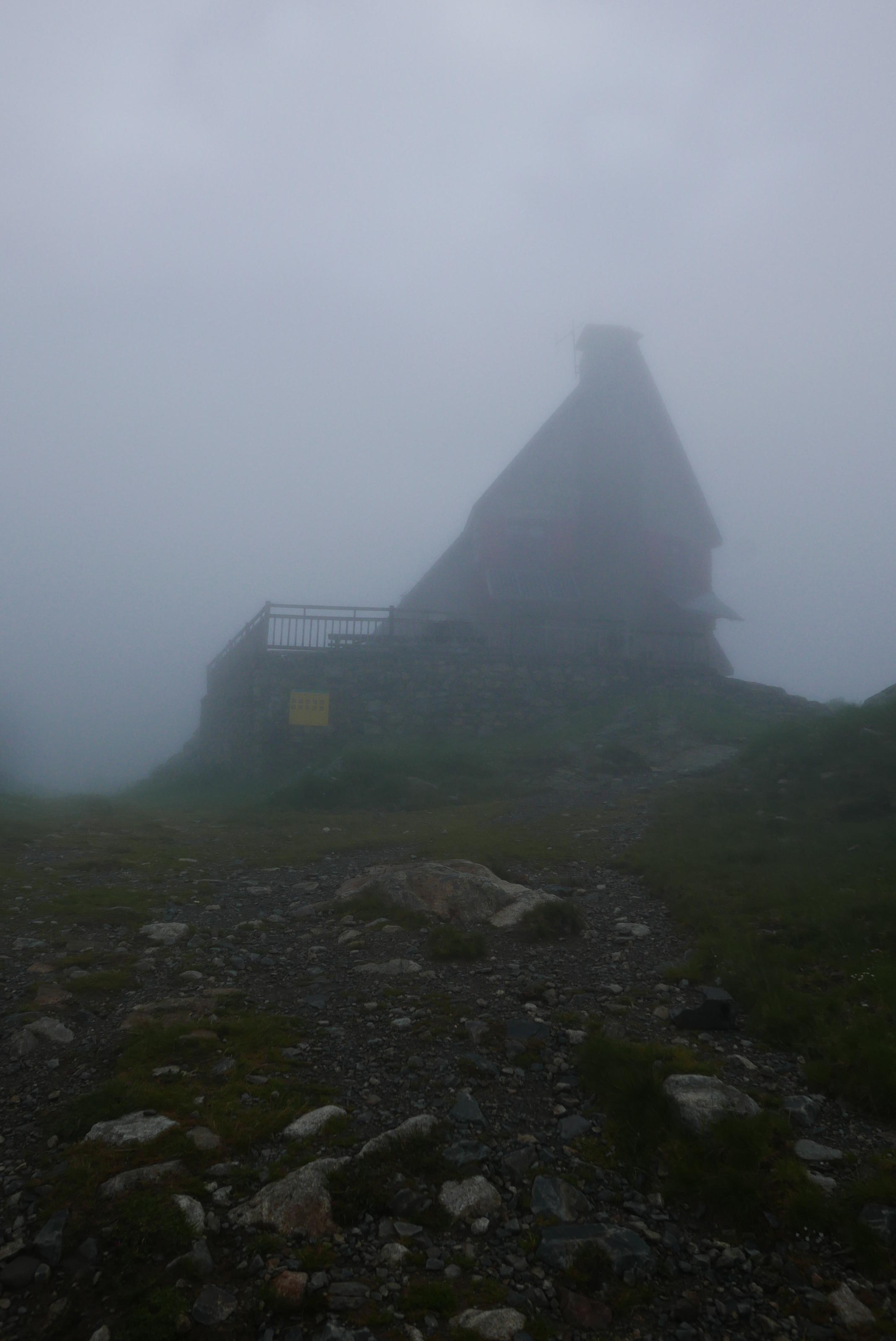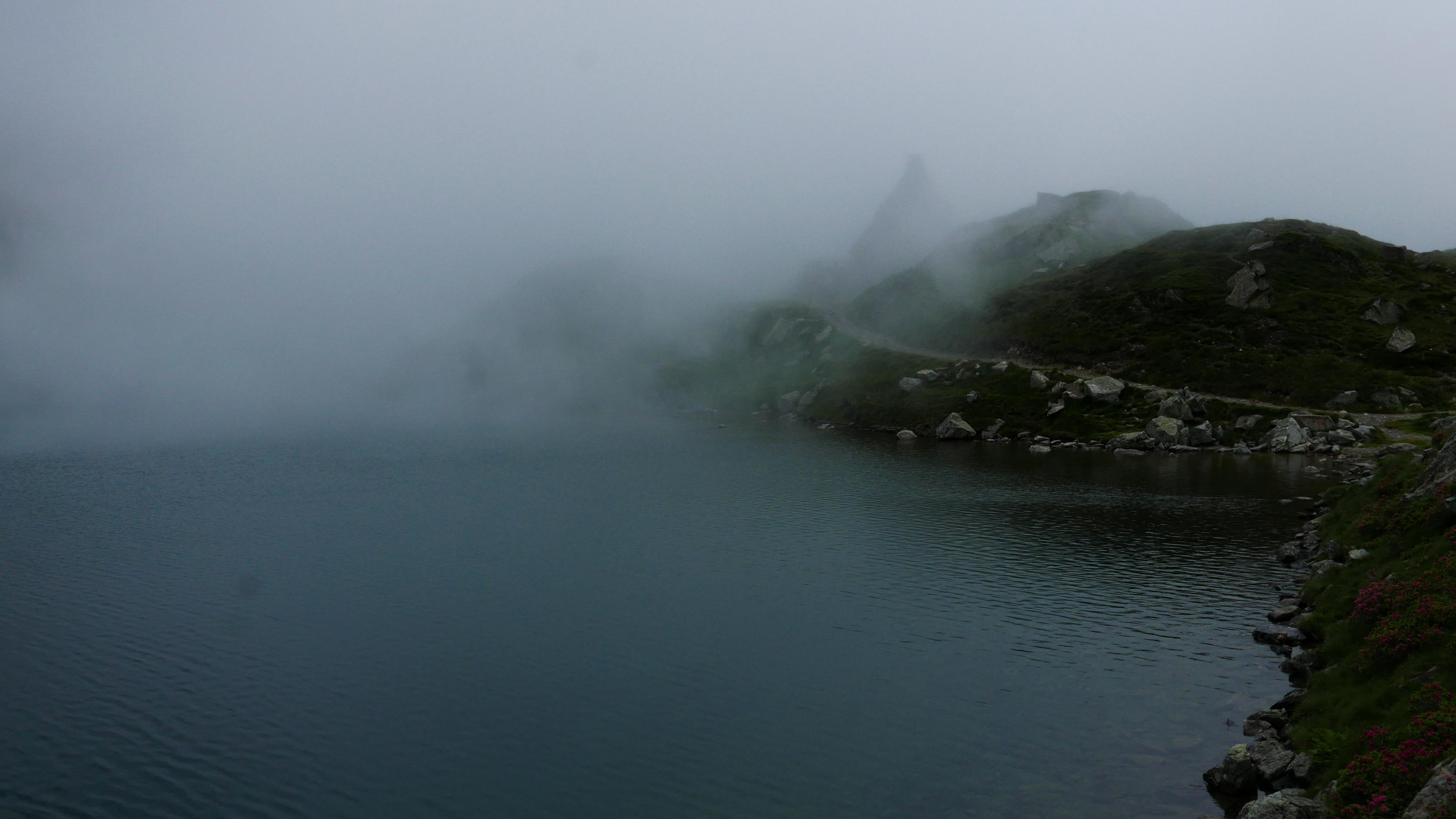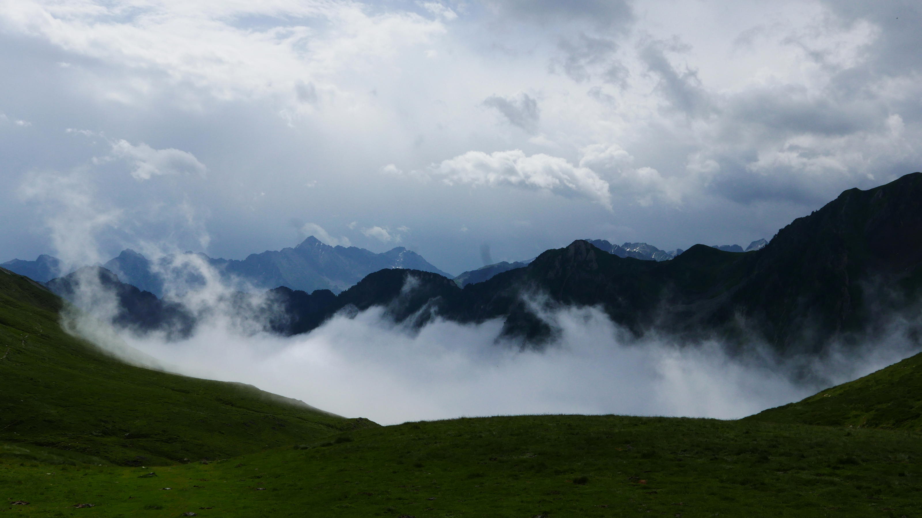 En el descenso hacia el lac d’Ilheou sube la niebla desde el valle y casi ni se ve el refugio d’Ilheou (1998m 3h48′). Sin parar afronto la tercera subida hasta el col d’Ilheou (2256m 4h37′) que, sin ser demasiado pendiente, se me hace un poco pesada.