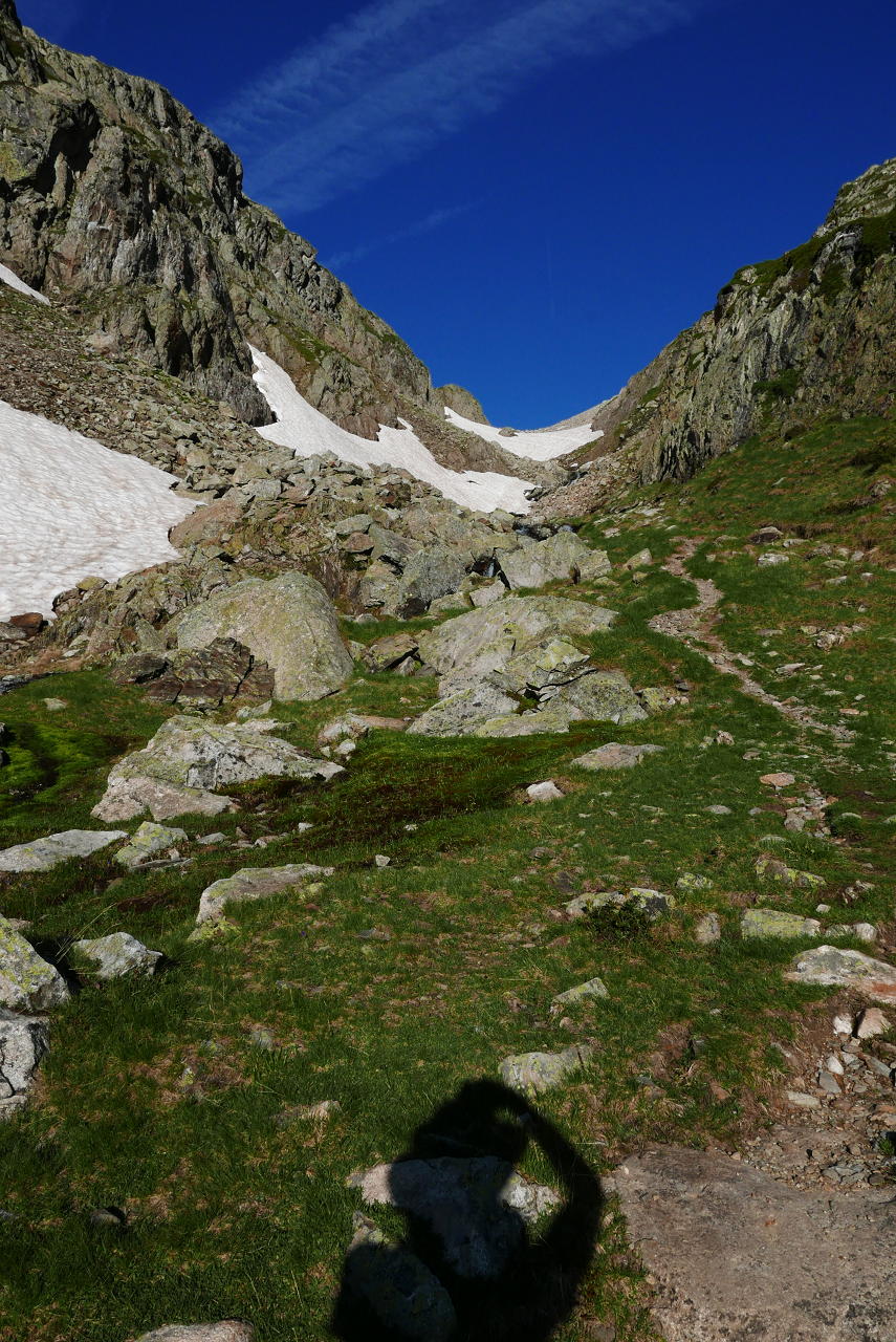 El sendero asciende la ladera en zigzag, pasa junto a un laguito (2300m 1h17′) y se introduce en una canal más estrecha (2355m 1h26′), donde ya hay algún nevero. Me pongo los crampones pero los vuelvo a quitar después. La vaguada se ensancha, a mi izquierda quedan los lagos de la Fache. Pienso que ya va a haber neveros hasta el collado y calzo los crampones de nuevo, pero la senda los evita por la derecha y me los tengo que quitar. Col de la Fache (2664m 2h40′). Al otro lado la vertiente española con el embalse de Campo Plano y Respomuso.