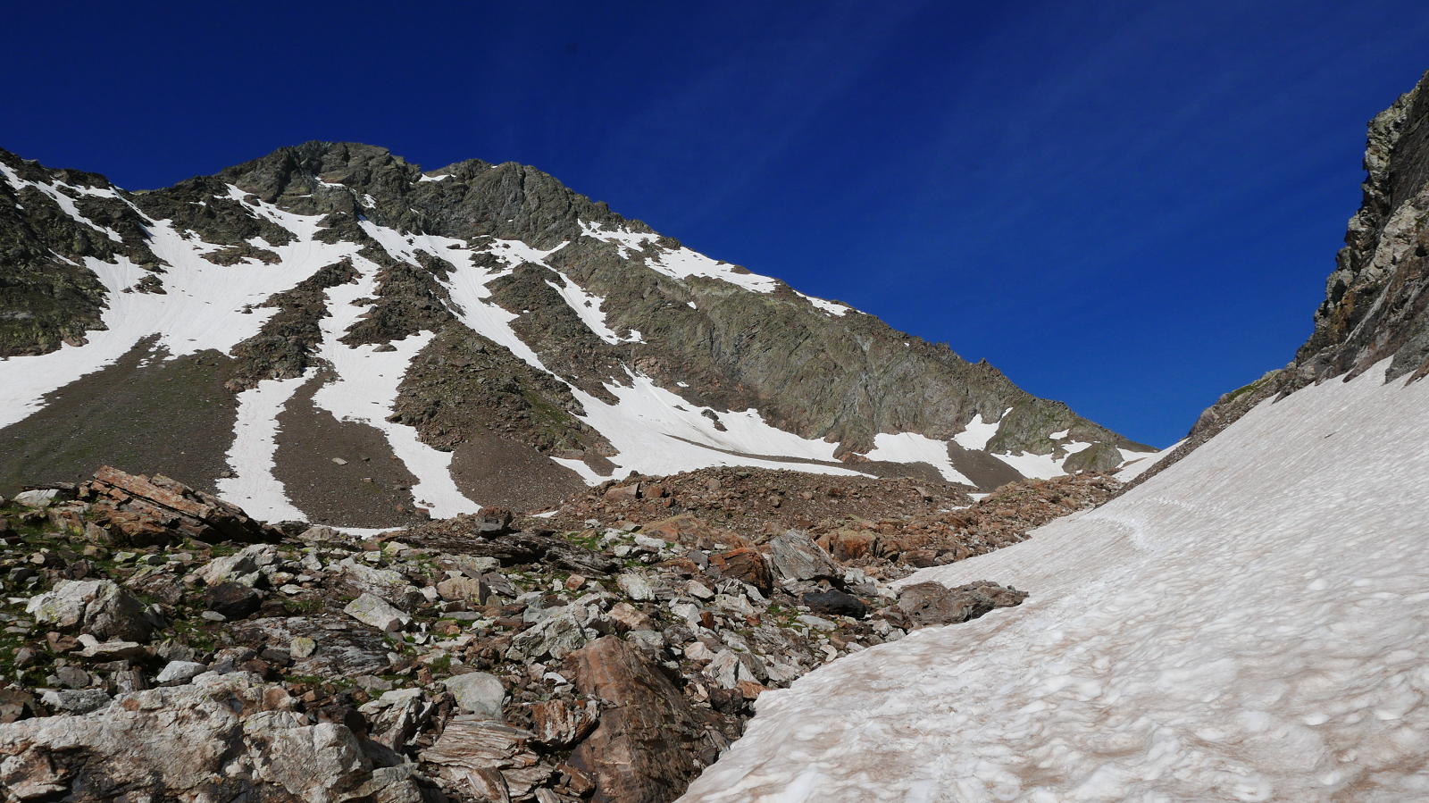 Regreso con calma aprovechando al máximo los neveros por los que se puede bajar sin crampones fácilmente y disfruto de la bajada al refugio Wallon (1875m 8h42′)