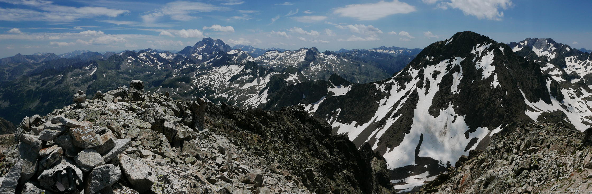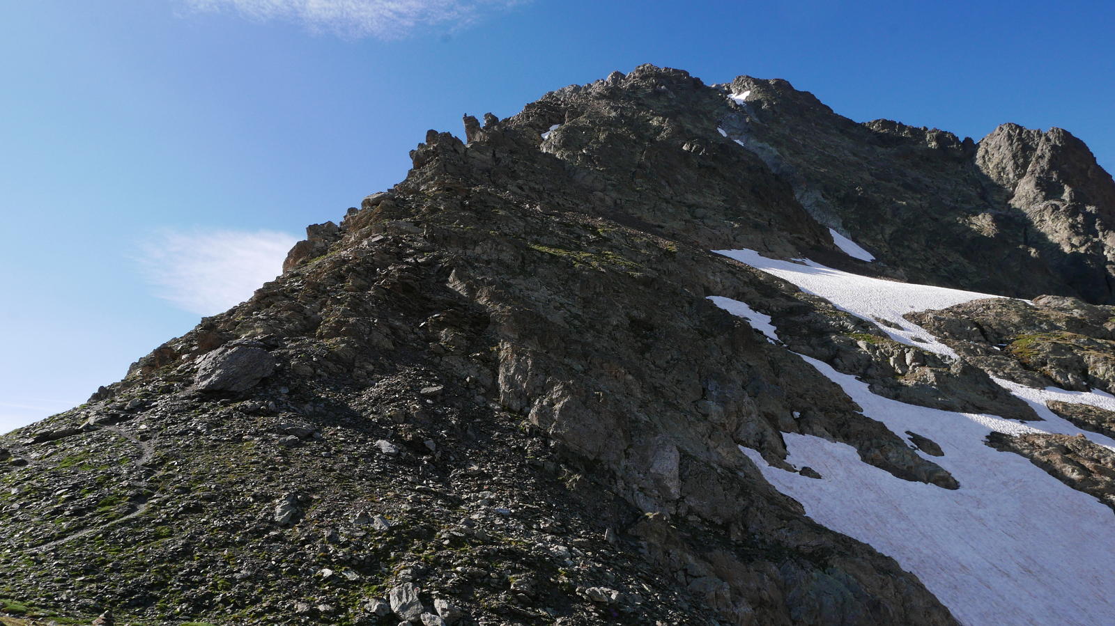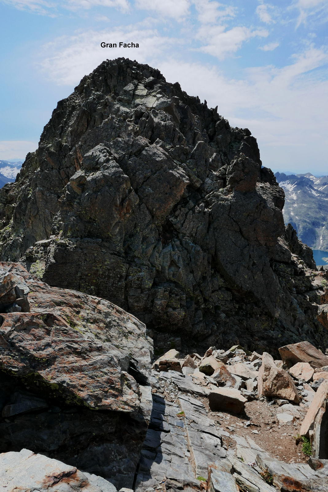 A mi izquierda se eleva la huella marcada por la arista norte de la Gran Facha, siempre ligeramente hacia la vertiente española. Hay que estar pendiente de seguir los hitos. La huella va desapareciendo al ir encarando zonas más rocosas. Hay bastantes hitos, pero a veces por sitios distintos, así que busco las vías que me parecen más adecuadas. Aumenta la verticalidad, sin superar el Iº o Iº+ y se van sucediendo chimeneas y trepadas fáciles. En algún punto quizá se alcance el IIº grado. Hay que superar unos 250m de desnivel, así que es mejor tomárselo con calma y no perder la atención. Ya muy cerca de la cima encuentro una brecha, tras la cual hay unas chimeneas más verticales e, inmediatamente, la cima (Gran Facha 3005m 3h49′) que disfruto completamente en solitario durante más de media hora, con la satisfacción de una bella escalada. En el descenso me cruzo con varios grupos que suben. El casco es necesario ya que la roca está muy rota y puede caer alguna piedra.