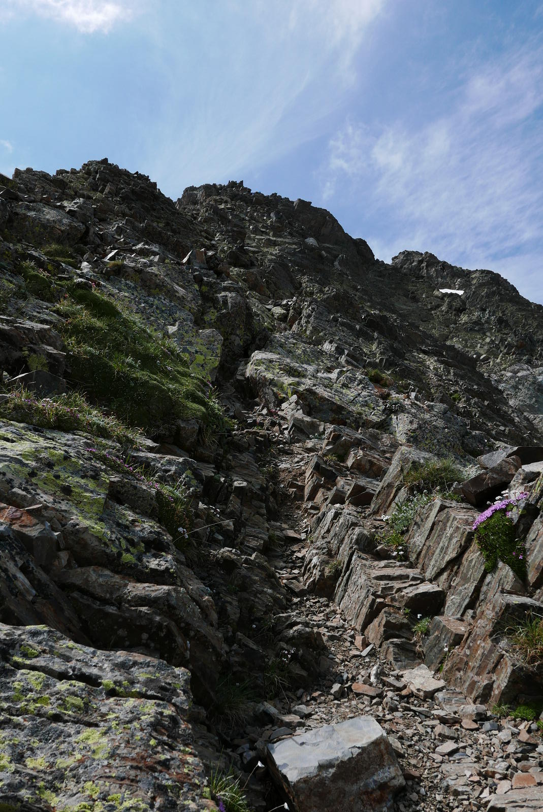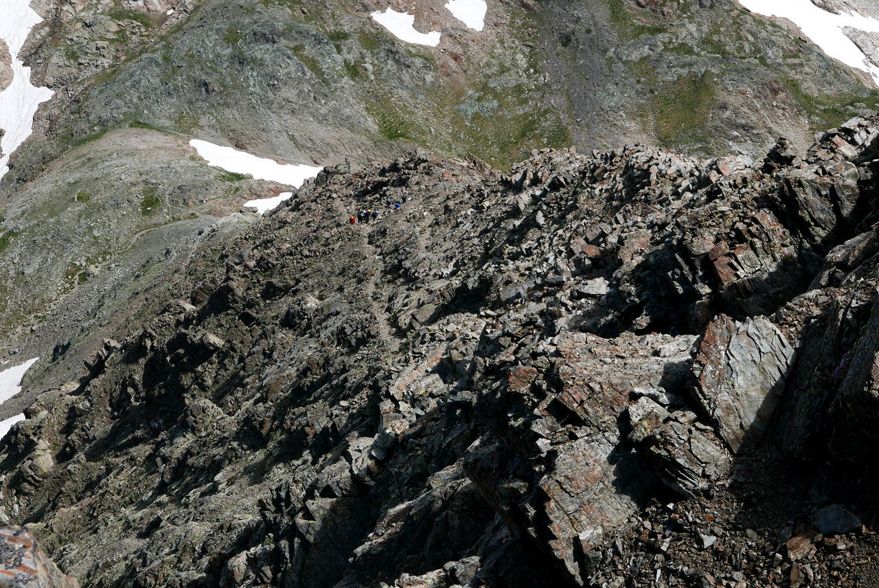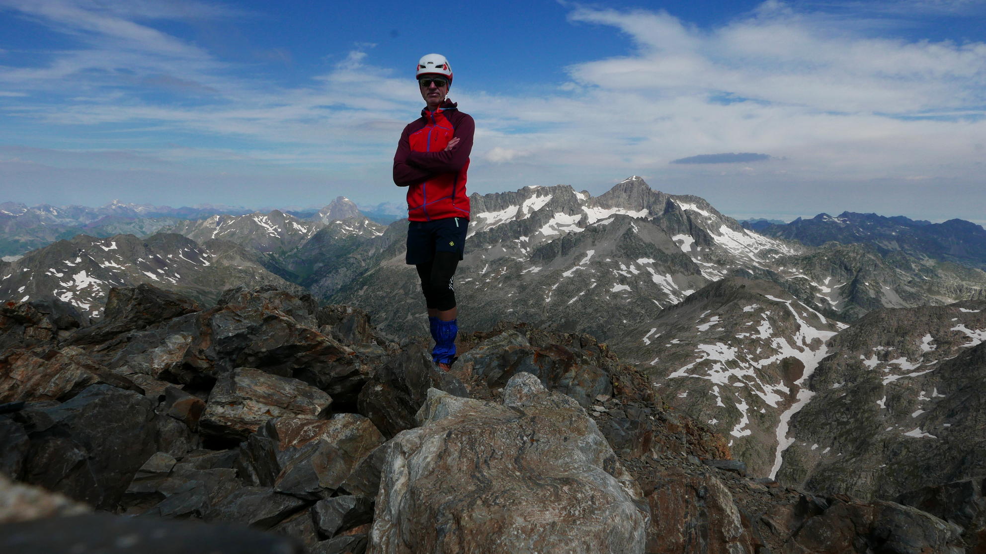 A mi izquierda se eleva la huella marcada por la arista norte de la Gran Facha, siempre ligeramente hacia la vertiente española. Hay que estar pendiente de seguir los hitos. La huella va desapareciendo al ir encarando zonas más rocosas. Hay bastantes hitos, pero a veces por sitios distintos, así que busco las vías que me parecen más adecuadas. Aumenta la verticalidad, sin superar el Iº o Iº+ y se van sucediendo chimeneas y trepadas fáciles. En algún punto quizá se alcance el IIº grado. Hay que superar unos 250m de desnivel, así que es mejor tomárselo con calma y no perder la atención. Ya muy cerca de la cima encuentro una brecha, tras la cual hay unas chimeneas más verticales e, inmediatamente, la cima (Gran Facha 3005m 3h49′) que disfruto completamente en solitario durante más de media hora, con la satisfacción de una bella escalada. En el descenso me cruzo con varios grupos que suben. El casco es necesario ya que la roca está muy rota y puede caer alguna piedra.