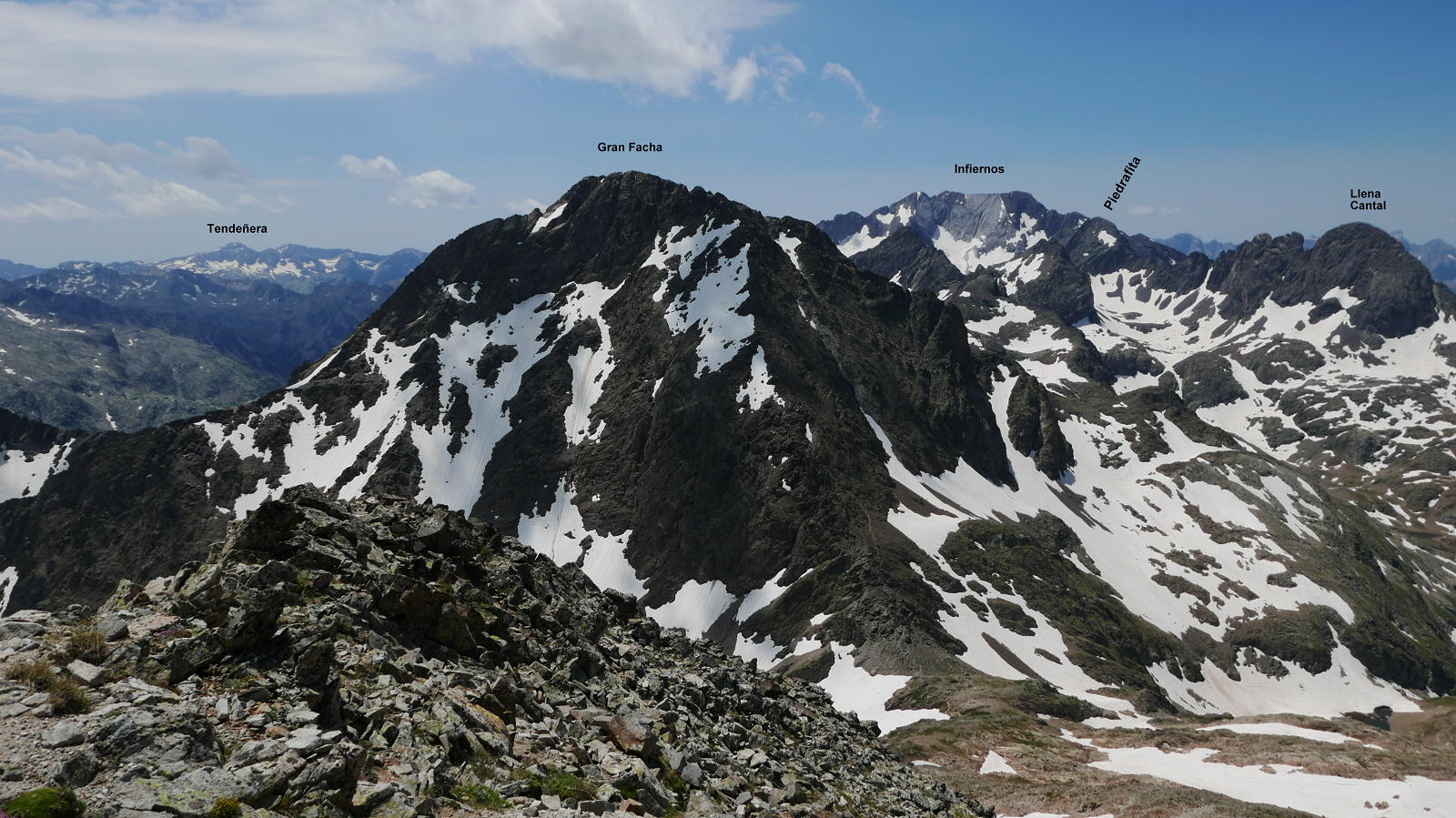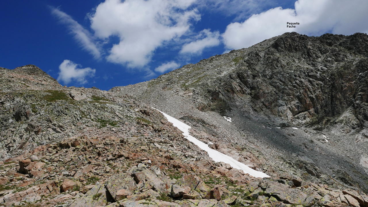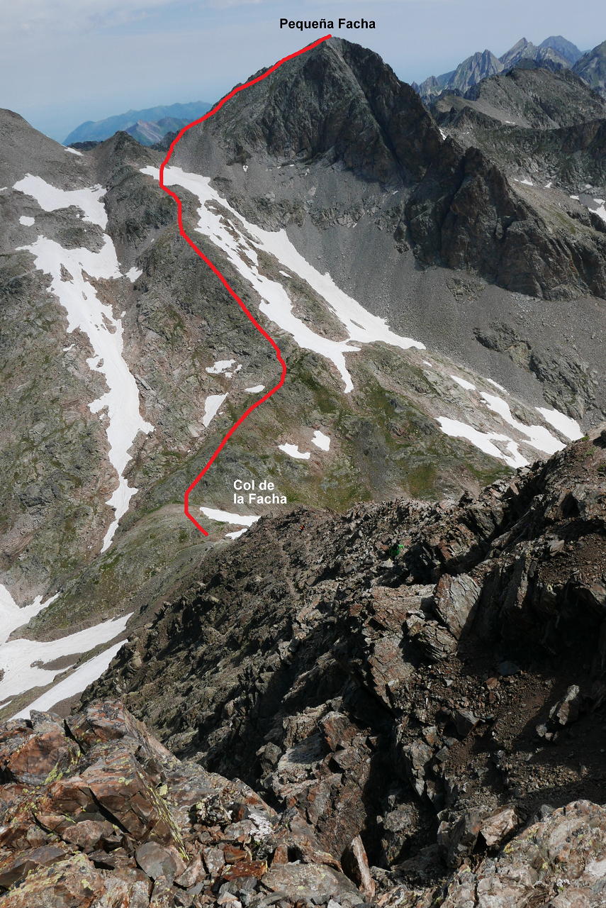 De nuevo en el collado (2664m 5h26′) decido subir la Pequeña Facha. Se sube hacia el norte tomando el lomo un poco a la derecha, donde encuentro huella e hitos. El lomo es herboso y pedregoso. Sigo hasta encontrar un nevero que cruzo un poco en diagonal hacia la derecha y luego directo hacia arriba hasta las rocas de la arista del Péne d’Aragon. En las rocas hago una diagonal a la derecha hacia el collado entre el Péne y la Pequeña Facha. Asciendo a plena cresta o un algo a su derecha sin dificultades para coronar la Pequeña Facha (2947m 6h16′). En el descenso sigo una huella con hitos un poco por debajo de la cresta por su vertiente sur hasta llegar otra vez a la diagonal rocosa que va al nevero y otra vez al collado de la Facha (2664m 6h53′).