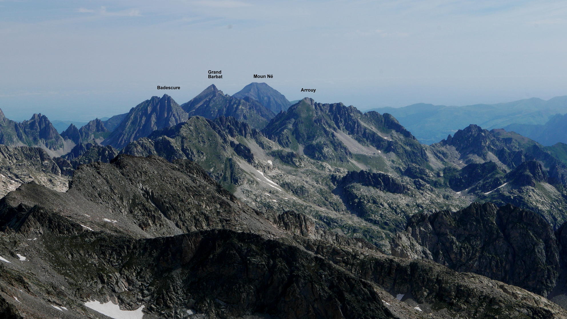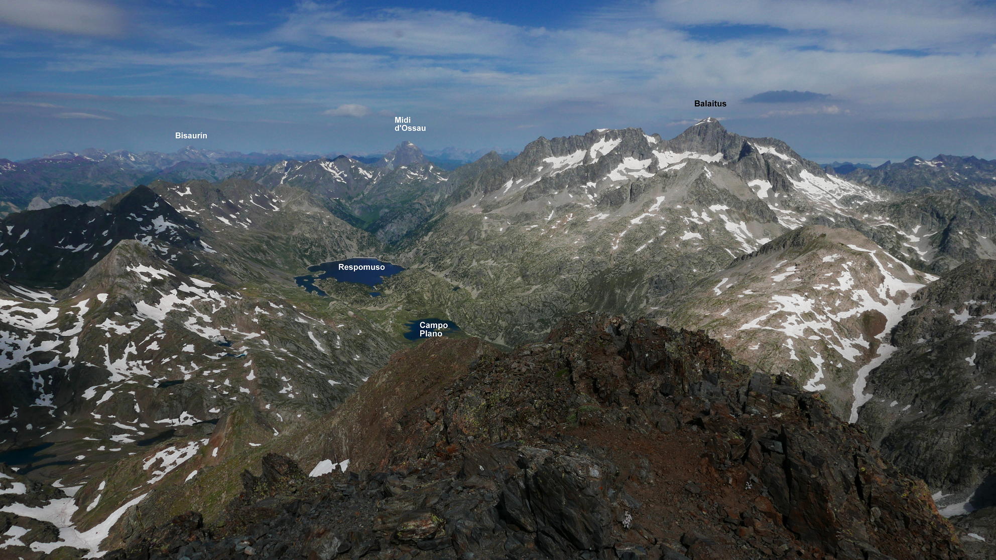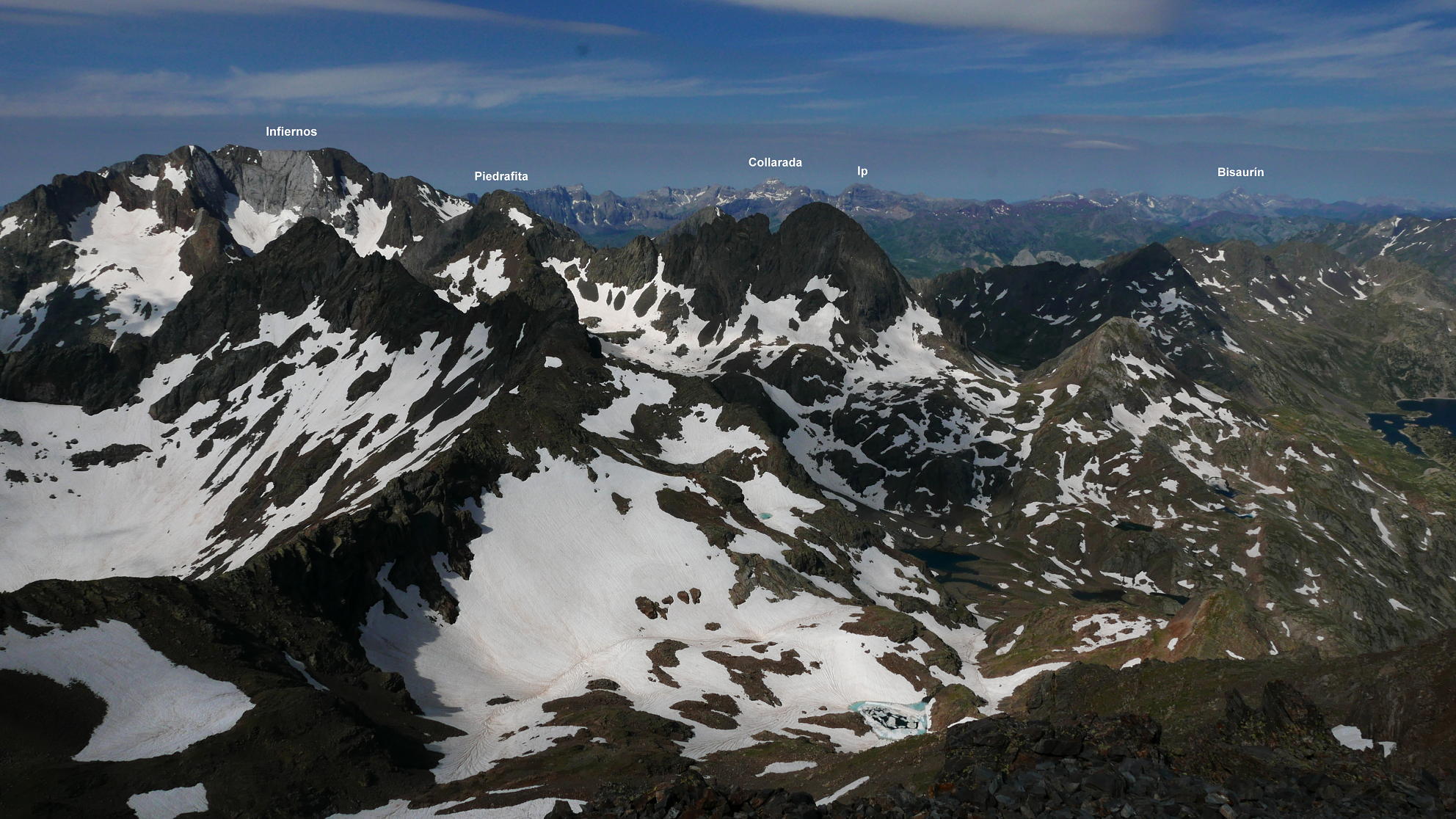 De nuevo en el collado (2664m 5h26′) decido subir la Pequeña Facha. Se sube hacia el norte tomando el lomo un poco a la derecha, donde encuentro huella e hitos. El lomo es herboso y pedregoso. Sigo hasta encontrar un nevero que cruzo un poco en diagonal hacia la derecha y luego directo hacia arriba hasta las rocas de la arista del Péne d’Aragon. En las rocas hago una diagonal a la derecha hacia el collado entre el Péne y la Pequeña Facha. Asciendo a plena cresta o un algo a su derecha sin dificultades para coronar la Pequeña Facha (2947m 6h16′). En el descenso sigo una huella con hitos un poco por debajo de la cresta por su vertiente sur hasta llegar otra vez a la diagonal rocosa que va al nevero y otra vez al collado de la Facha (2664m 6h53′).