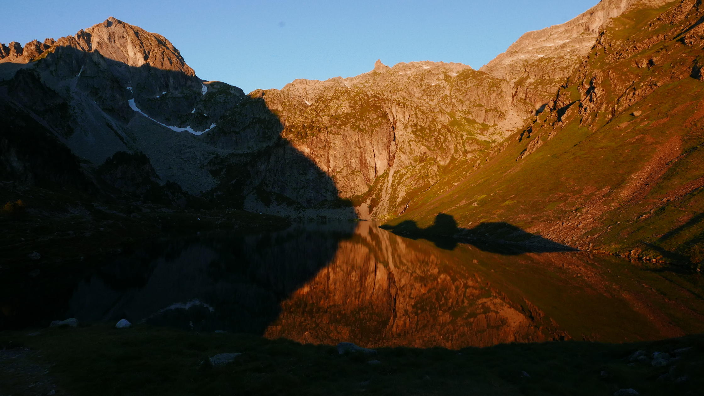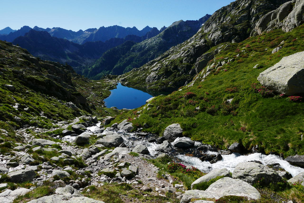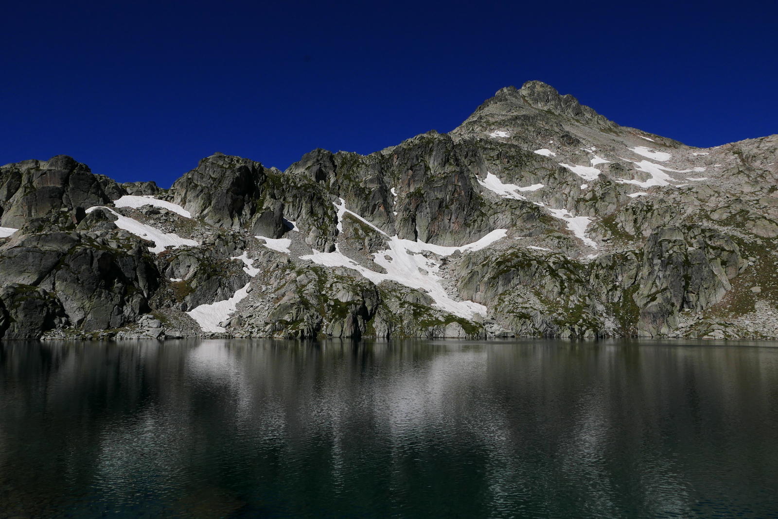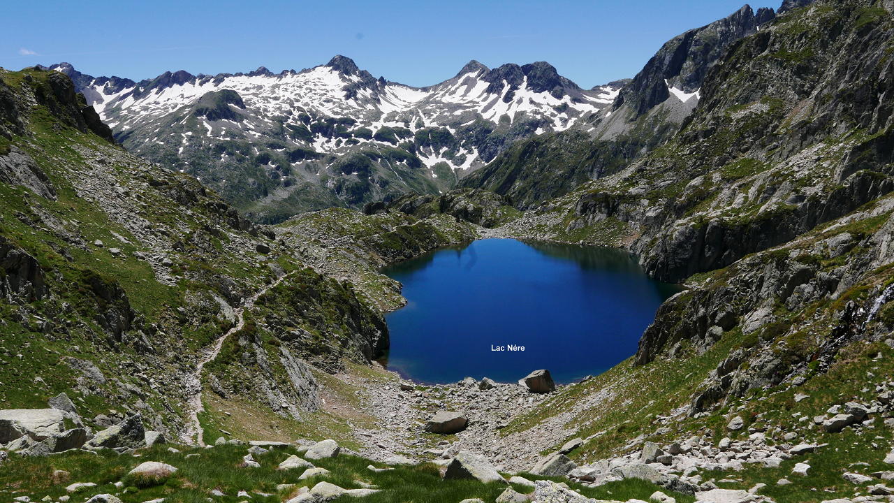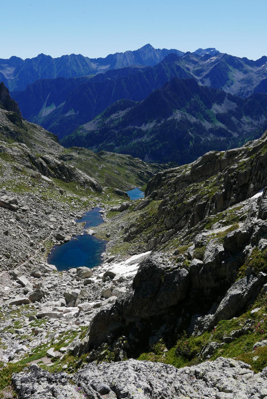 A la bajada sigo con más precisión los hitos, que evitan la chimenea de antes y llevan al colladito (2680m 5h25′), para afrontar el vertiginoso descenso de la canal herbosa. De nuevo en el lac du Pourtet (2422m 5h58′) sigo el camino por su orilla este hacia el sur. Continúo por bloques de granito y desciendo hacia el lac Nère. Hay una bifurcación (2380m 6h26′) que a la derecha irá al Lac de Bassia y yo sigo a la izquierda. Lac Nére (2320m 6h35′).