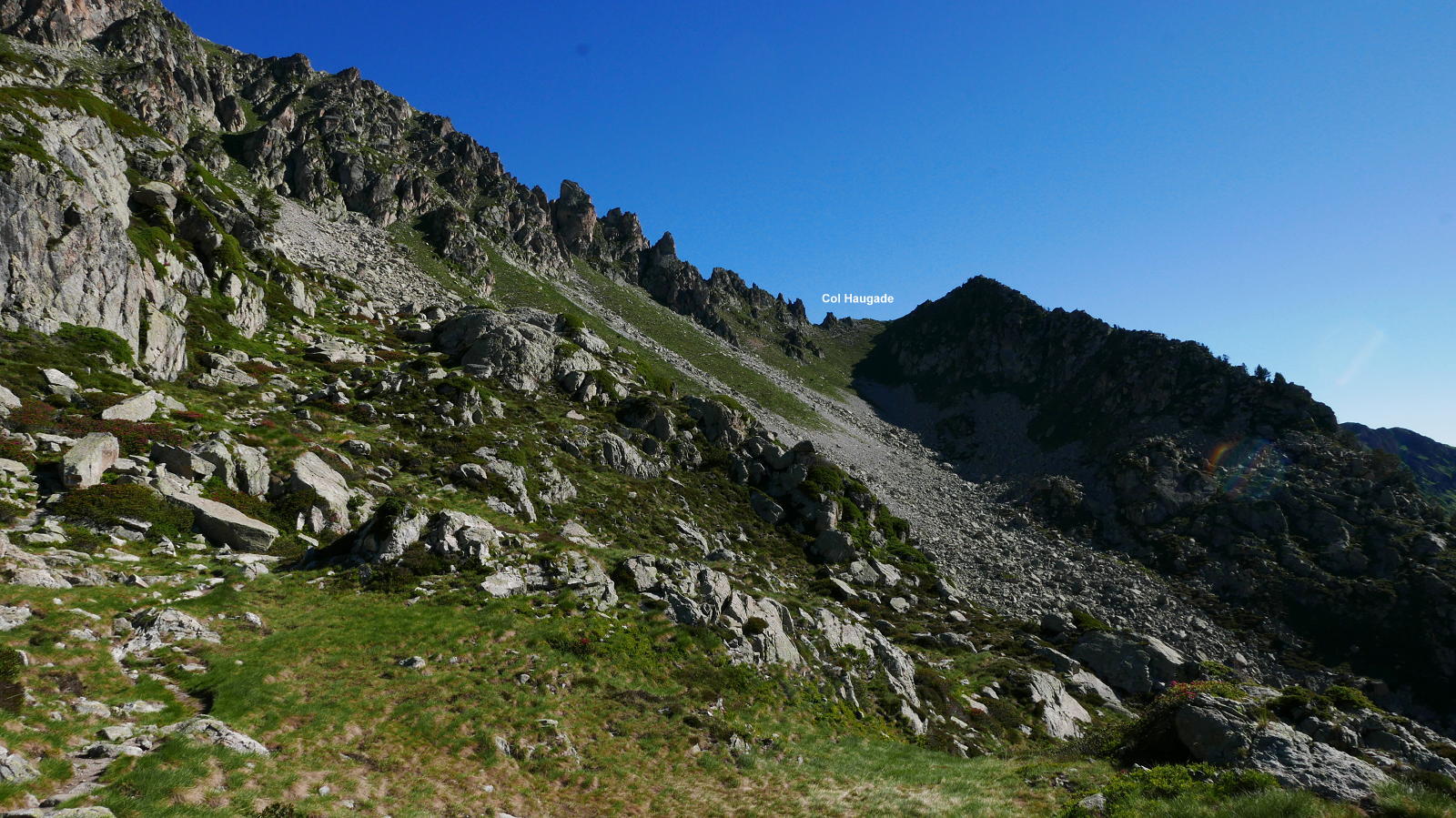 Descripción de la ruta: Refugio d’Ilheou (1998m). El desayuno es a las 7, un poco tarde para mi gusto. La senda va rodeando el lago por la izquierda (este). Después sube con amplios zigzags hasta un colladito (2310m 1h05′) donde una flecha a la derecha indica la dirección al verdadero col de la Haugade (2378m 1h40′).