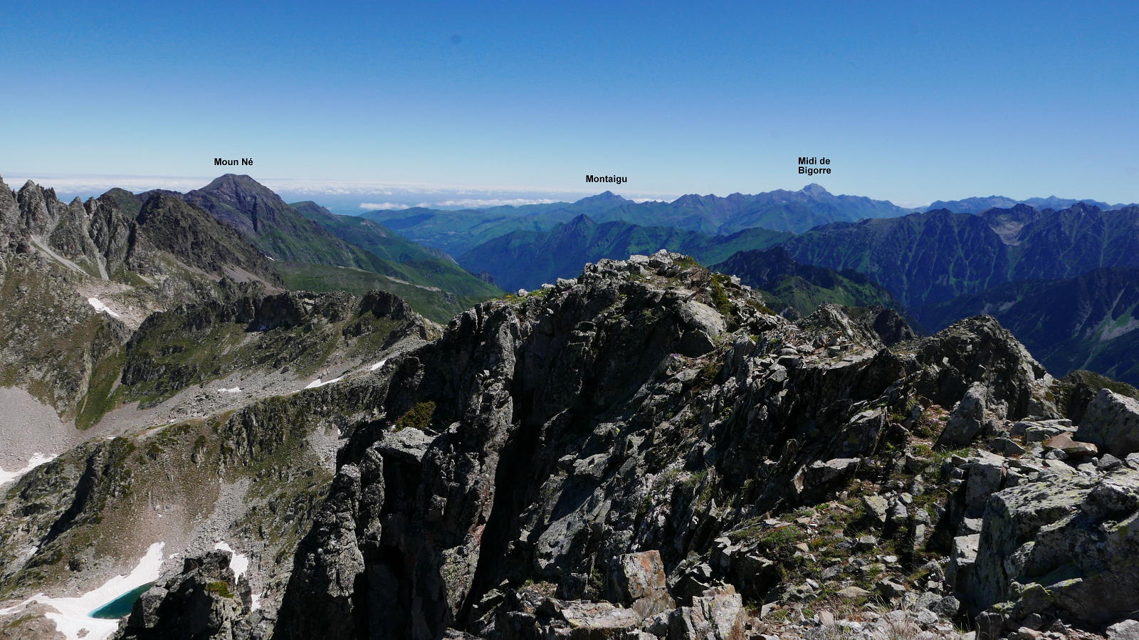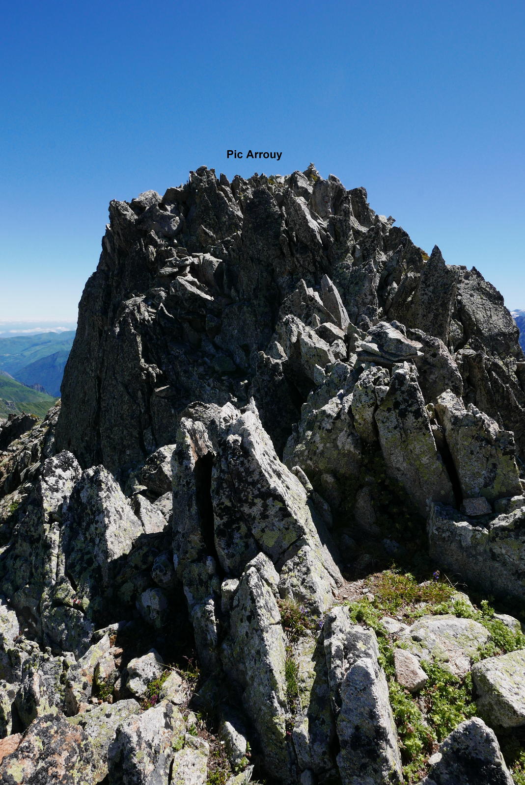 En la subida me desvío antes de llegar a este collado hacia mi derecha, superando una chimenea rocosa y un paso que, por encima del espolón rocoso, da acceso a otra ladera herbosa, también con mucha pendiente, pero no tanta como antes. Esta pala lleva a la cresta rocosa a la que se trepa y, tras superar una brecha después de la antecima, se llega a la cumbre (Pic Arrouy 2785m 4h30′). Me entretengo durante 45 minutos, fotos y almuerzo.