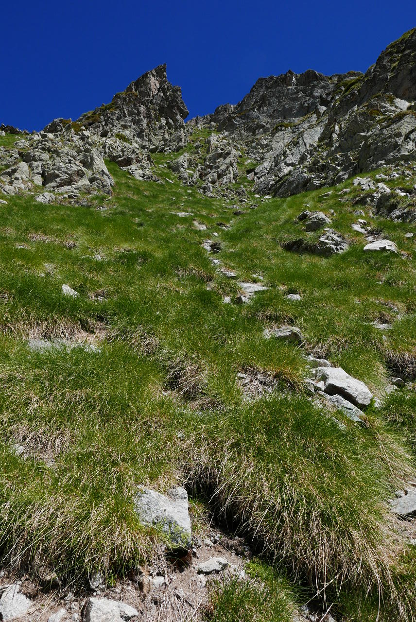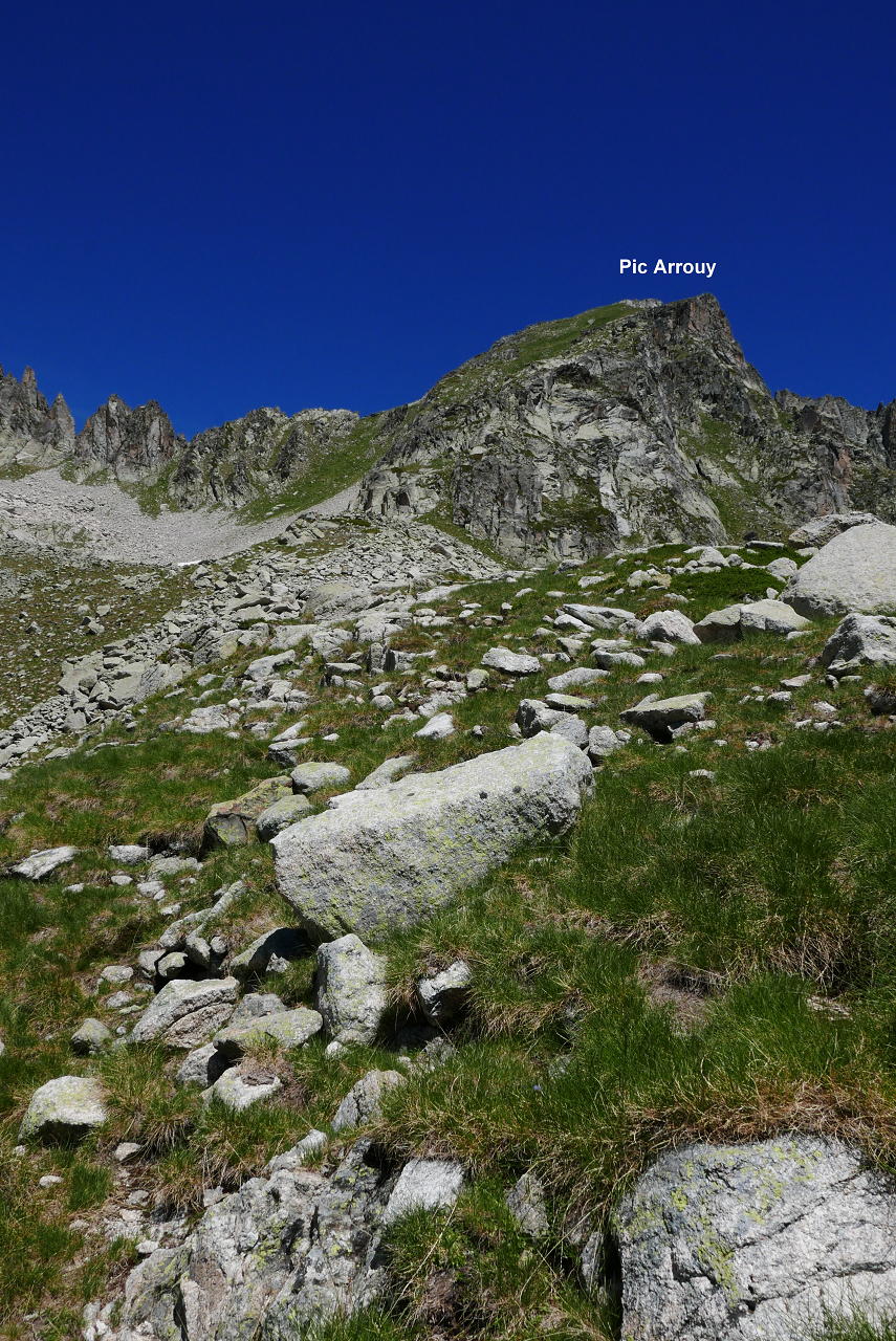 Dejo la senda y me dirijo a la derecha por la orilla del lago, teniendo que abandonar la orilla para subir el lomo herboso a mi derecha donde encuentro hitos. El lomo me lleva a introducirme en una canal herbosa y con pedreras, a la izquierda del espolón rocoso que tengo enfrente. Subo por la derecha de esta canal, pegado a la pared. Tras una parte de pedrera se convierte en canal herbosa con mucha pendiente, que asciende hasta una especie de collado al SW del Pic Arrouy que se continúa hacia la amenazante cresta Aiguilles du Pic Arrouy.