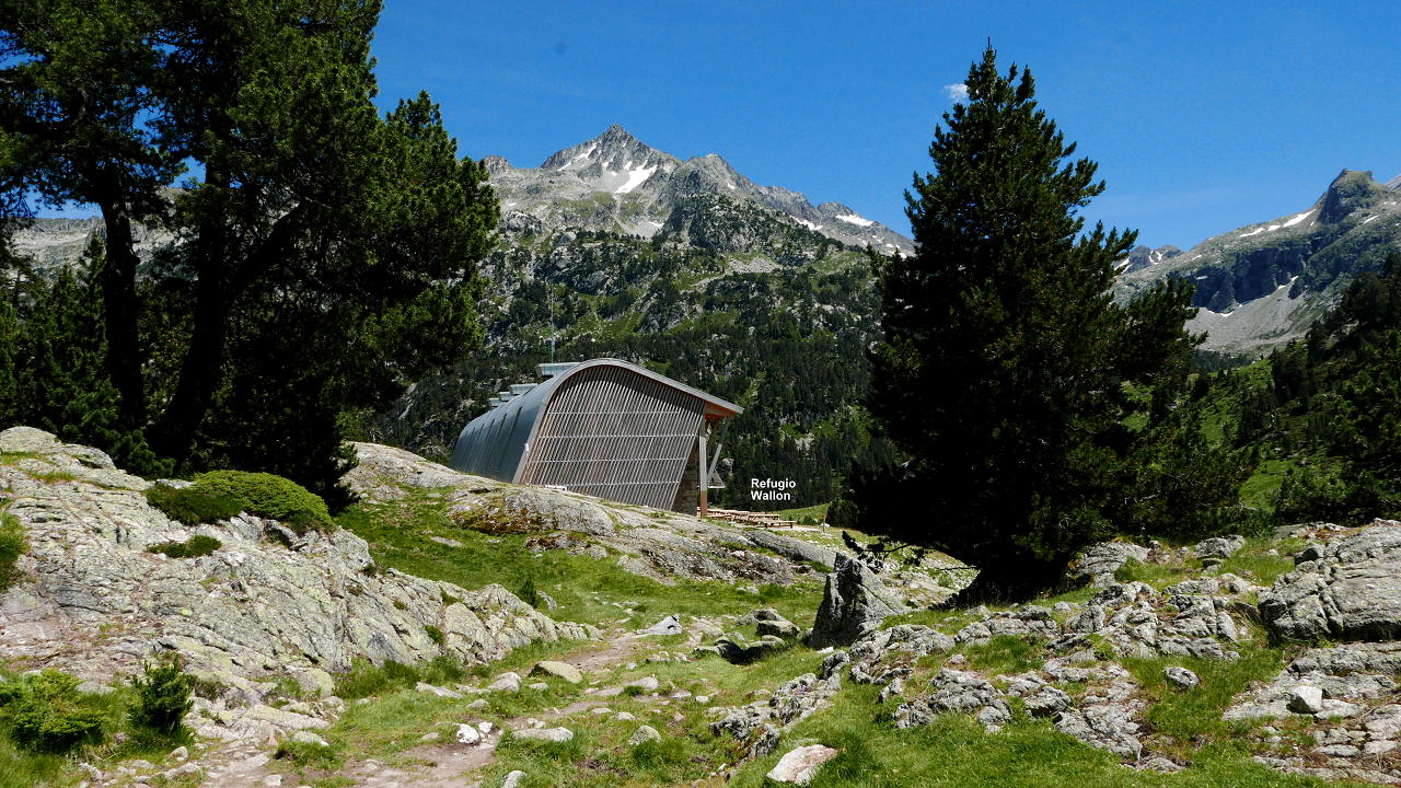 El camino mejora después del lac Nère bajando a un llano herboso llamado Pé det Malh, donde hay un giro a la derecha (2070m 7h20′) indicado con un cartelito. A los pocos metros pasa junto a un poste de medida de innivación. La parte final del descenso es por bosque de pinos. Se agradece la sombra antes de llegar al inmenso refugio Wallon (1870m 7h50′)