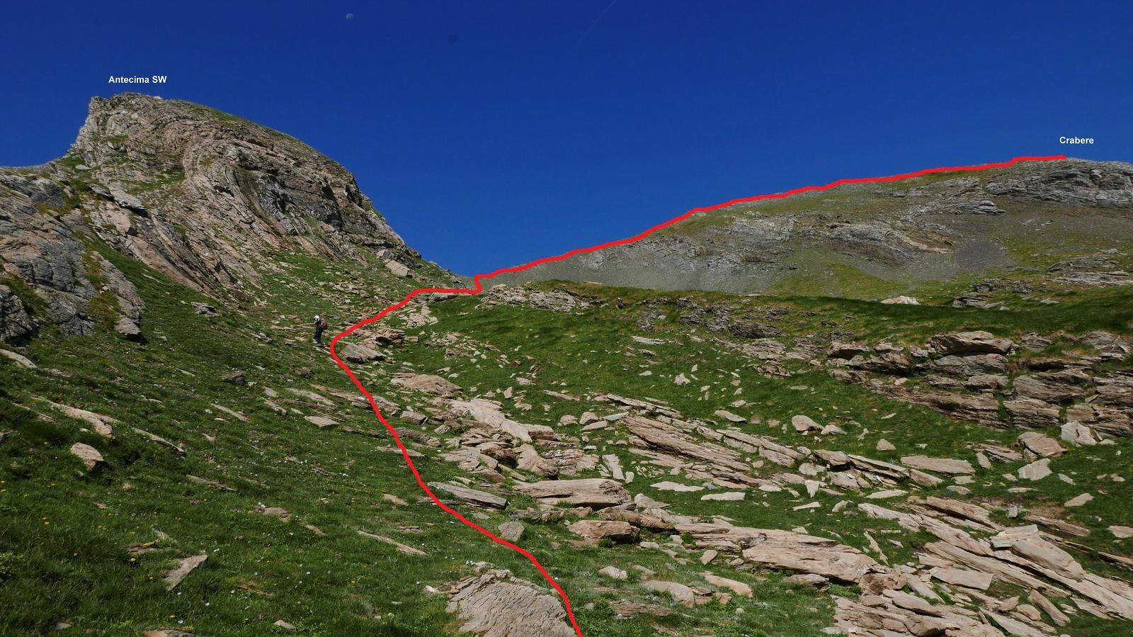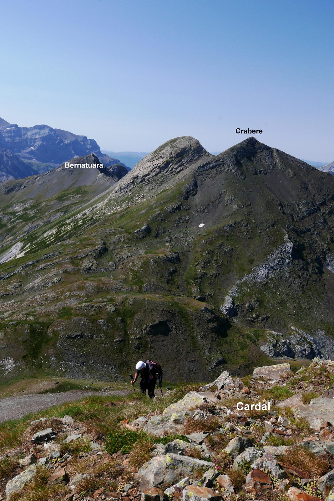 Giramos a la izquierda, también por senda, siguiendo la cresta hacia el WSW al pico Bernatuara (2517m 2h21′). Continuamos la cresta NW al collado de Crapera y faldeamos por el este para evitar la cota 2589. Bajamos por terreno esquistoso hasta zona de hierba y se vislumbra una senda más adelante. Se pasan algunas hondonadas de erosión del agua y, una vez sobrepasada la cota 2589, subida directa por fuerte pendiente pero fácil, por una vaguada que sube al collado a la derecha de dicha cota, más o menos por la izquierda de la vaguada, bastante pegado a las paredes rocosas de mi izquierda. Desde el collado sur del Crapera (2548m 3h02′) subida rápida al pico Crapera (2591m 3h10′).