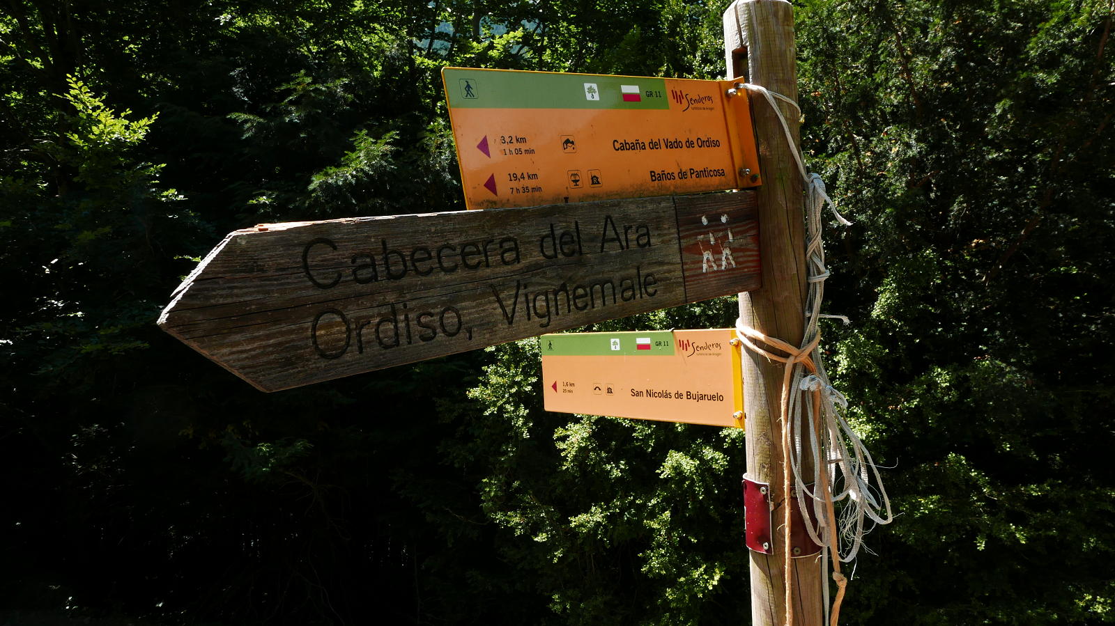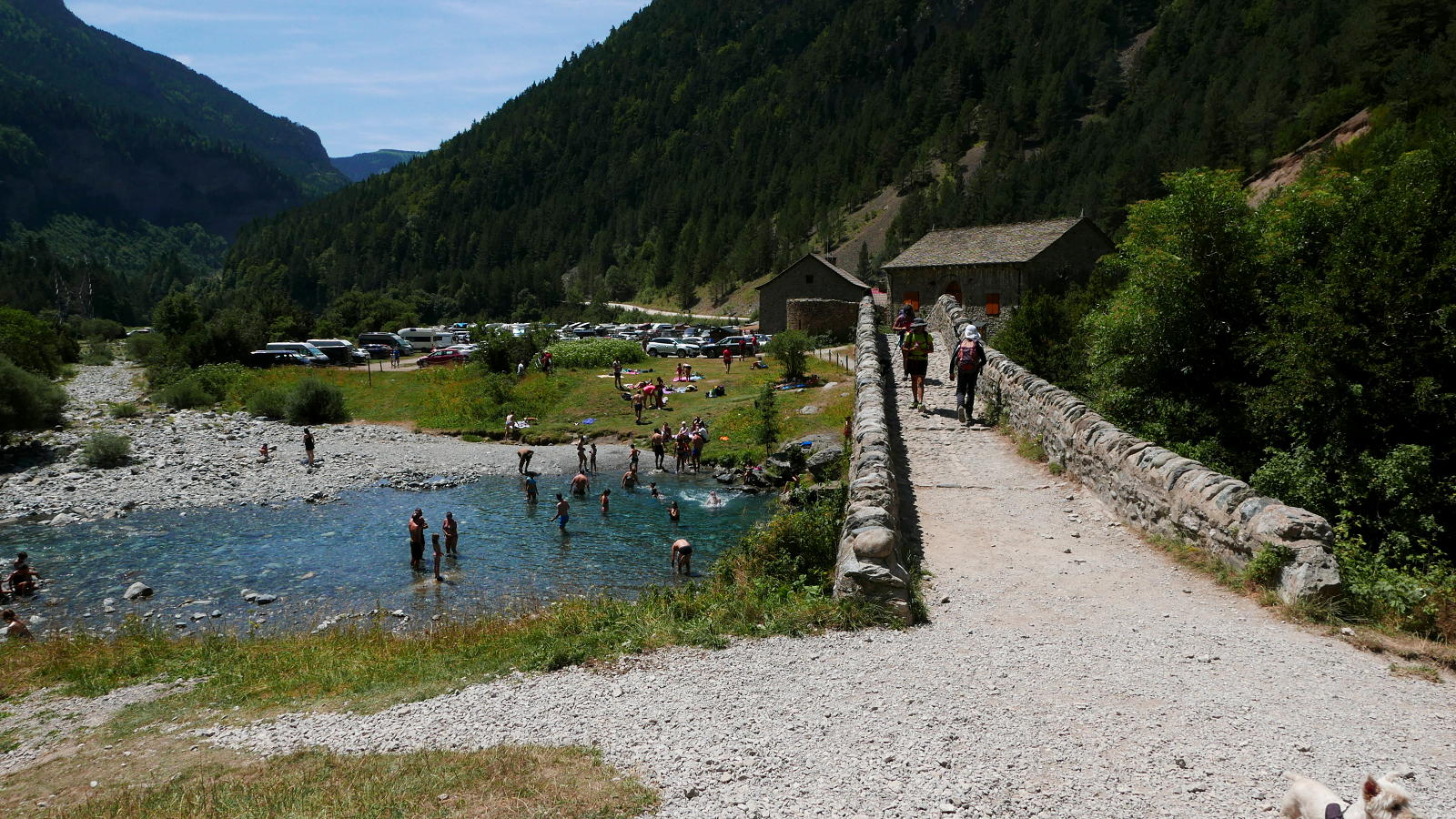 Con alivio llegamos al valle del Ara y tomamos el GR11 (1650m 5h39′), con senda hasta el refugio de Ordiso (1600m 5h50′), donde empieza la pista. La pista se desvía al puente de Oncins y nosotros seguimos senda hasta San Nicolás de Bujaruelo (1330m 6h42′). Después de nuestro solitario recorrido, el último kilómetro de descenso del río Ara y el entorno de Bujaruelo se encuentran saturados de gente bañándose en todas las badinas del cauce.