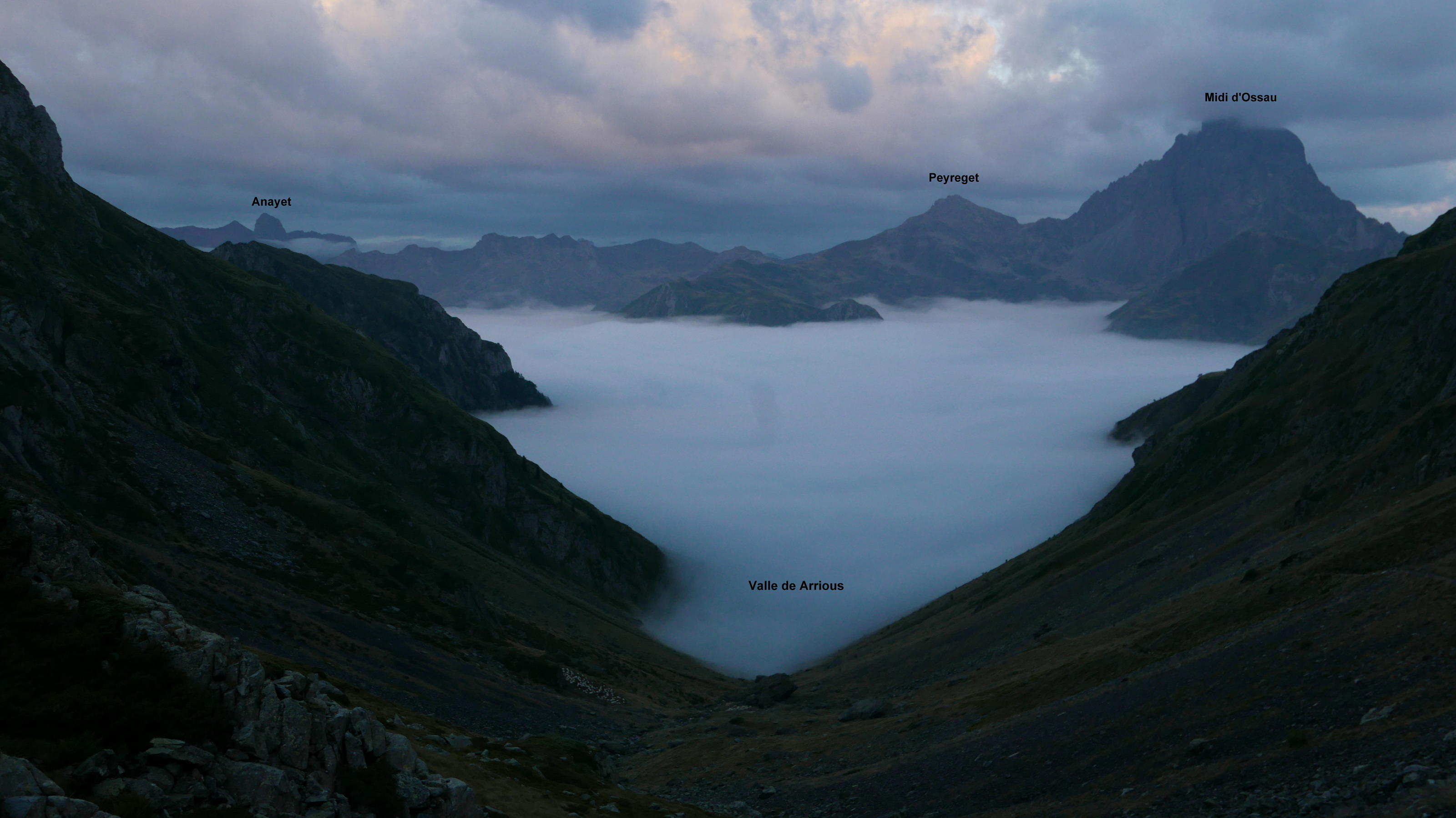 Descripción de la ruta: Caillou de Soques (1430m). Todavía no ha amanecido y el camino se introduce en el hayedo completamente oscuro. La escasa iluminación del GPS me permite avanzar, con un poco de precaución pero sabiendo que es un camino por bosque sin peligro. En unos 10 minutos se sale del bosque atravesando el ruisseau d’Arrious y, ya en campo abierto, tengo suficiente luz. Avanzo por la orilla derecha del río, en subida con pendiente moderada pero constante. La niebla va ascendiendo por el valle pero de momento no me alcanza. El primer punto de referencia es la cabaña de Arrious (1890m 0h44′), con las ovejas en el redil. Oigo ladrar mastines que, por suerte, están en las laderas del otro lado con el ganado que anda por allí suelto.