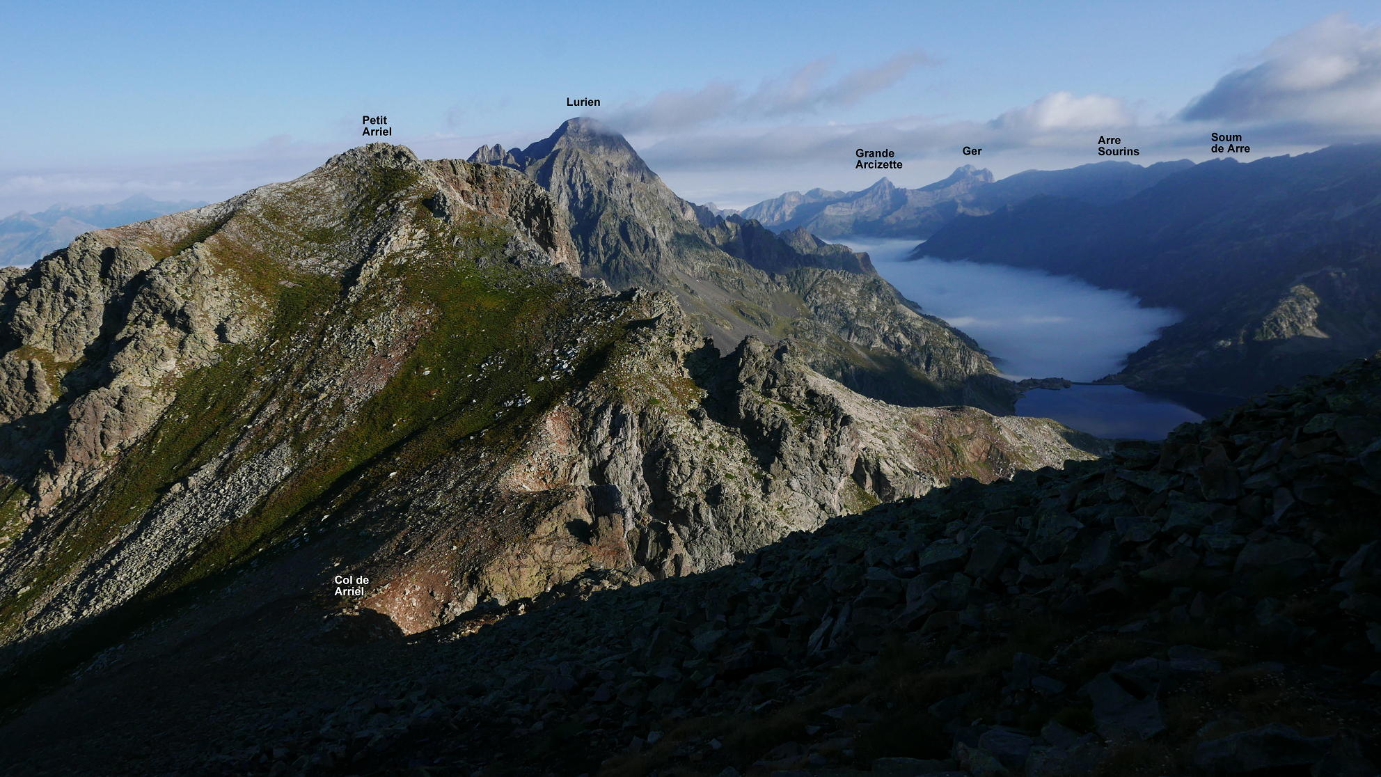 Bajo de nuevo al col d’Arriel (2605m 3h29′) para ascender por la ladera opuesta (NNW) por senda y al final un paso de trepada (Pequeño Arriel 2683m 3h40′). Tenía la idea de continuar la cresta para bajar por el Lac d’Arrious al col d’Arriuos, pero parece que hay algunos pasos comprometidos que decido finalmente no afrontar y desciendo por el mismo sitio que he subido.