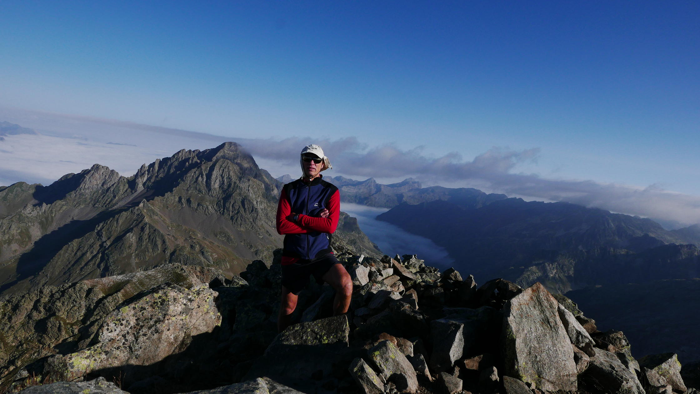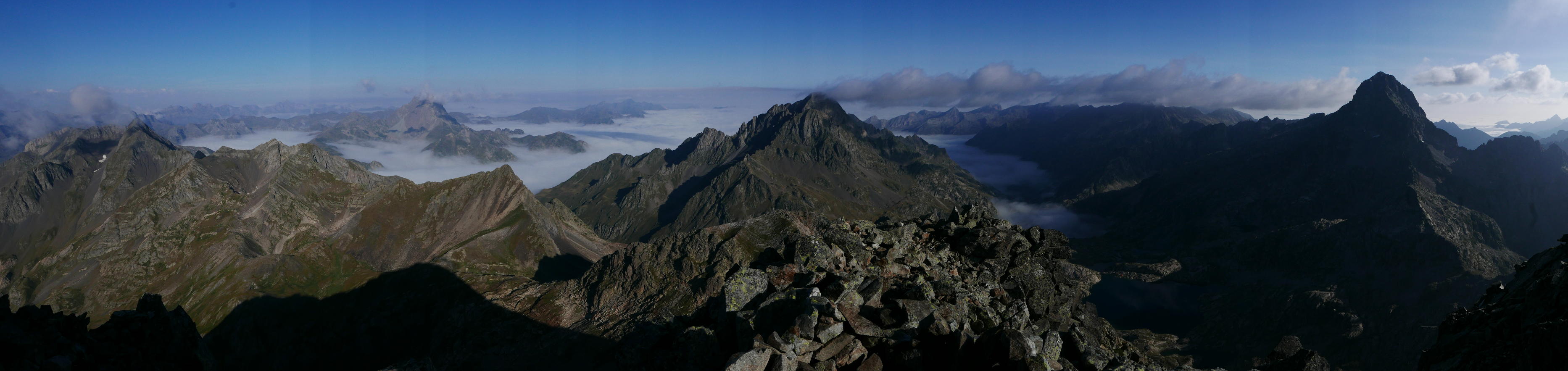 La caída hacia el lado francés es impresionante. La arista NNW del Arriel se ve dasafiante. Hay traza de senda entre la pedrera, a la derecha de la cresta. Al final hay que ir trepando por la arista rocosa, trepada fácil (I/II) y poco expuesta, aunque con la roca húmeda debo asegurar los pasos para no resbalar. Siempre hay hitos que no pierdo hasta la cima del Arriel (2824m 2h47′).