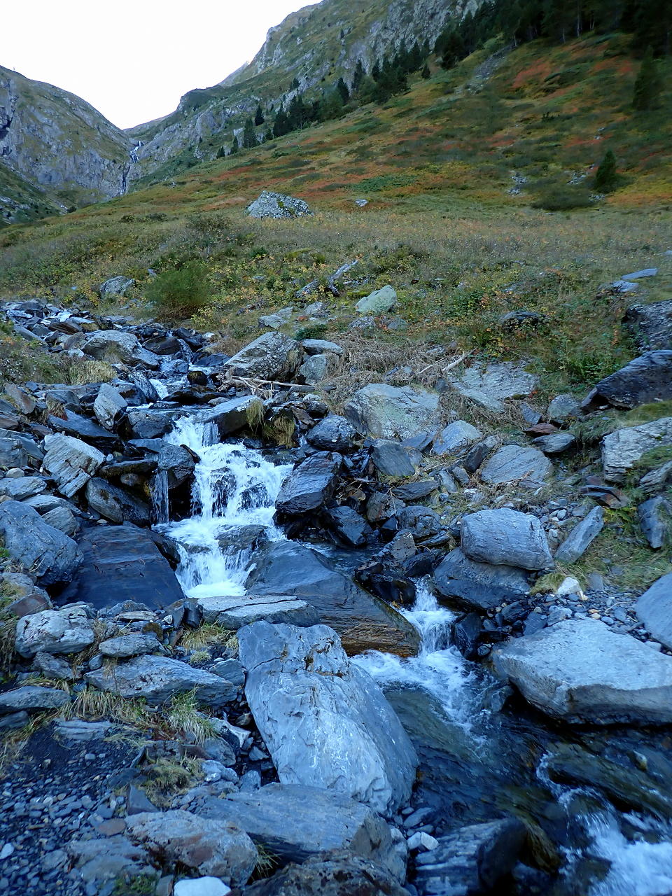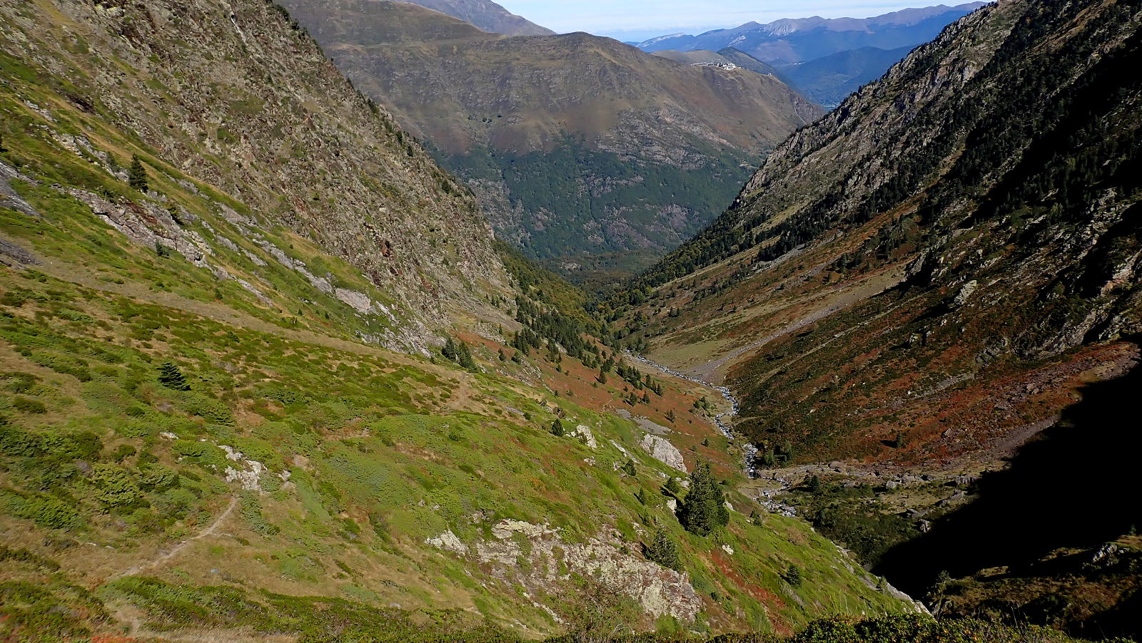 Se va saliendo del bosque a zona de vegetación herbácea con matorral de rododendro y enebro. Cruzamos el río Lassas (1625m 0h37′) pasando a la orilla izquierda. Vamos alcanzando altura por encima del río para pasar un resalte rocoso, el Pas de Sarroues. Avanzamos a media ladera hasta que volvemos a juntarnos con el cauce cerca de un punto en que se puede seguir la orilla derecha o la orilla izquierda (2330m). Continuamos por la orilla izquierda pero bajaremos por la derecha.