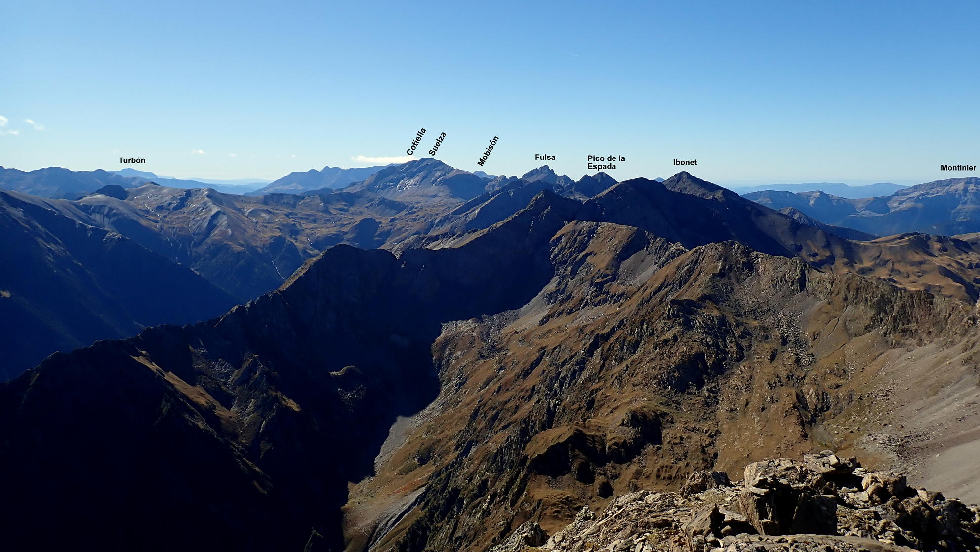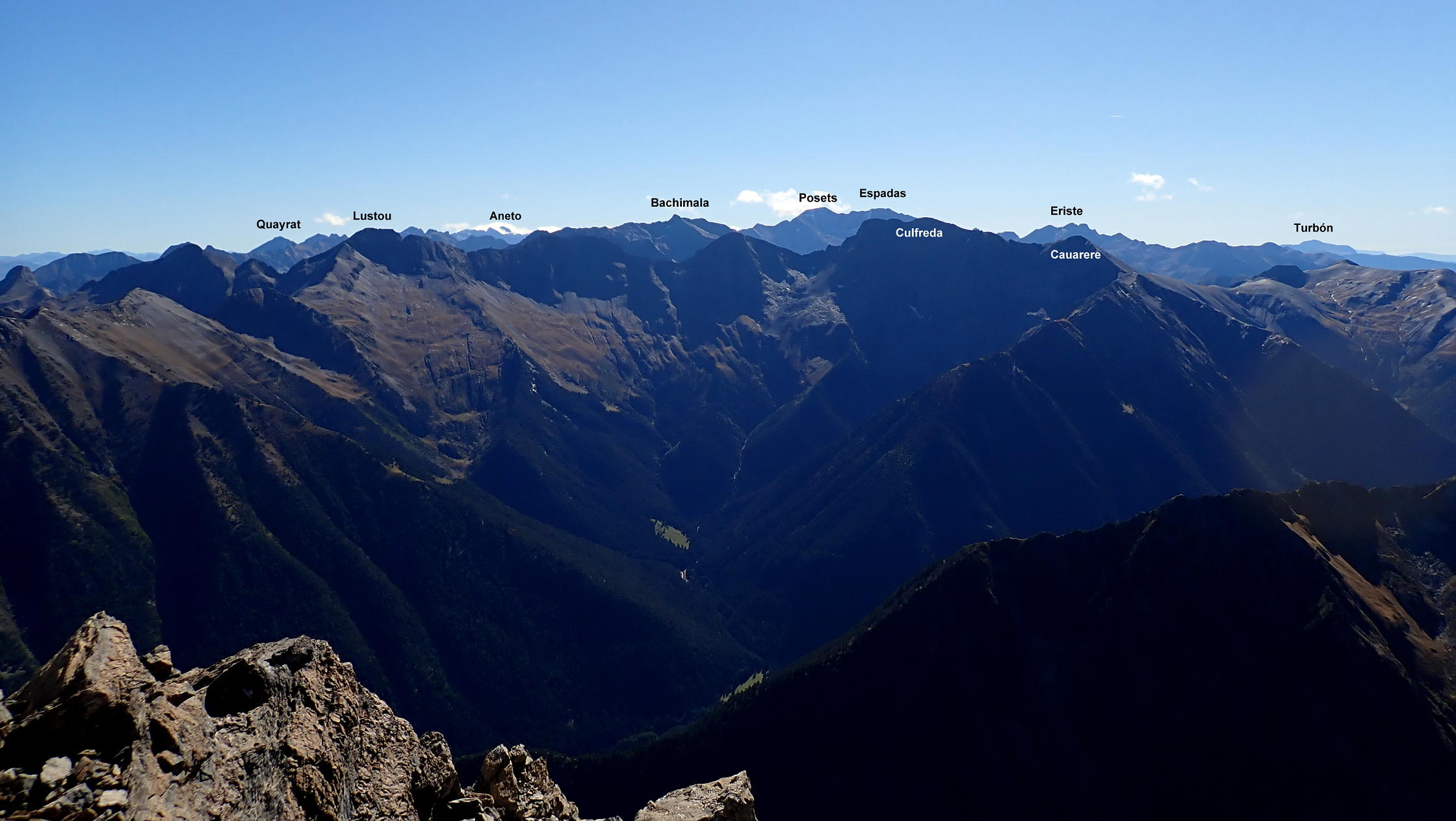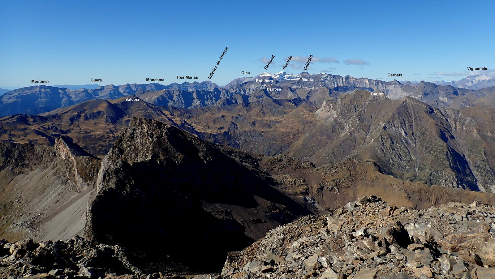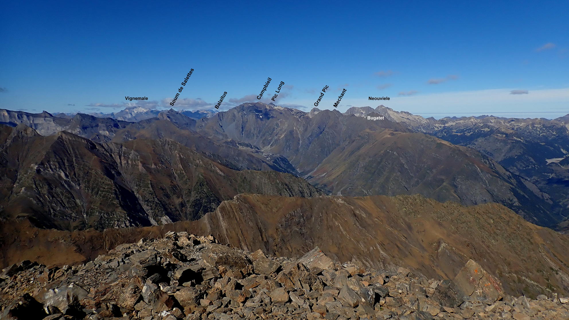 Tenemos que atacar la ladera esquistosa a nuestra izquierda. La huella es bastante clara y avanza cerca de la cresta pero por la izquierda (vertiente oeste). La caída por la vertiente contraria es de gran verticalidad. No lejos de la cumbre encontramos paredes rocosas. La pared queda rota por una chimenea por la que asciende Josan, pero yo he leído que en este punto es mejor pasar a la vertiente este y subir por unos pasos escalonados más fáciles. Así que por esta otra vía alcanzo la cima del Aret (2935m 3h16′). La panorámica nos ofrece un buen puñado de tresmiles.
