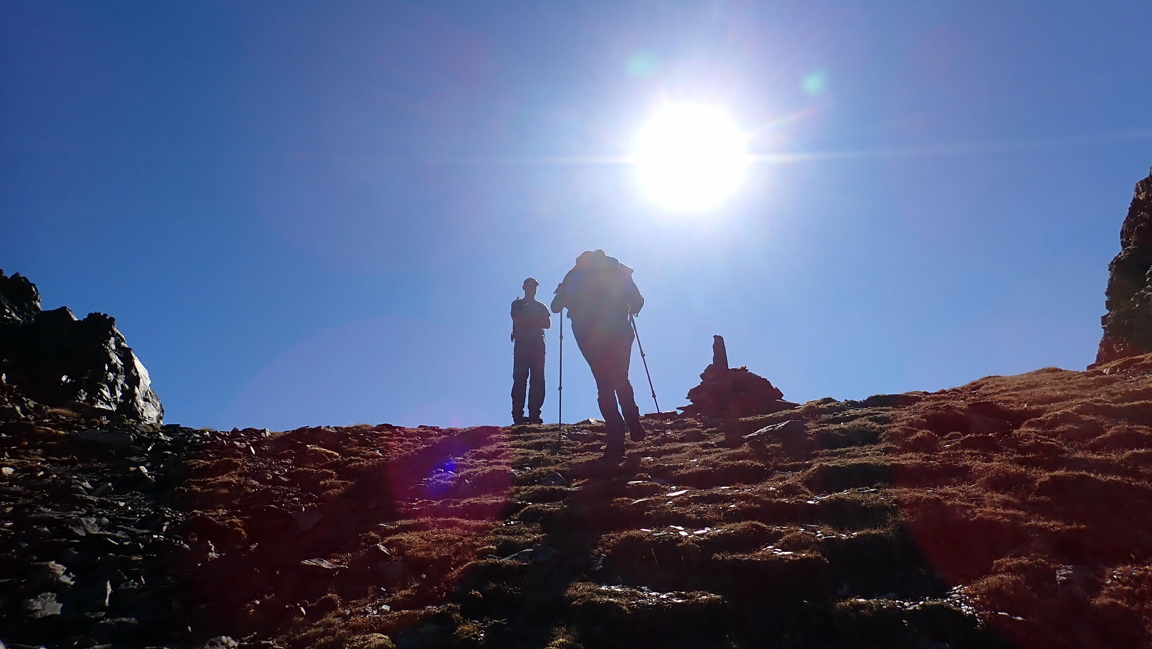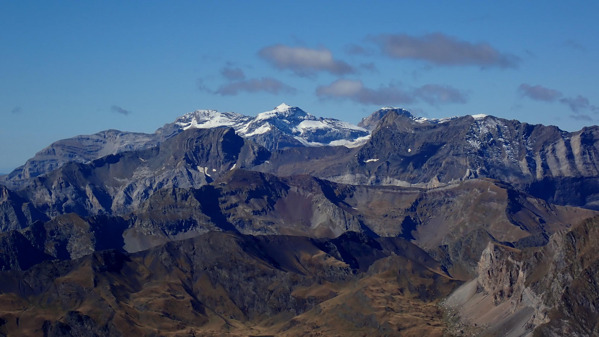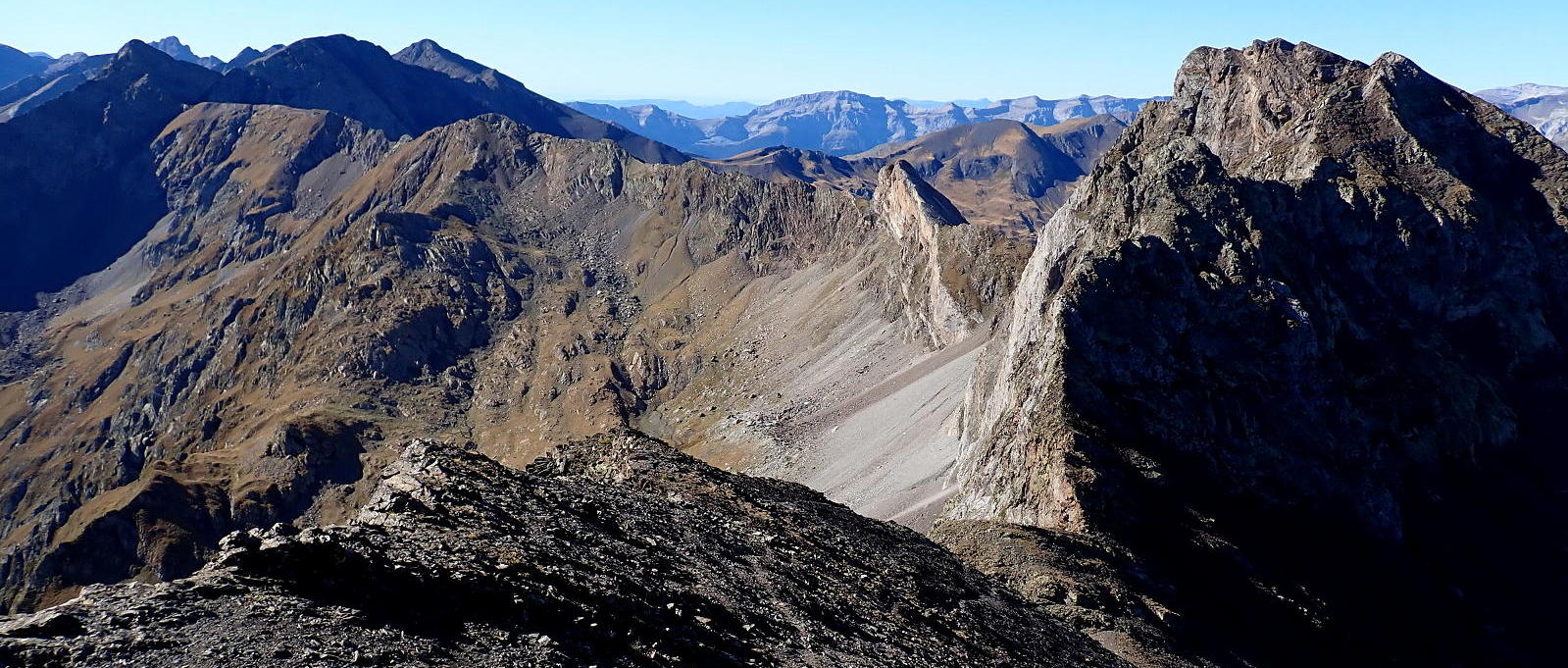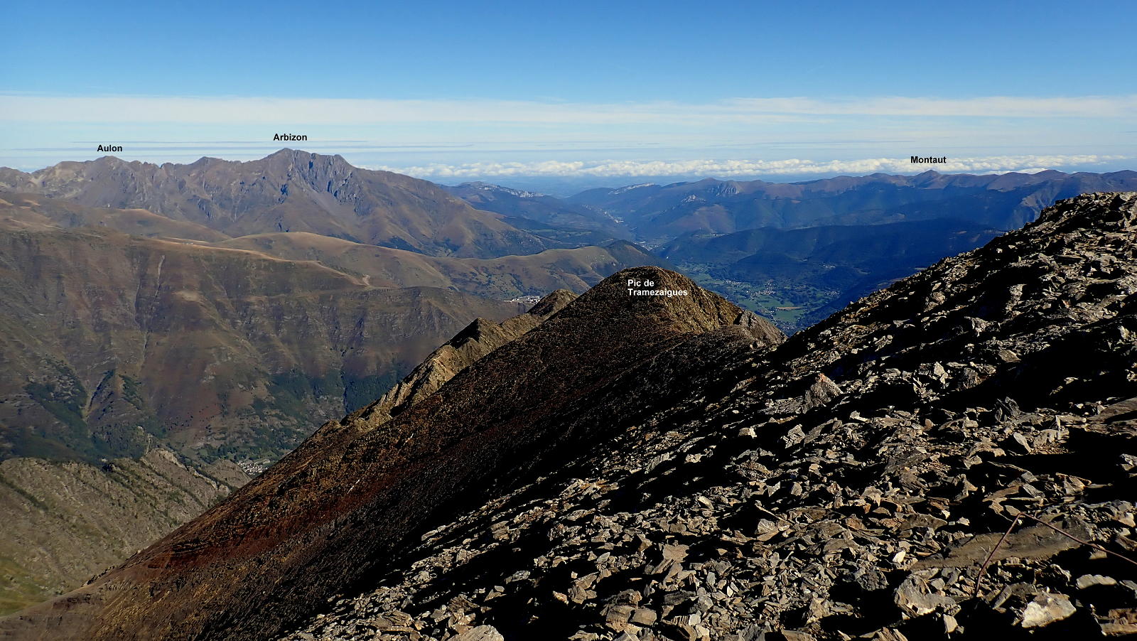 Tenemos que atacar la ladera esquistosa a nuestra izquierda. La huella es bastante clara y avanza cerca de la cresta pero por la izquierda (vertiente oeste). La caída por la vertiente contraria es de gran verticalidad. No lejos de la cumbre encontramos paredes rocosas. La pared queda rota por una chimenea por la que asciende Josan, pero yo he leído que en este punto es mejor pasar a la vertiente este y subir por unos pasos escalonados más fáciles. Así que por esta otra vía alcanzo la cima del Aret (2935m 3h16′). La panorámica nos ofrece un buen puñado de tresmiles.
