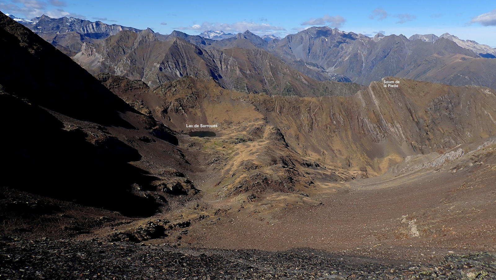 Seguimos así remontando el valle hasta el resalte que da paso a la cubeta del lago Sarroués (2530m 2h25′). Sin llegar al lago giramos a la izquierda (ESE) ascendiendo por la vaguada que lleva al collado, ya a la vista. El terreno empieza a ser un poco más pedregoso, pero el ascenso es fácil al collado entre el Aret y el Sarroués (2689m 2h47′).