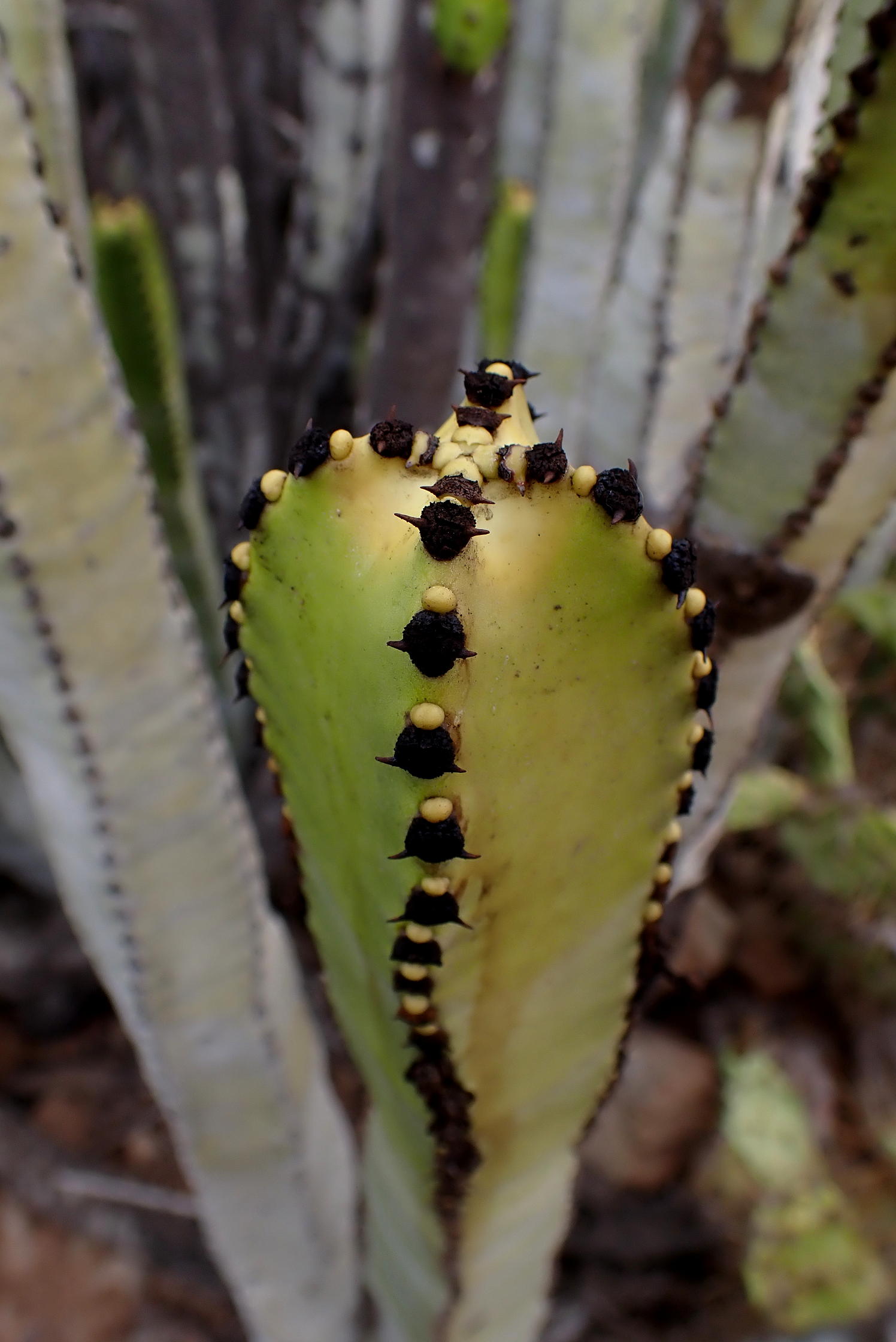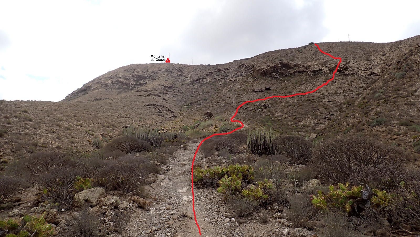 Descripción de la ruta: KM 8 (148m). Parece que hay un pequeño sendero y decidimos atacar la ladera norte de la Montaña de Guaza directamente por él, pero se desdibuja enseguida y tenemos que ascender con esfuerzo por pedregales y chumberas, zonas antiguamente aterrazadas sin ningún tipo de senda.