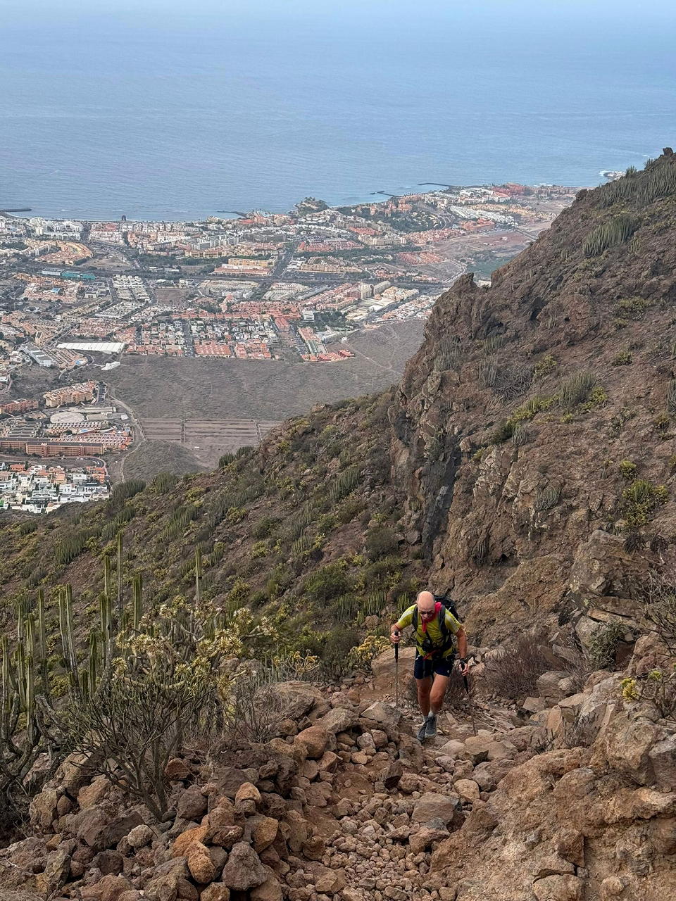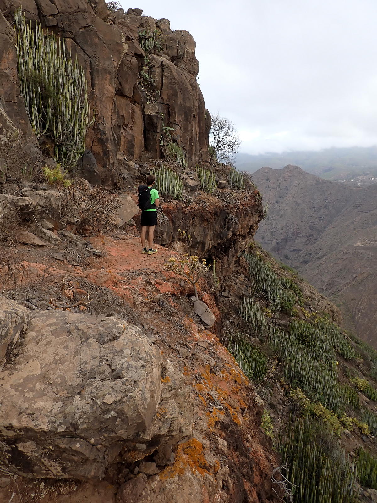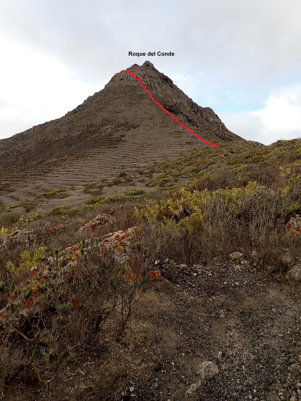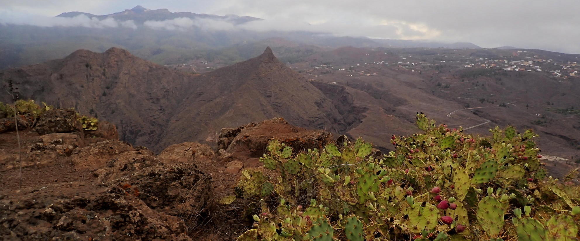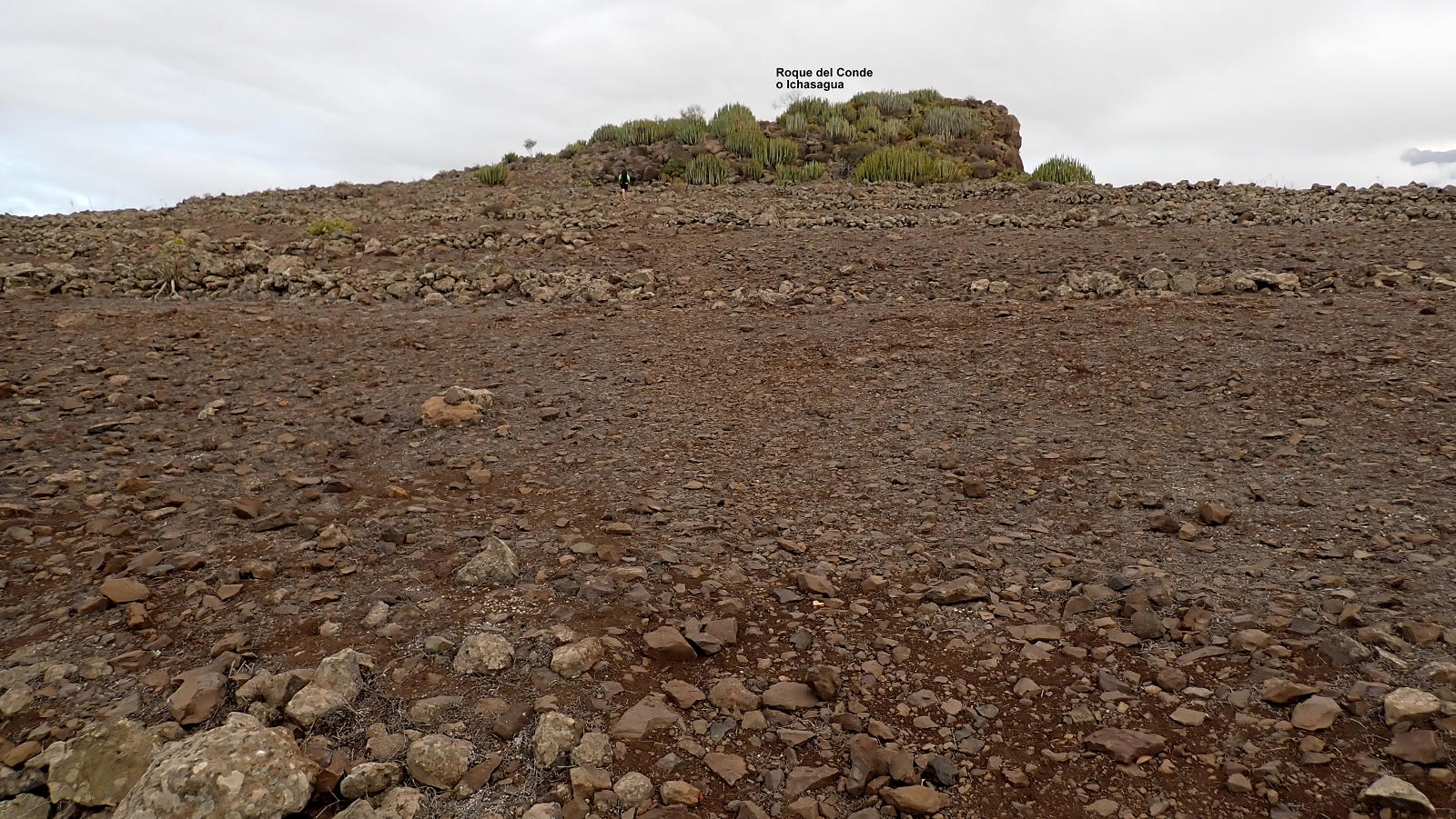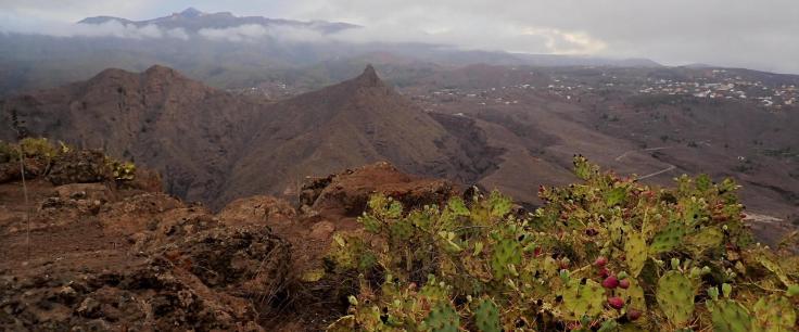 Ahora ya es una subida constante hasta atravesar el lomo sur del Roque del Conde y pasar a la otra vertiente (vertiente oeste). El camino sigue siendo bueno pero deja de estar empedrado. Asciende por esta ladera oeste rodeando el Roque del Conde por la izquierda hasta que al final tiramos recto a su cumbre, que es como una meseta con un vértice geodésico entre los cardones canarios. Roque del Conde (1002m 0h56′). Es un día nublado y brumoso con muy mala luz para la fotografía.
