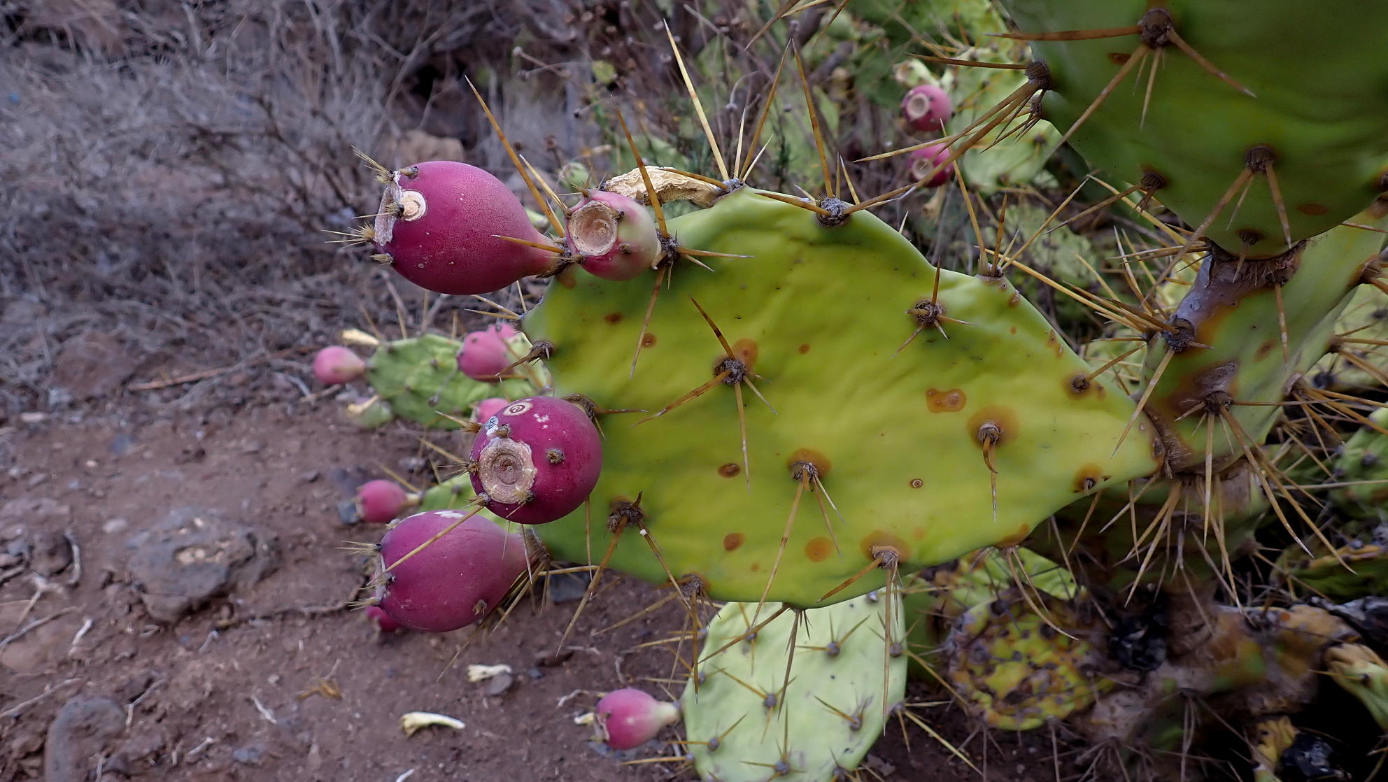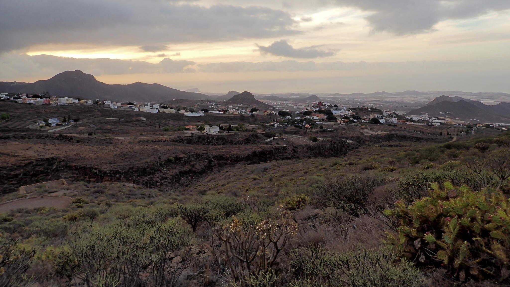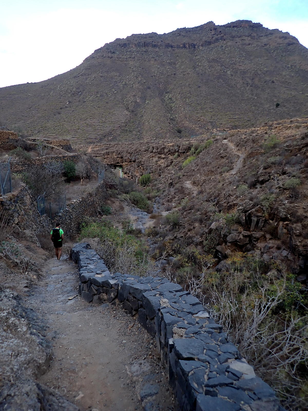 Después vamos por un lomo suave, un poco confuso, entre chumberas y cerca del barranco de Ancón a nuestra izquierda. Llegamos a una presa (Charca de Ancón 705m 3h17′) sin agua embalsada. Algo más abajo tenemos que girar a la derecha por encontrar una alambrada. Cuando termina la verja volvemos a girar a la izquierda pasando por los bancales de una plantación de vides. Para llegar al punto de confluencia con la subida hay que sortear otra verja y nosotros lo hacemos avanzando sobre los muretes de cemento de una acequia. Desde el punto de confluencia (635m) estamos obligados a bajar al barranco y subir finalmente al barrio de Vento (645m 3h34′)