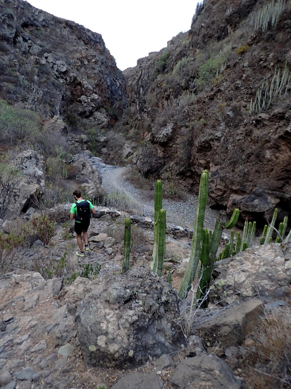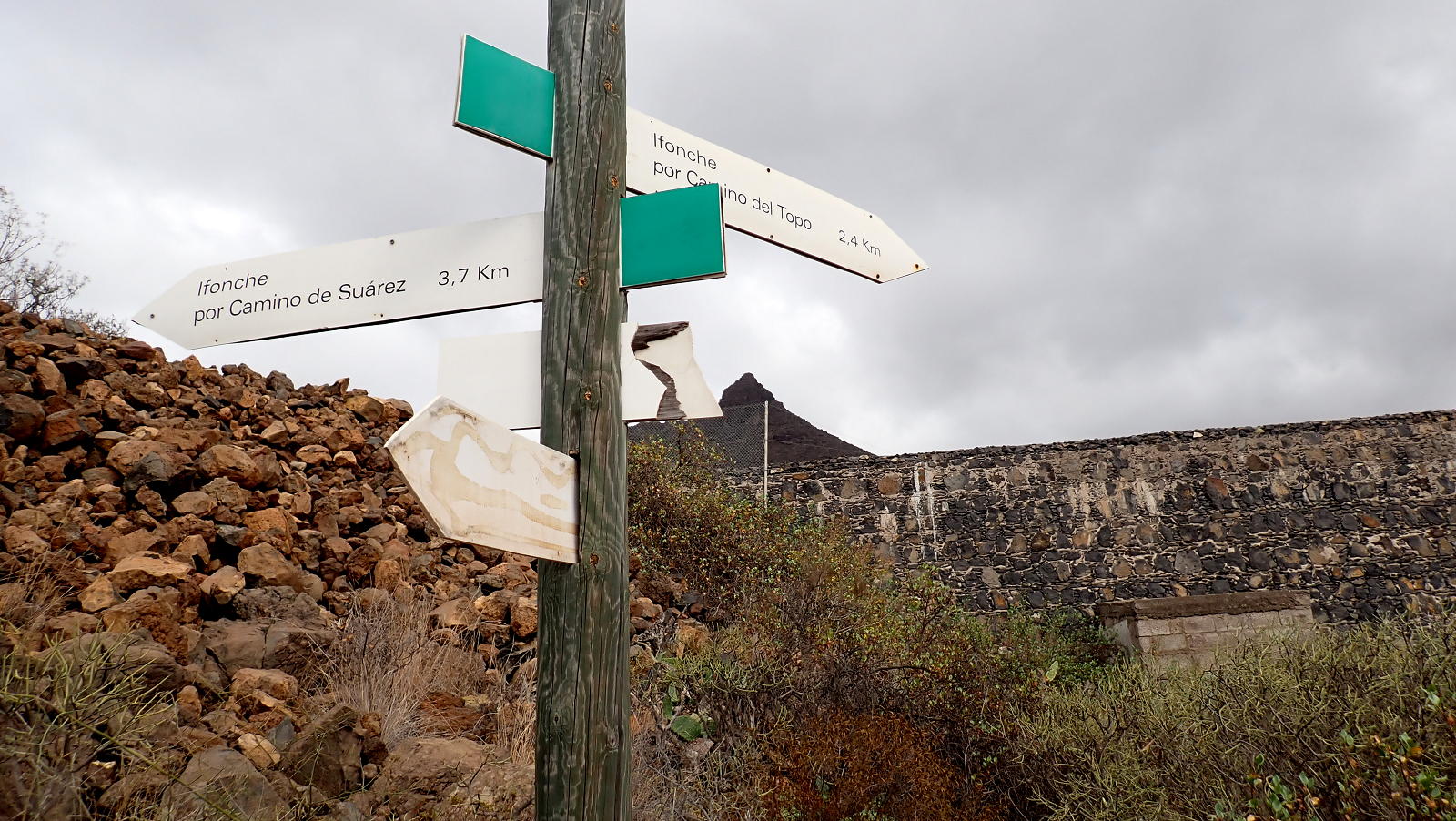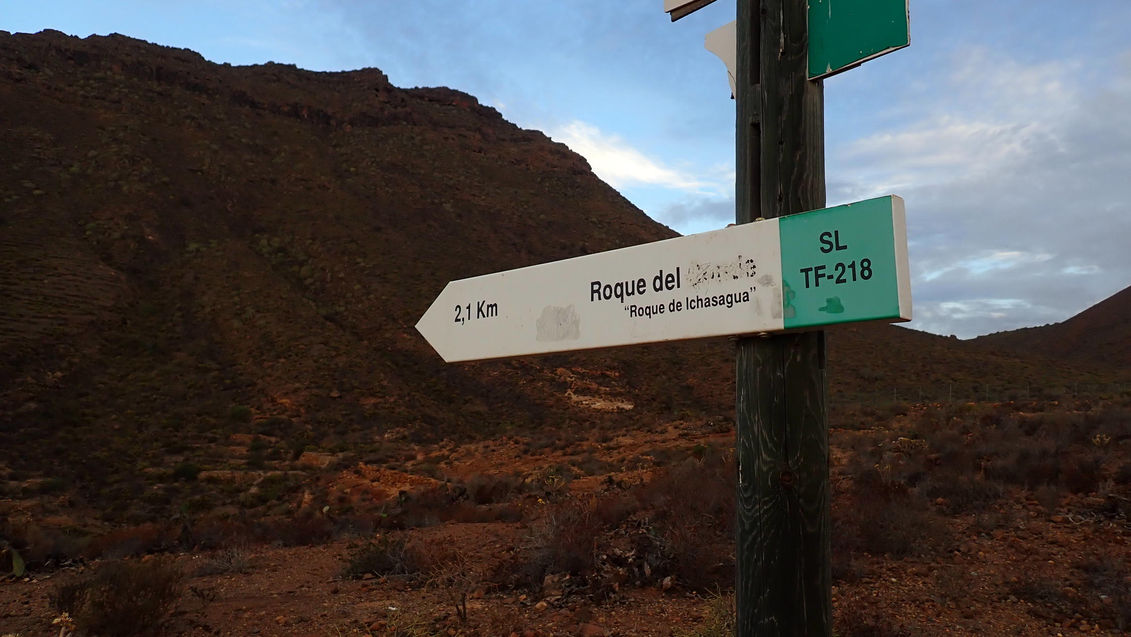 Descripción de la ruta: Vento (645m). El camino baja atravesando primero el barranco de las Casas e inmediatamente el barranco del Ancón. Tras atravesarlo un cartel que indica «Roque de Ichasagua SL-TF-218» (635m 0h06′) será el punto de confluencia de la ruta de bajada. Volvemos a descender para cruzar el barranco del Rey. El camino está marcado con pintura verde y blanca y empedrado.